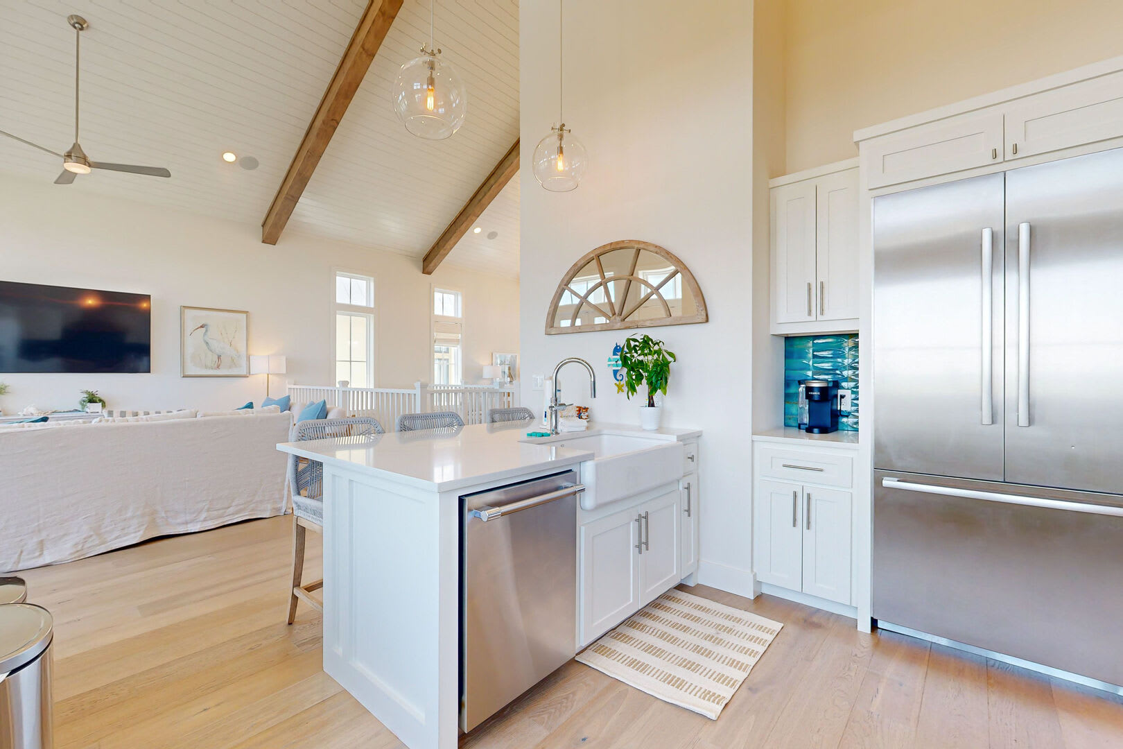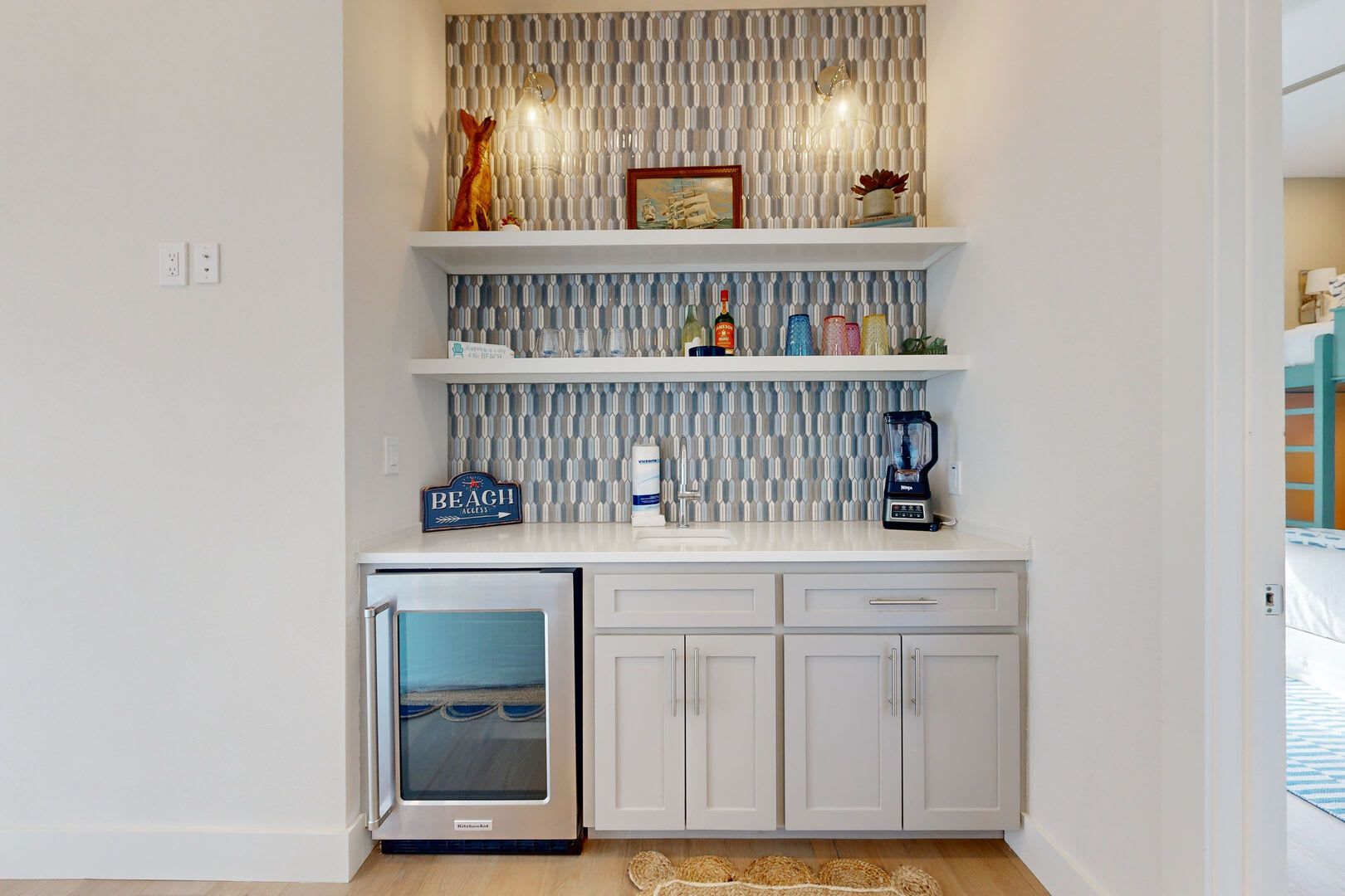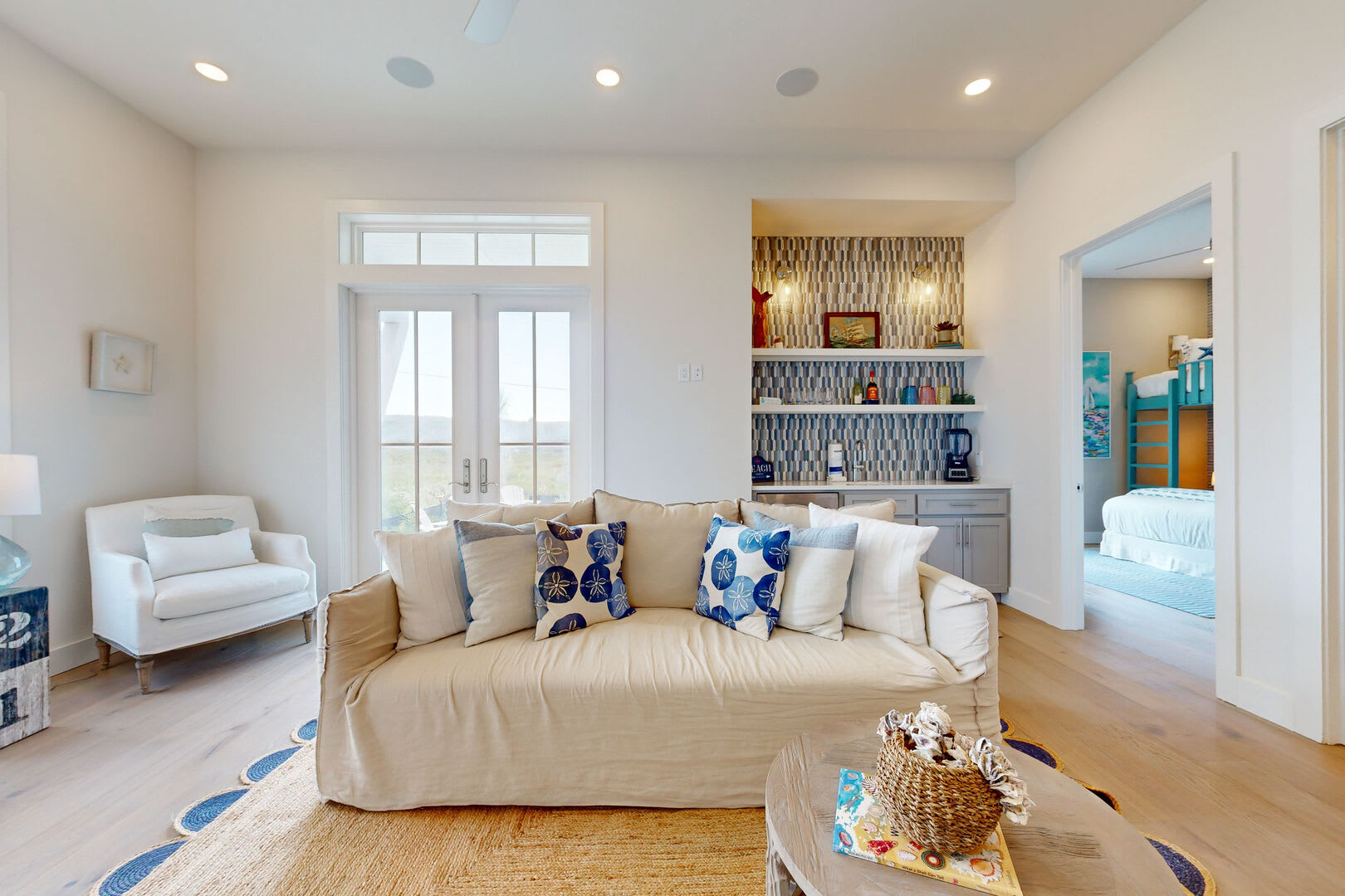 The first level offers a cozy living area complete with a TV and a beverage fridge, ideal for relaxing evenings after a day at the beach. This level also features a bunk room, perfect for accommodating extra guests or family members.