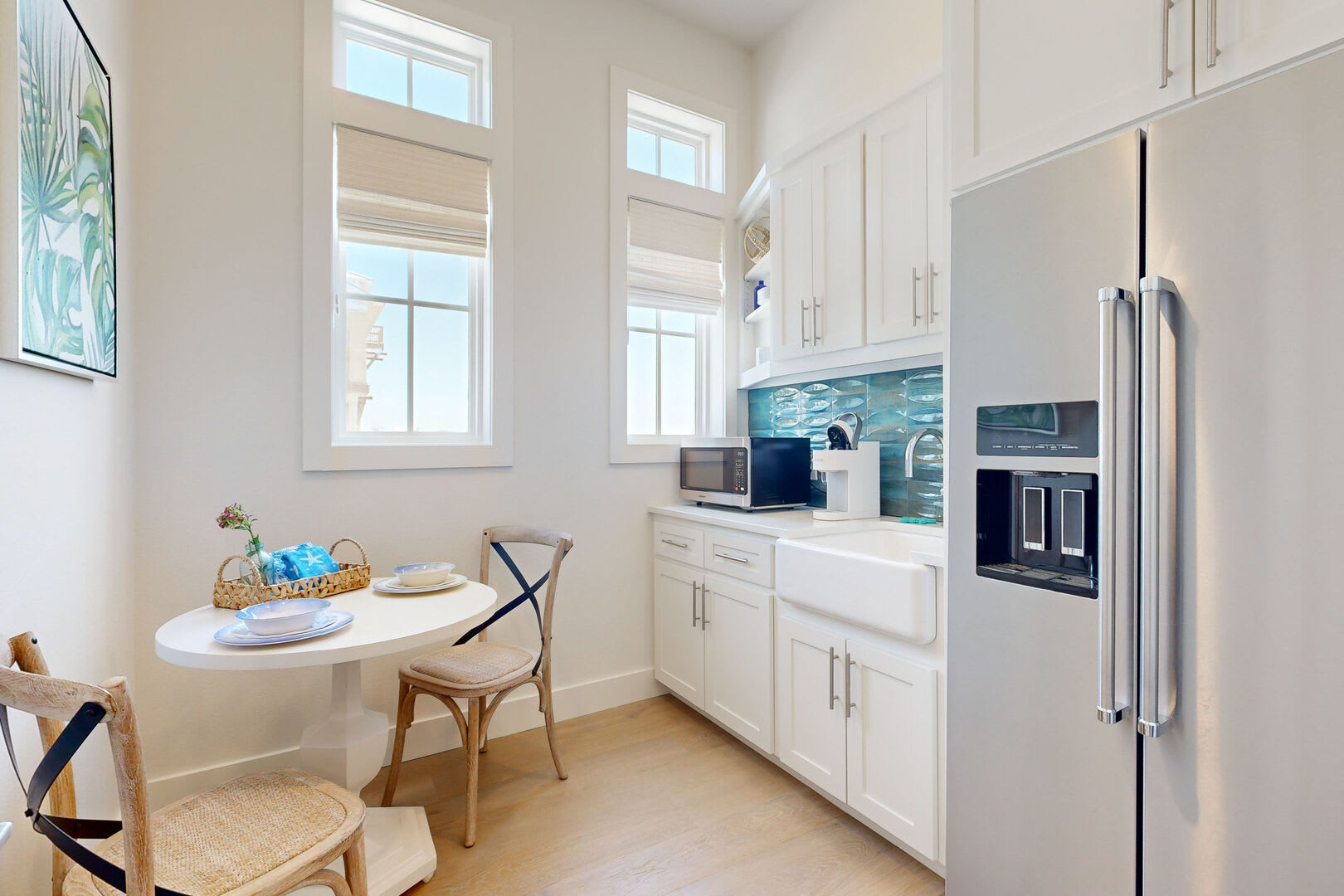 On the second level, you will find three generously sized bedrooms, along with a compact kitchen that includes a regular-size refrigerator, sink, microwave, and drip coffee maker—perfect for preparing quick meals or refreshments.