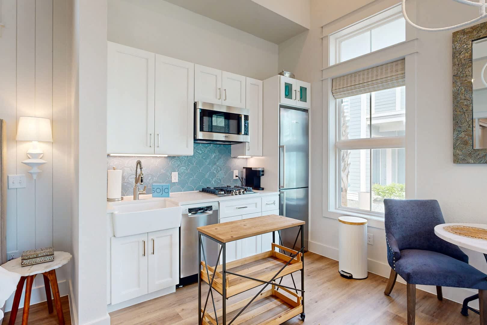 The kitchenette, equipped with a gas cooktop, dishwasher, microwave (convection oven), and refrigerator, invites you to indulge in culinary adventures. Meanwhile, the convenience of an in-unit washer and dryer means more time savoring the sands and less worrying about the spills of day-to-day life.