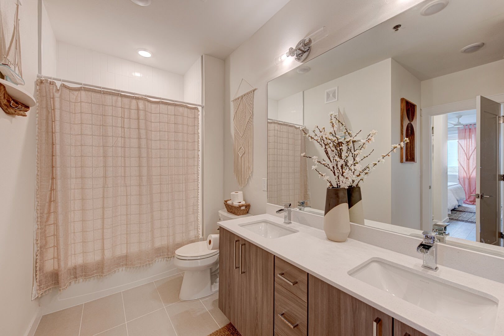 The upscale bathroom boasts breathtaking décor with a light airy feel that creates a sensual spa atmosphere. Double vanities in the bathroom will have you feeling like royalty.