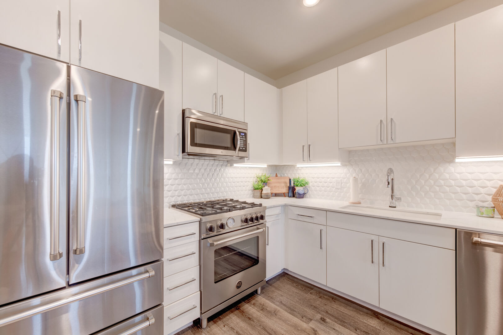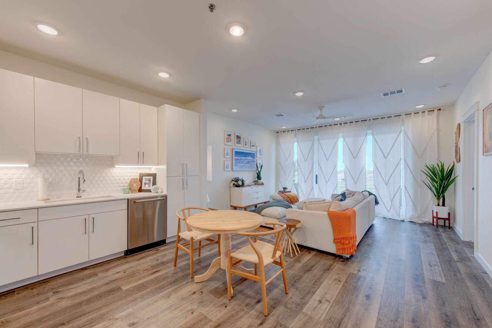 The stunning kitchen is perfectly equipped to prepare fresh, coastal meals, with high-end stainless-steel appliances, white cabinetry, and beautiful countertops. The dining table and two chairs provide ample seating to enjoy mealtimes together.