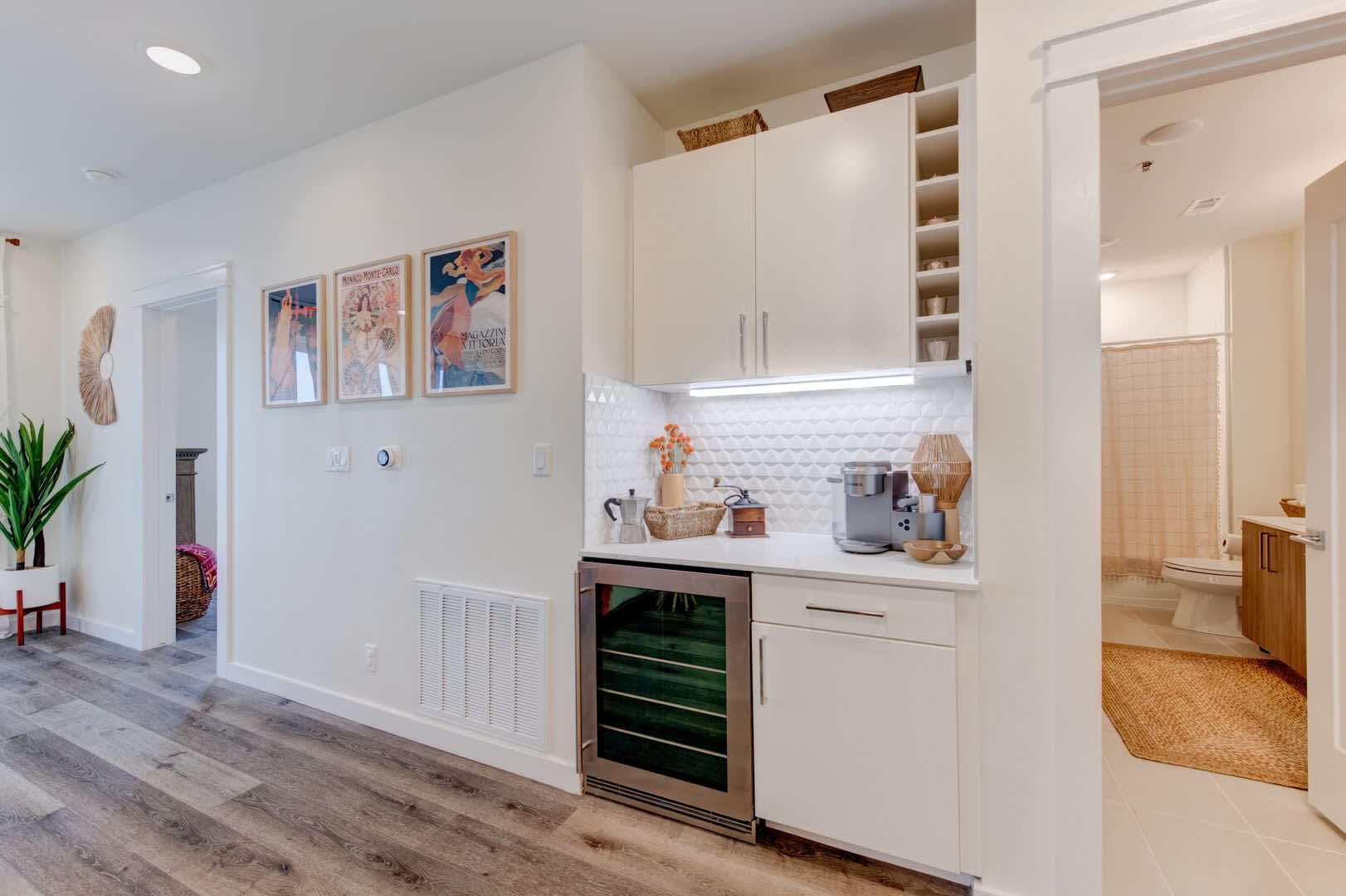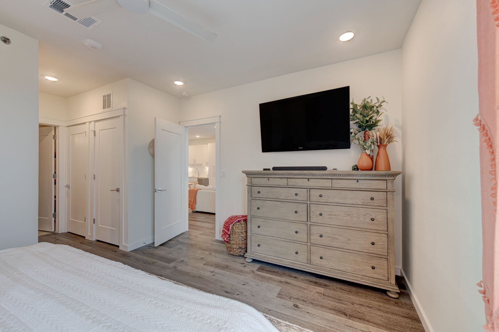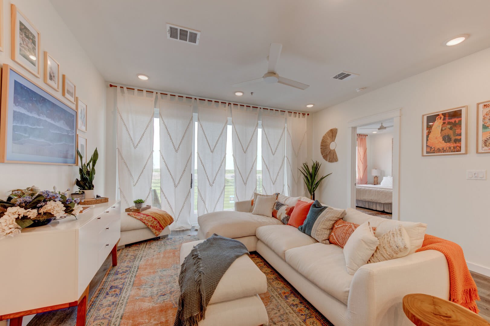 An elegantly furnished living area and luxurious furniture await inside the entryway. Guests will love settling in for a cozy movie night in front of the Frame Art Samsung, flat-screen television or enjoying the sunset over cocktails from your private patio.