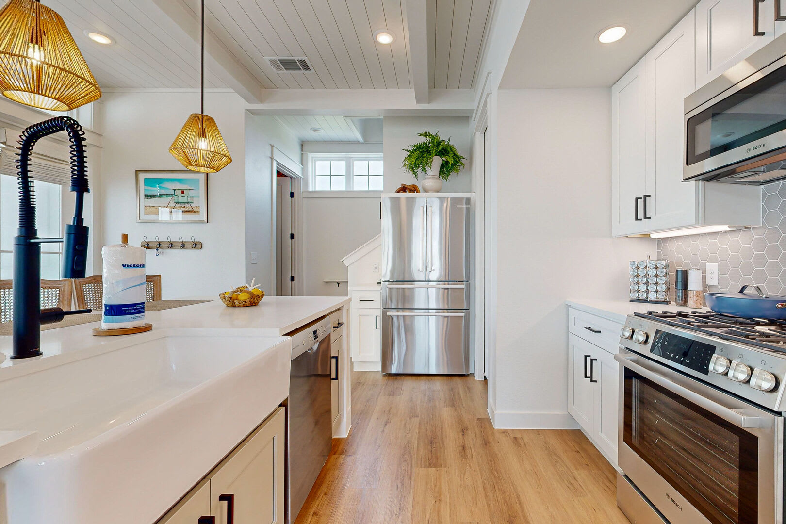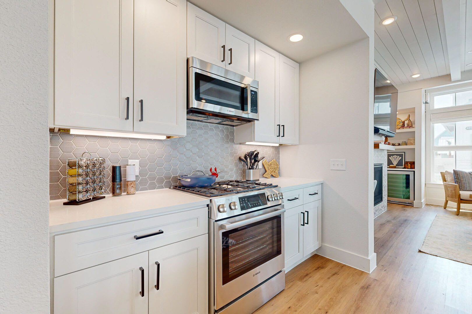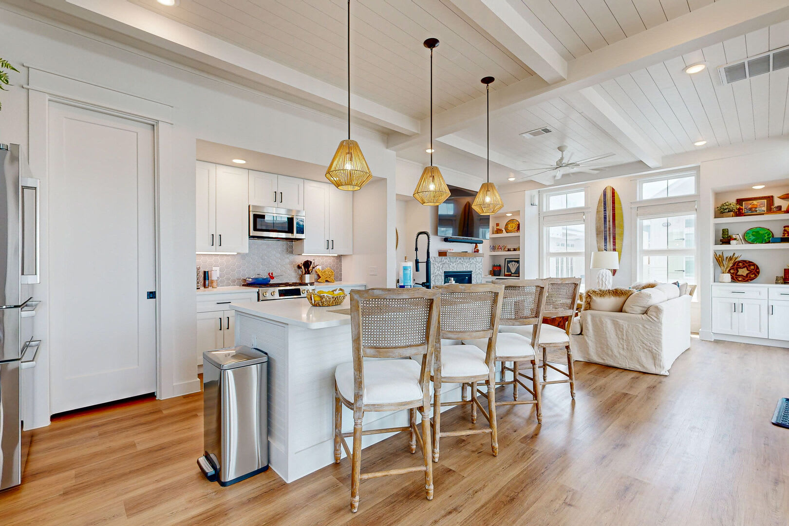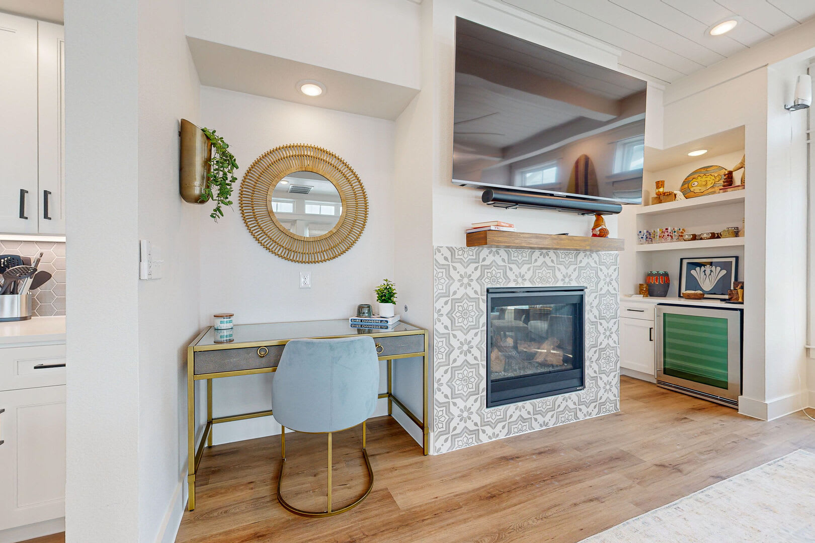 On the first level, you'll find an inviting open floor plan that seamlessly blends the main kitchen, dining, and living areas. The fully equipped kitchen boasts stainless steel appliances and an extra beverage fridge, perfect for creating delicious meals and refreshing drinks. Need to catch up on work? The living area features a built-in desk with a comfy chair to ensure productivity while you enjoy your getaway.