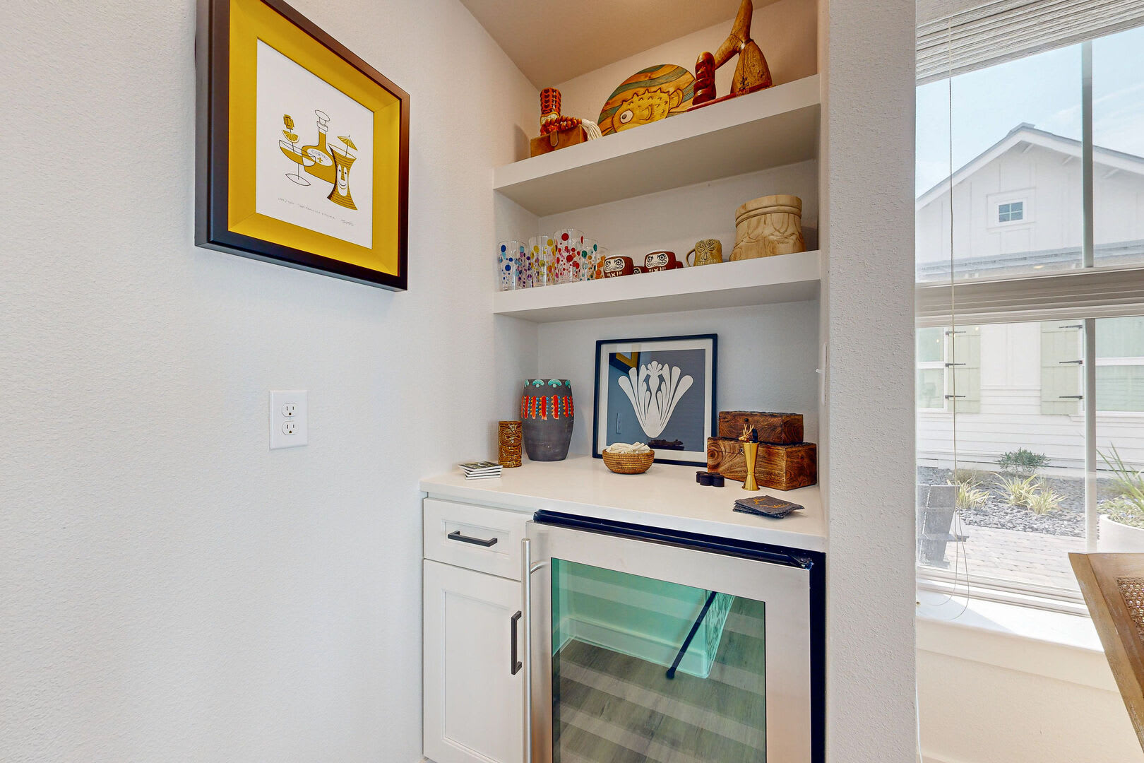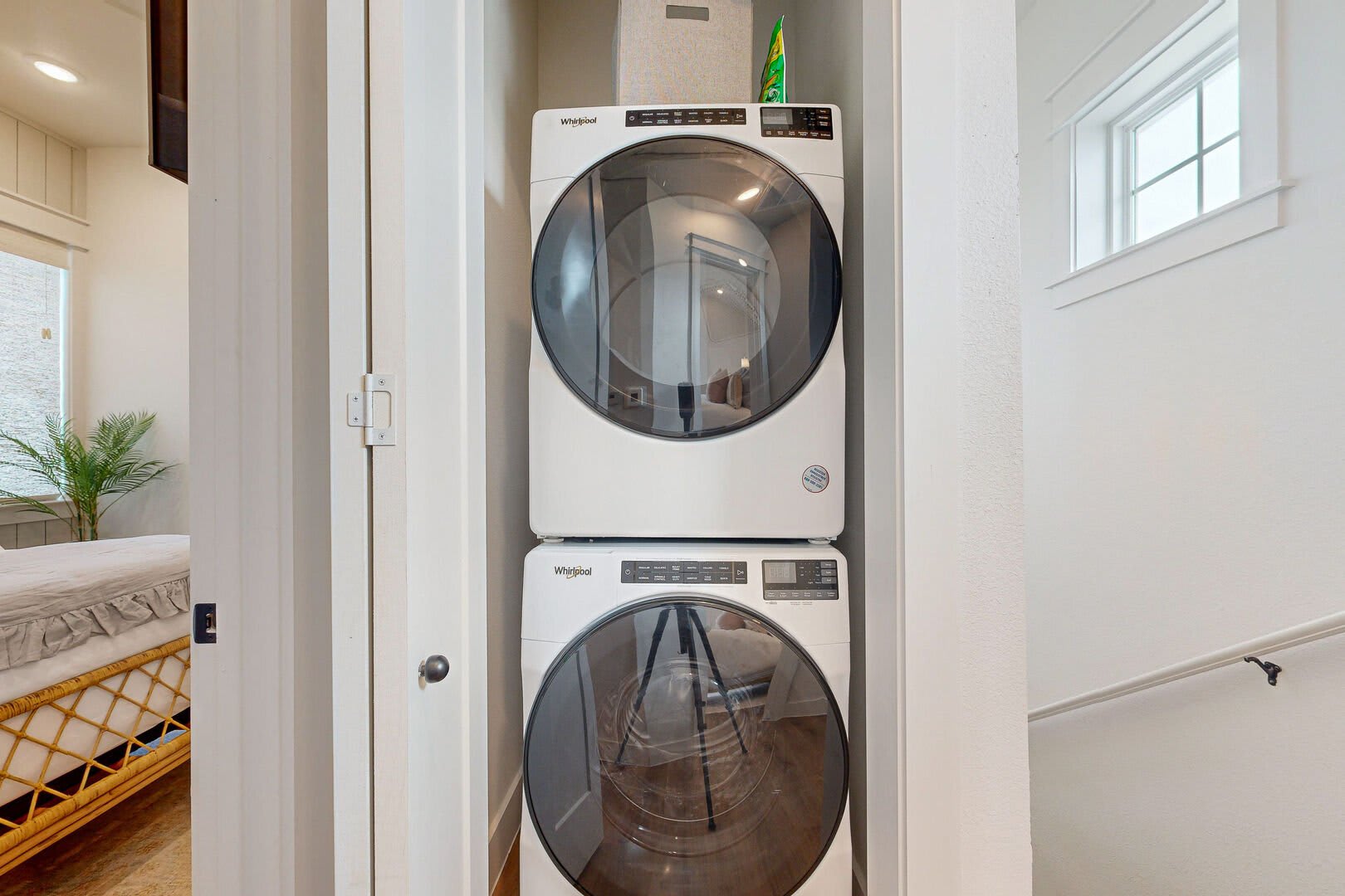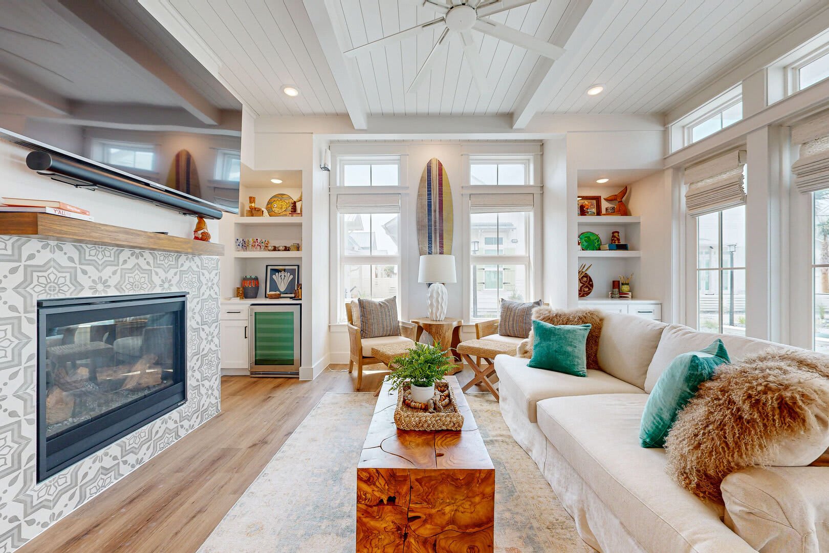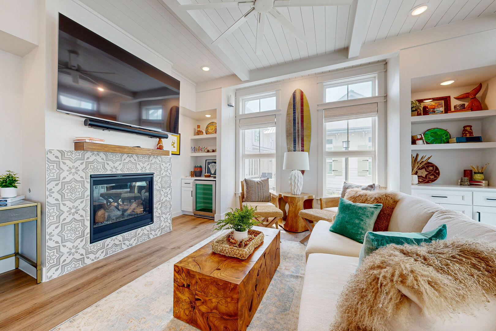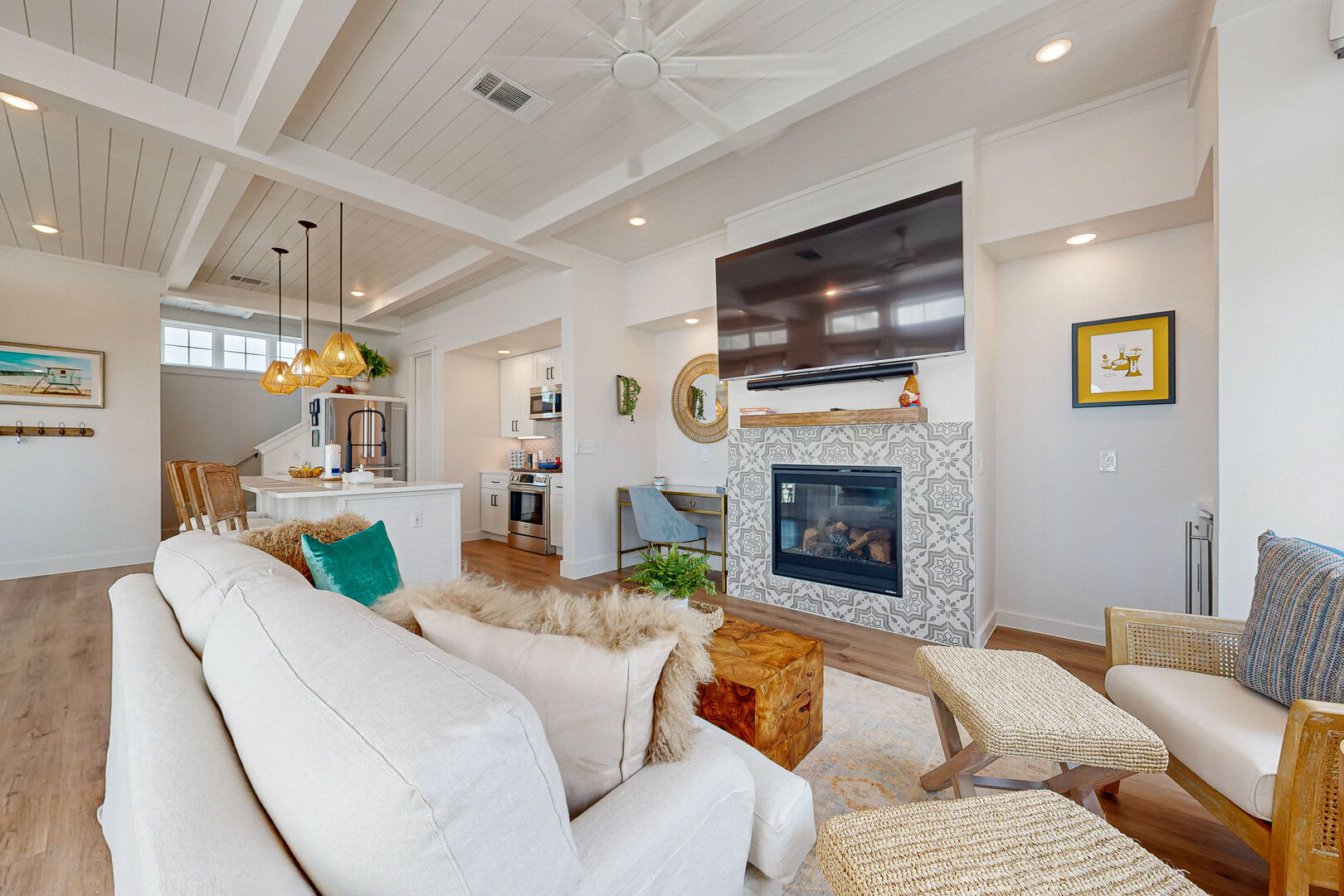 On the first level, you'll find an inviting open floor plan that seamlessly blends the main kitchen, dining, and living areas. The fully equipped kitchen boasts stainless steel appliances and an extra beverage fridge, perfect for creating delicious meals and refreshing drinks. Need to catch up on work? The living area features a built-in desk with a comfy chair to ensure productivity while you enjoy your getaway.