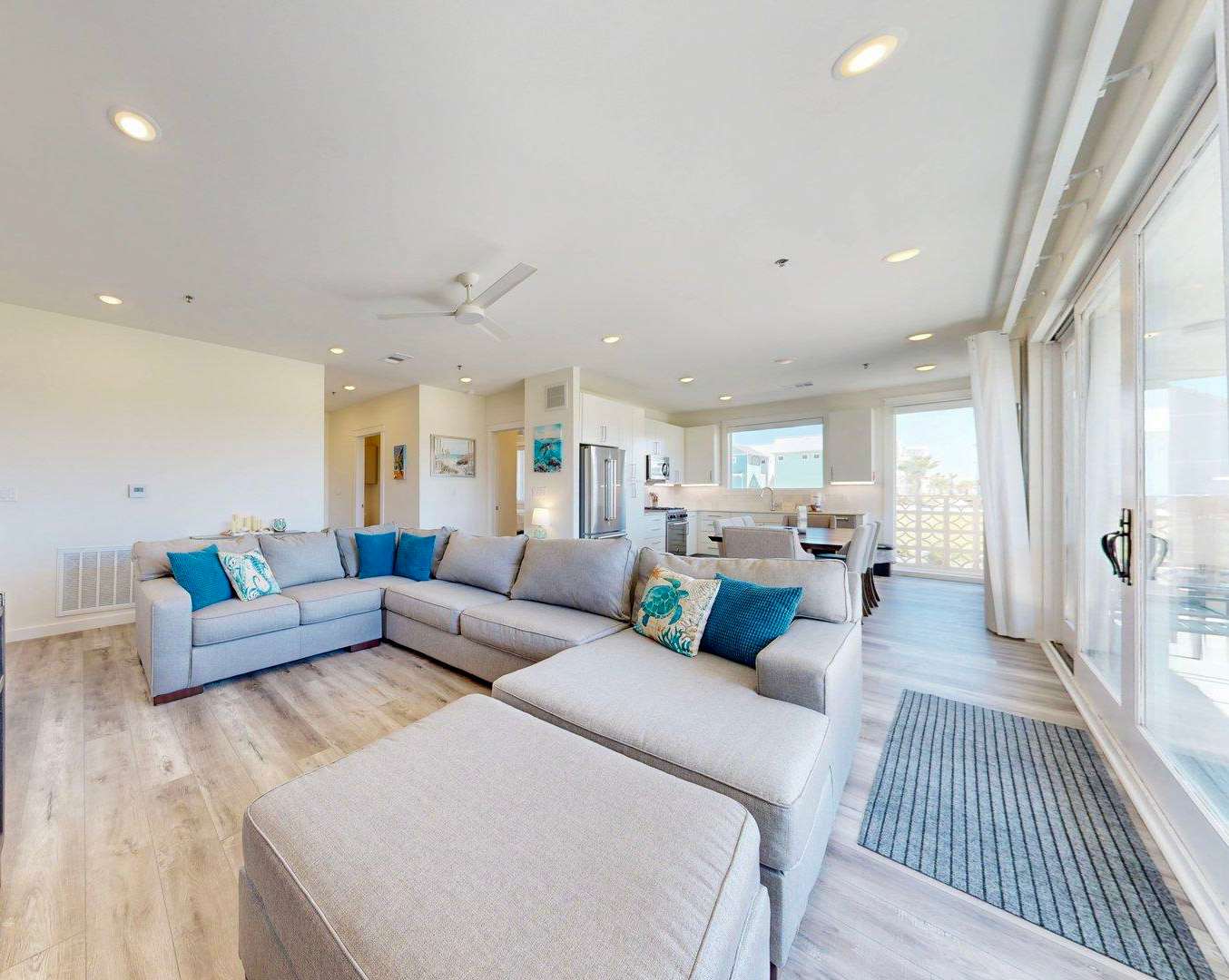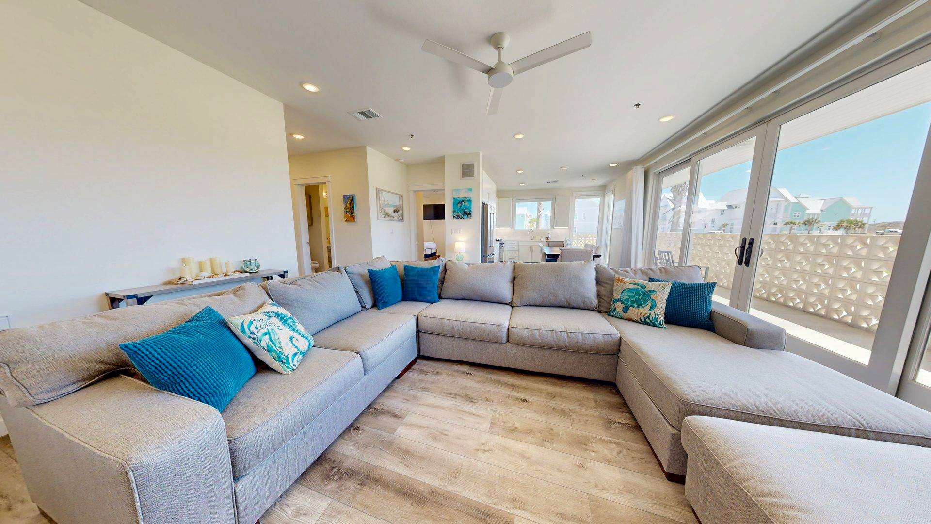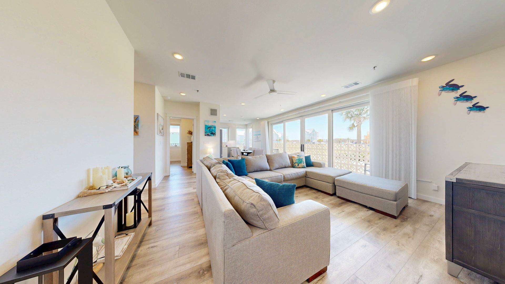 Welcome to Coastal Paradise, a stunning first-floor condo located in the highly sought-after beachfront community of Sunflower Beach Resort. This beautifully decorated retreat features an inviting open floor plan that seamlessly blends comfort and style. The spacious living room is perfect for unwinding after a day at the beach, boasting a plush sectional that converts into a queen sleeper, and an impressive 85" TV equipped with surround sound—ideal for relaxing evenings or unforgettable movie nights.