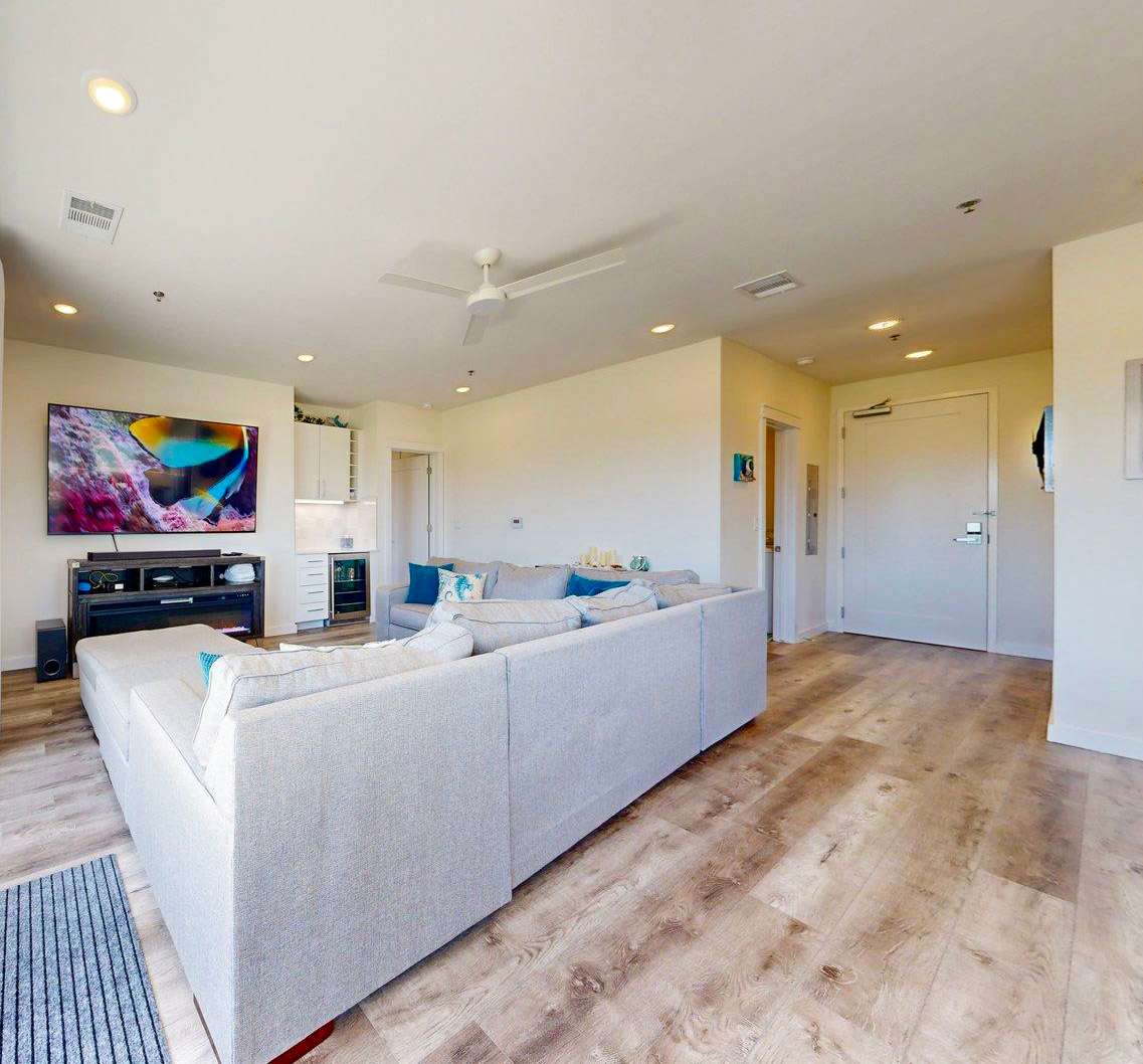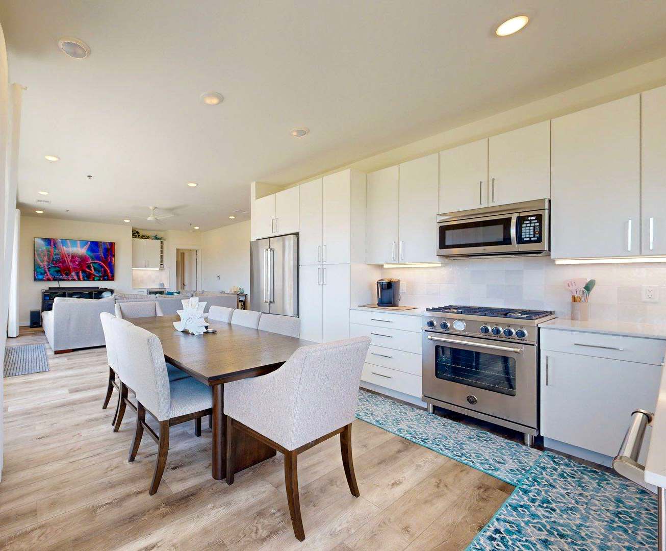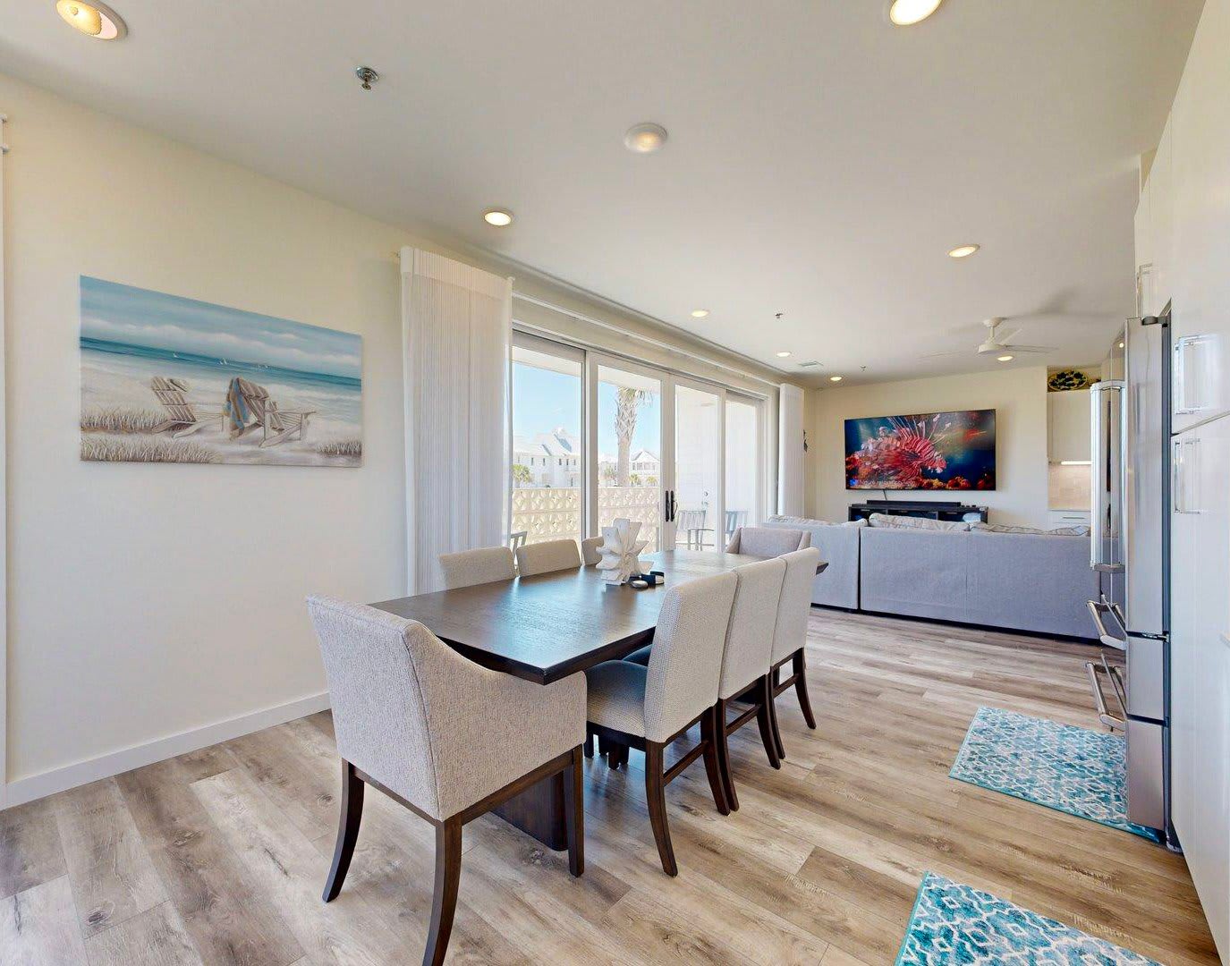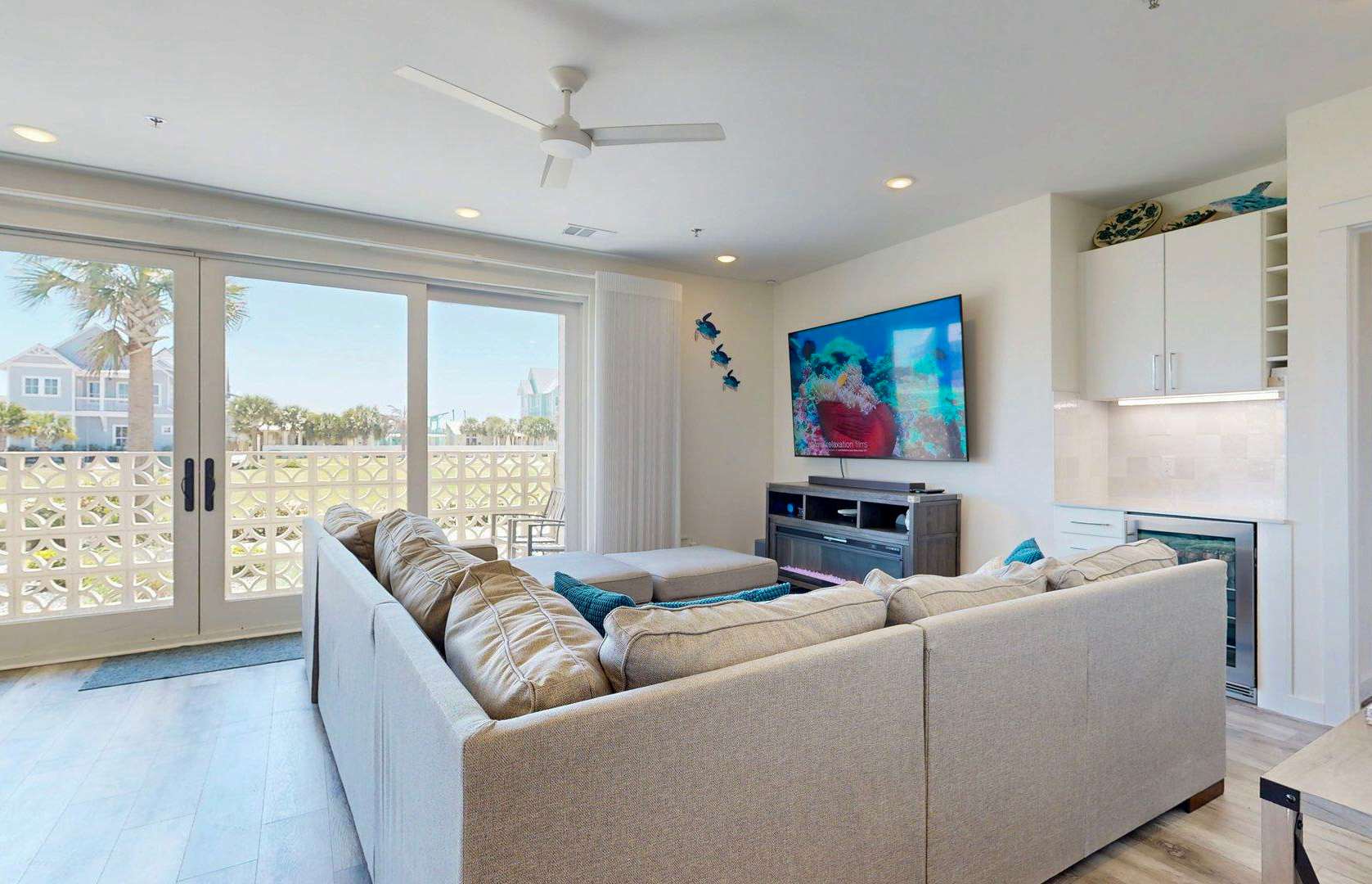 Welcome to Coastal Paradise, a stunning first-floor condo located in the highly sought-after beachfront community of Sunflower Beach Resort. This beautifully decorated retreat features an inviting open floor plan that seamlessly blends comfort and style. The spacious living room is perfect for unwinding after a day at the beach, boasting a plush sectional that converts into a queen sleeper, and an impressive 85" TV equipped with surround sound—ideal for relaxing evenings or unforgettable movie nights.