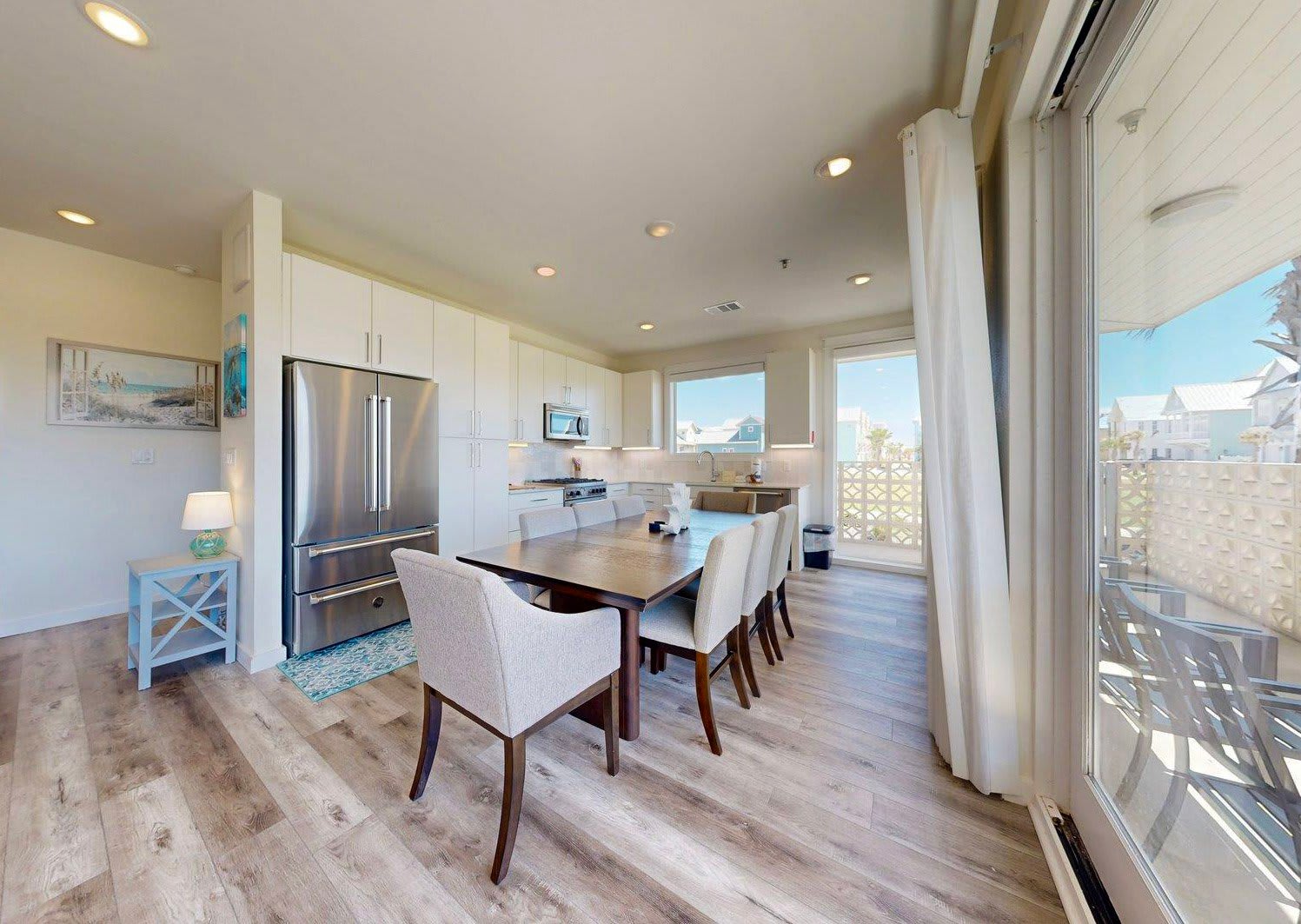 The fully stocked kitchen is a culinary delight, featuring modern stainless steel appliances and ample counter space, making meal prep a breeze. Gather around the elegant dining table, which comfortably seats eight, perfect for family dinners or entertaining friends. Step outside to the wrap-around patio area, which provides an inviting L-shaped layout, offering a shaded spot to enjoy the cool afternoon breeze.
