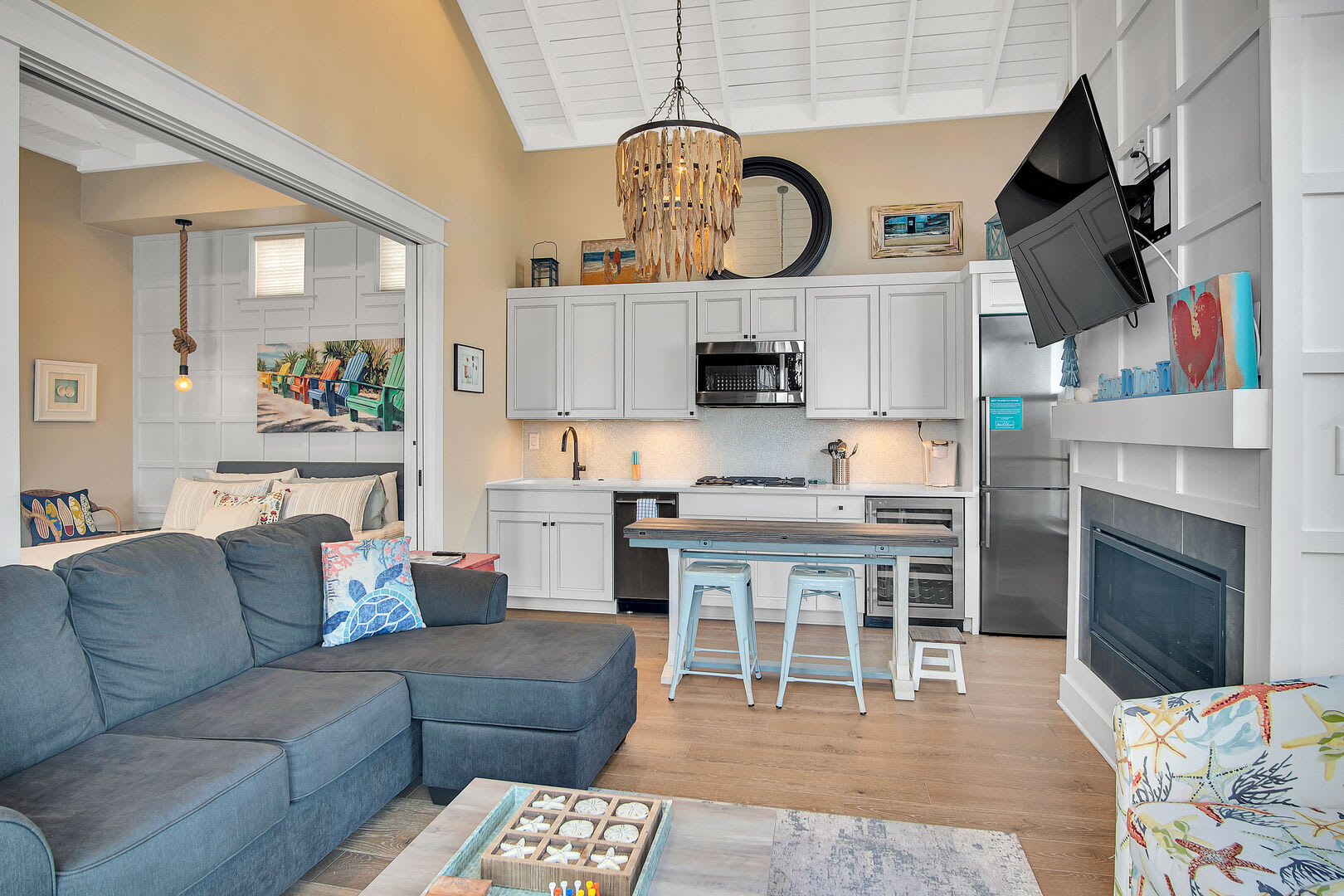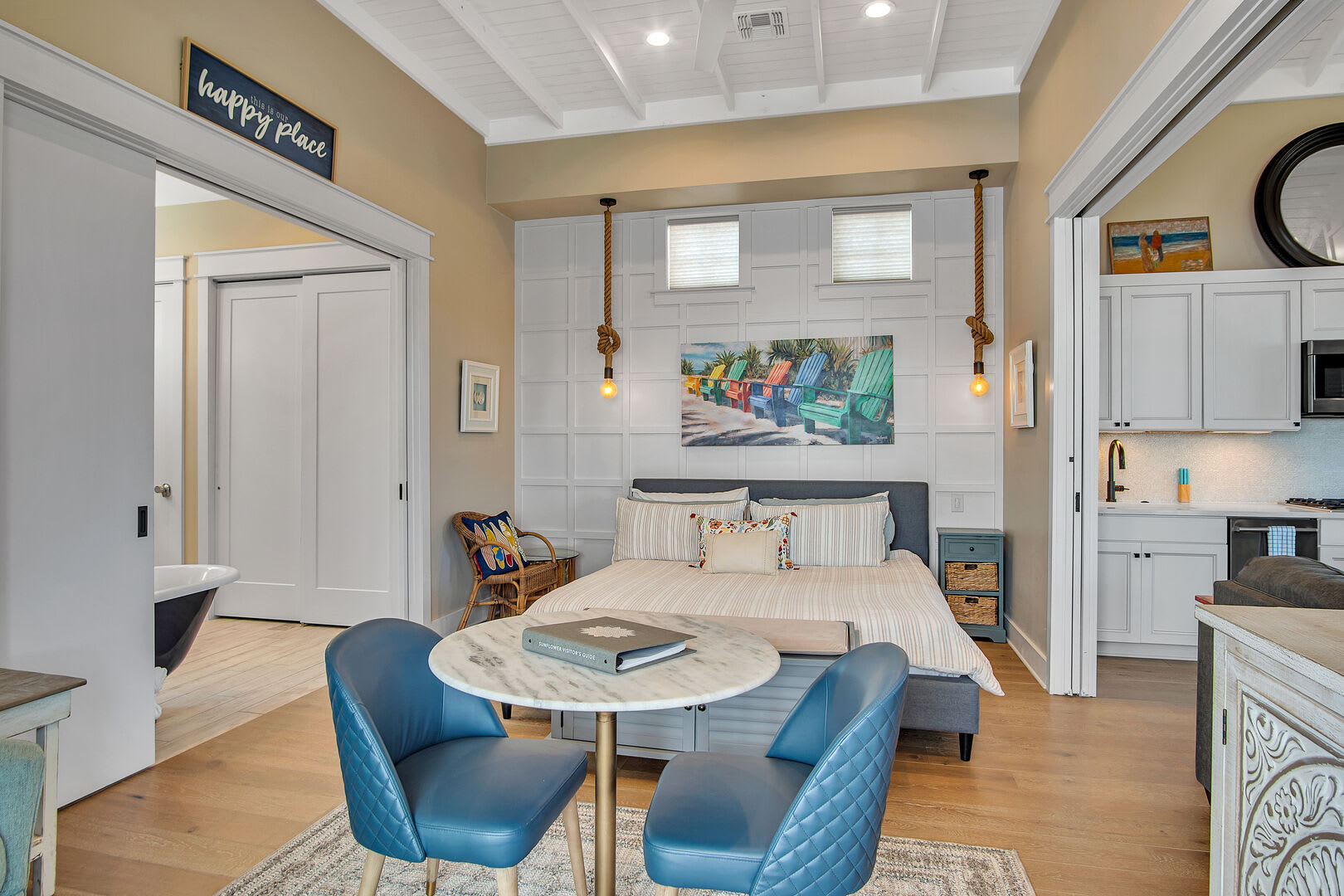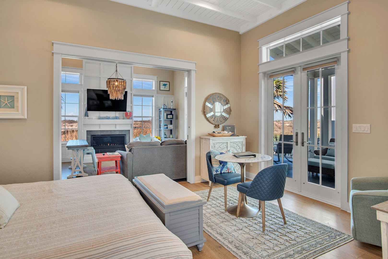 The serene bedroom retreat includes a king-size bed, cozy sitting area, and a private bathroom with a double vanity, walk-in shower, and soaking tub—perfect for relaxing after a day at the beach. Ideal for couples, this charming coastal hideaway is made for rest, reconnection, and romance.