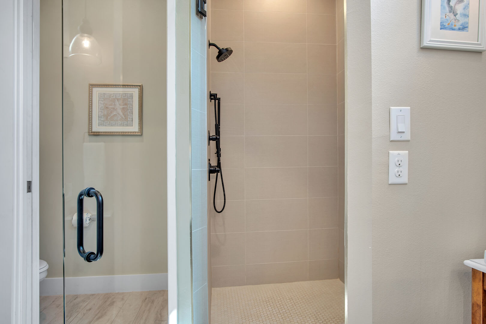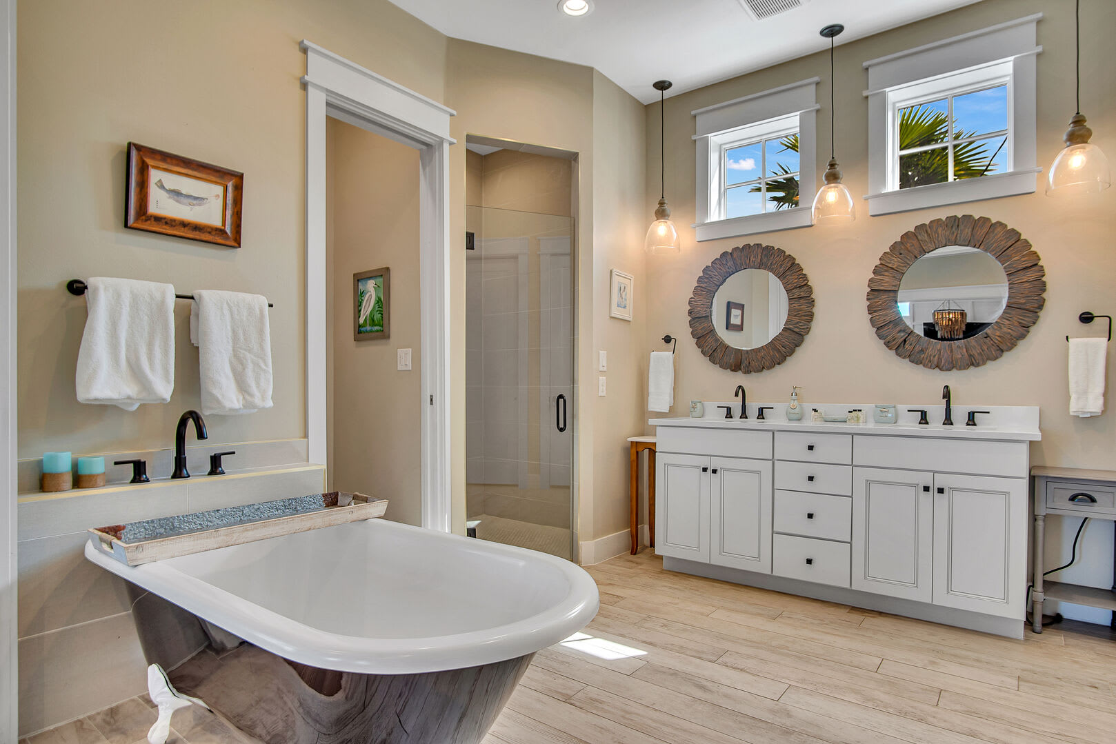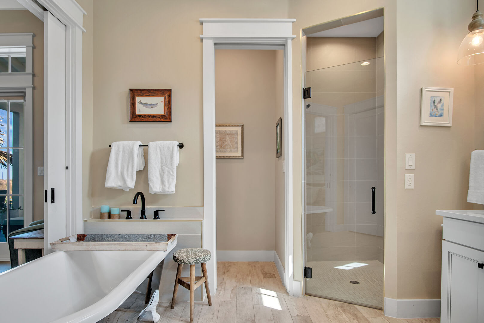 The serene bedroom retreat includes a king-size bed, cozy sitting area, and a private bathroom with a double vanity, walk-in shower, and soaking tub—perfect for relaxing after a day at the beach. Ideal for couples, this charming coastal hideaway is made for rest, reconnection, and romance.