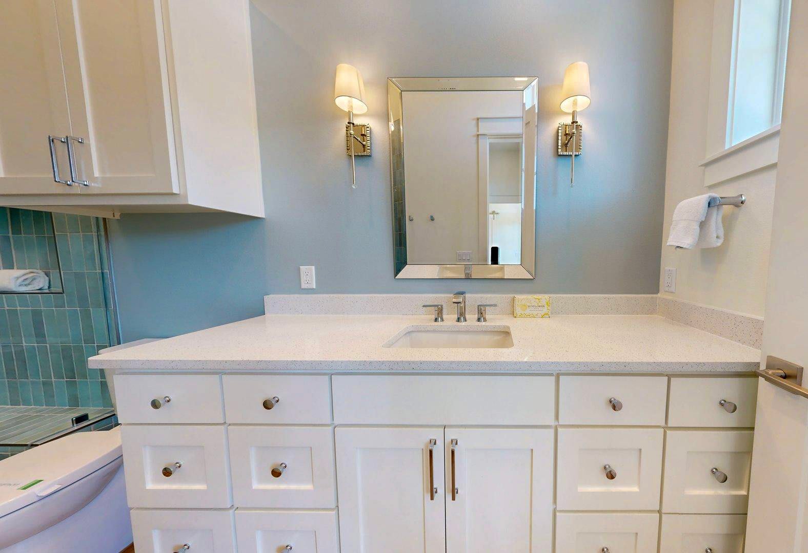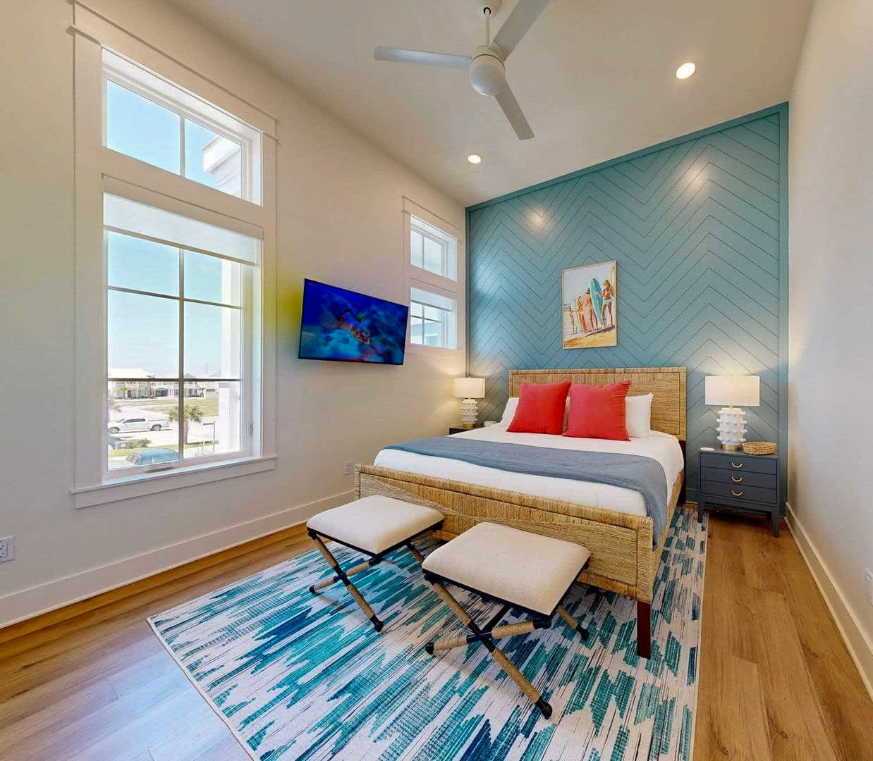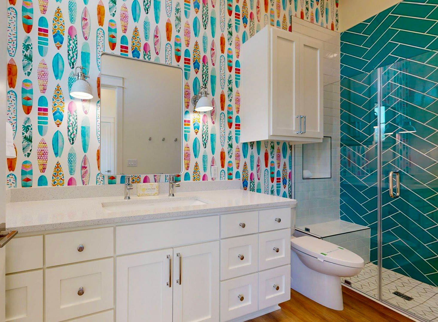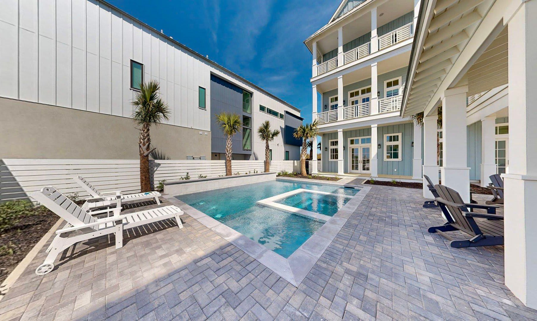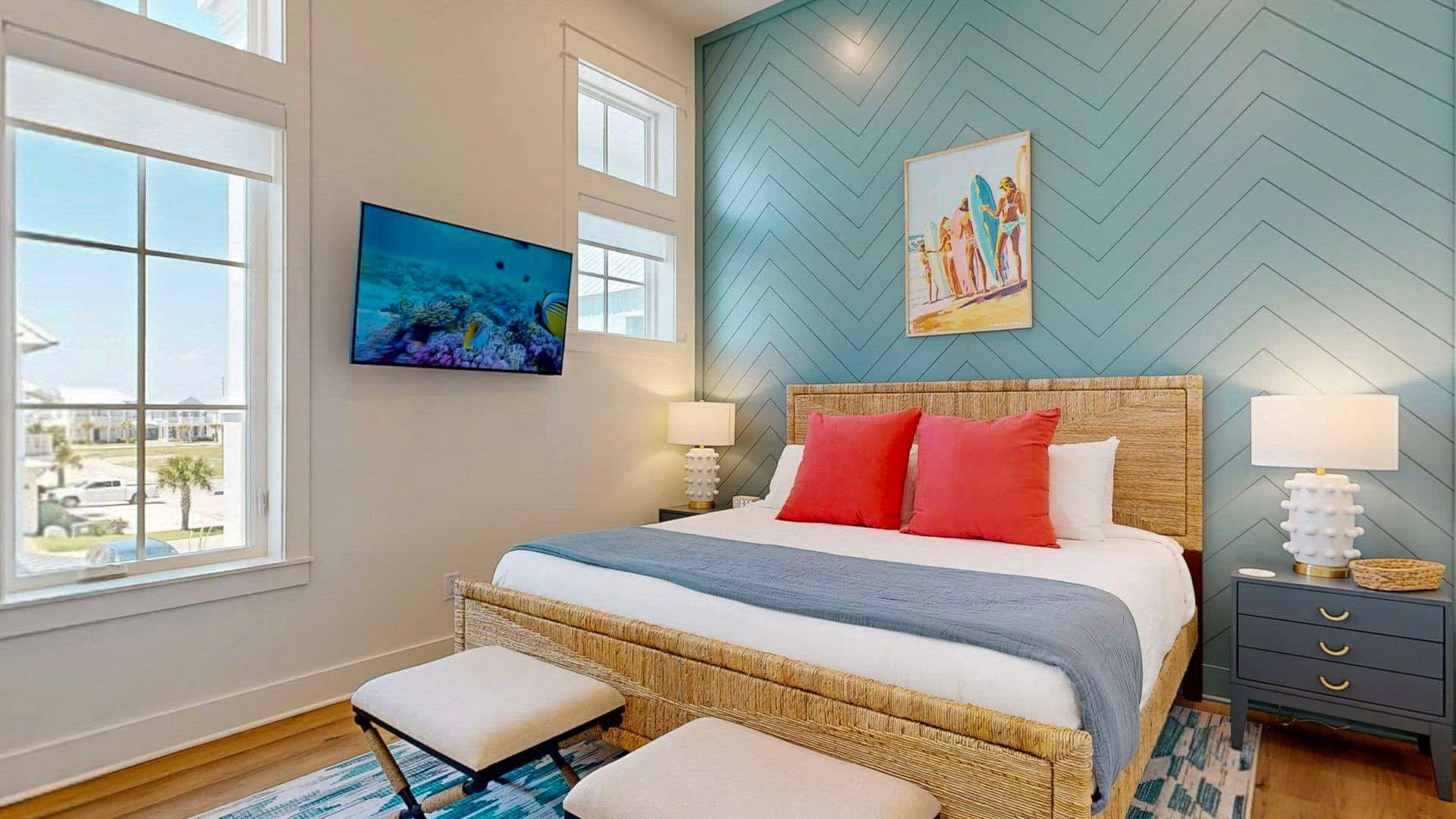 The home boasts five beautifully appointed bedrooms, including three king suites, one queen room, and a playful bunk room ideal for children. Each of the five full bathrooms features a walk-in shower, and a poolside half bath adds convenience for outdoor relaxation.