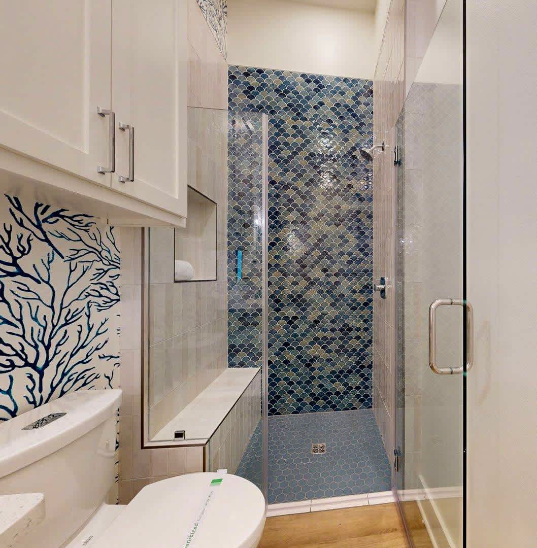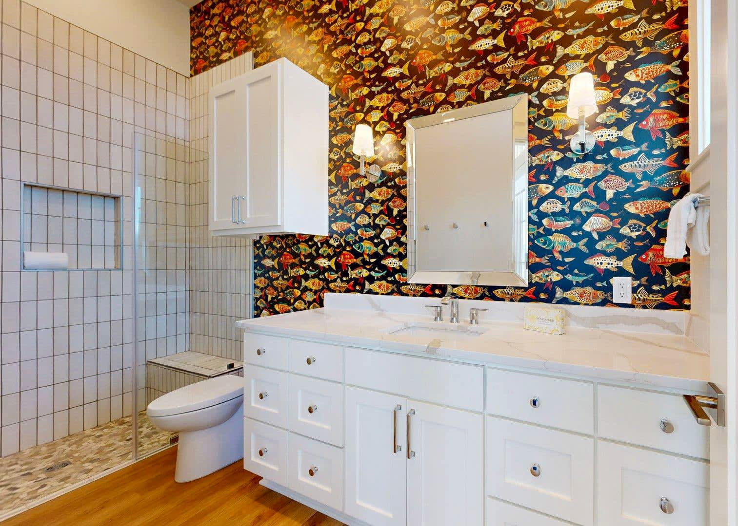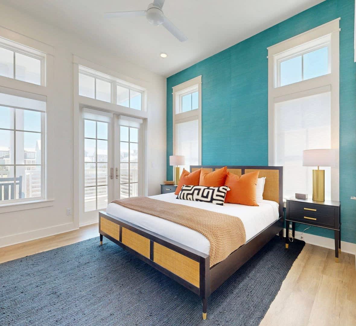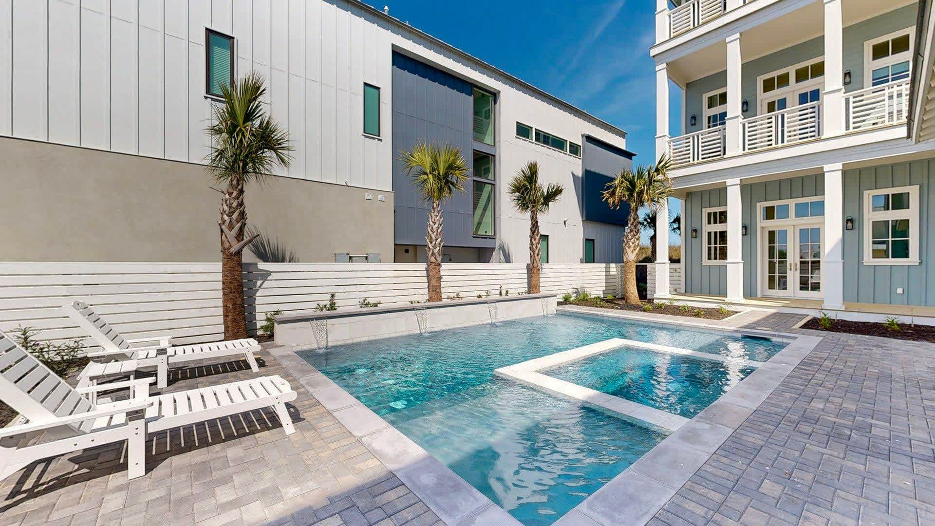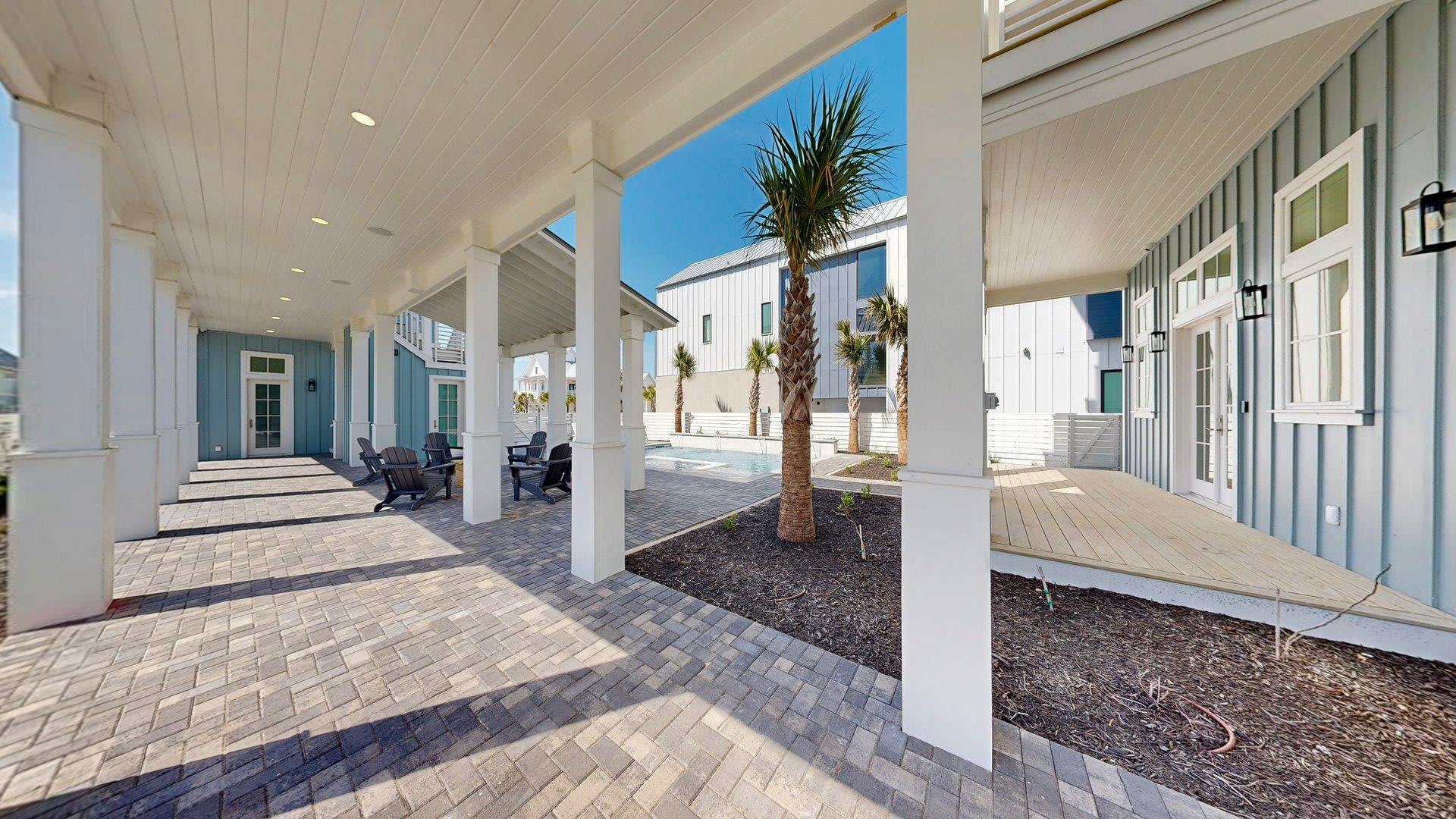 The home boasts five beautifully appointed bedrooms, including three king suites, one queen room, and a playful bunk room ideal for children. Each of the five full bathrooms features a walk-in shower, and a poolside half bath adds convenience for outdoor relaxation.