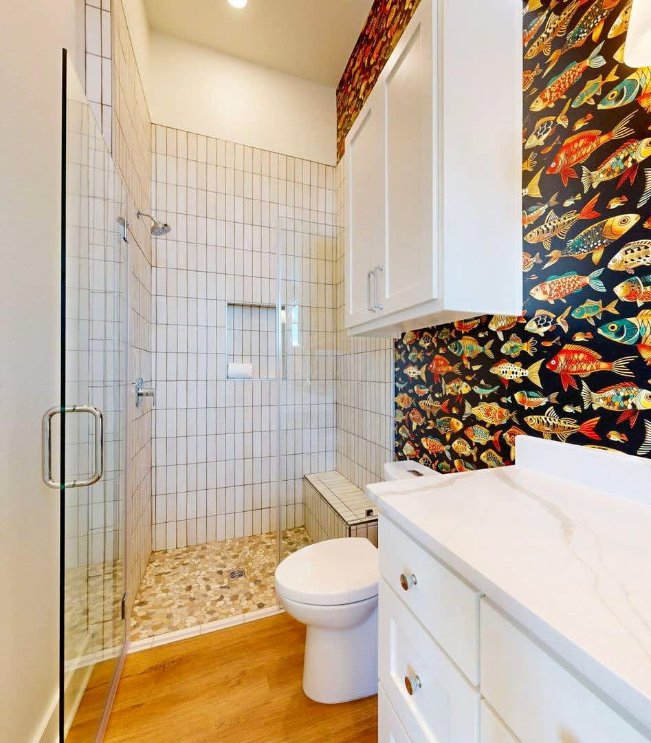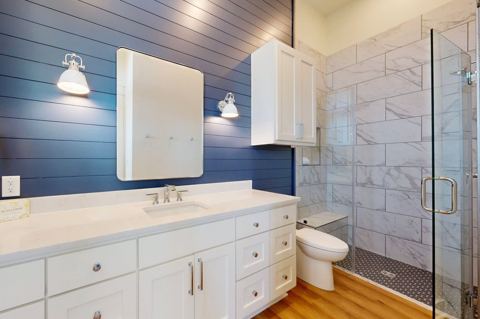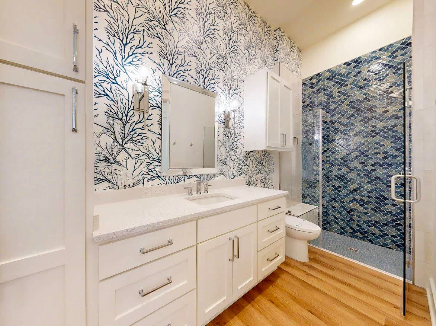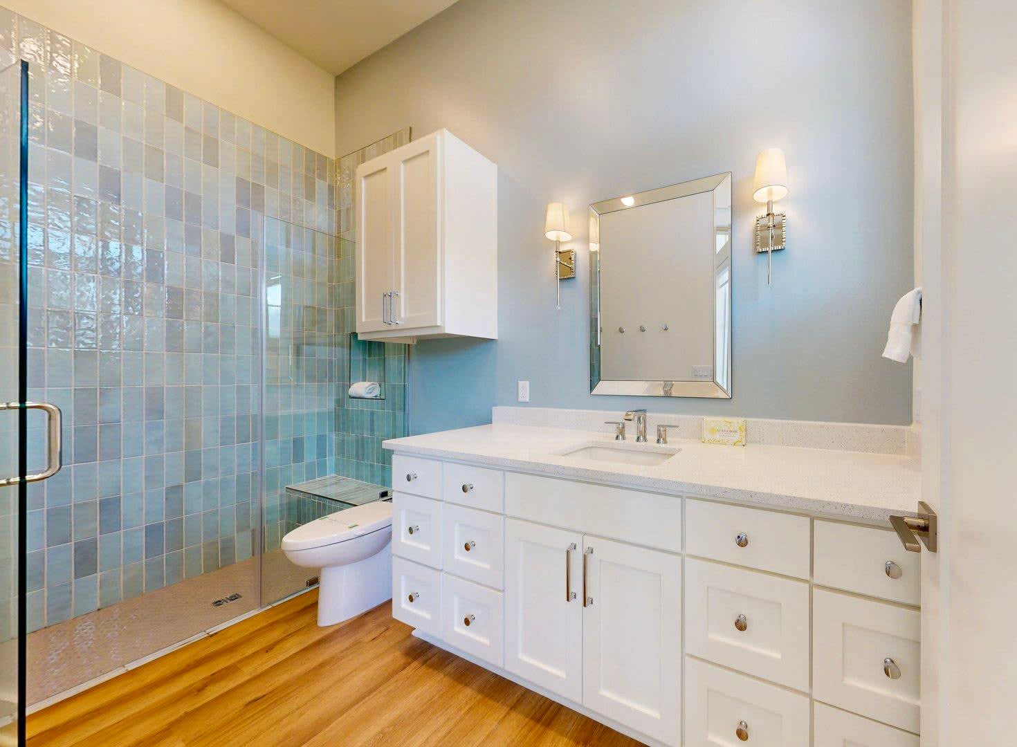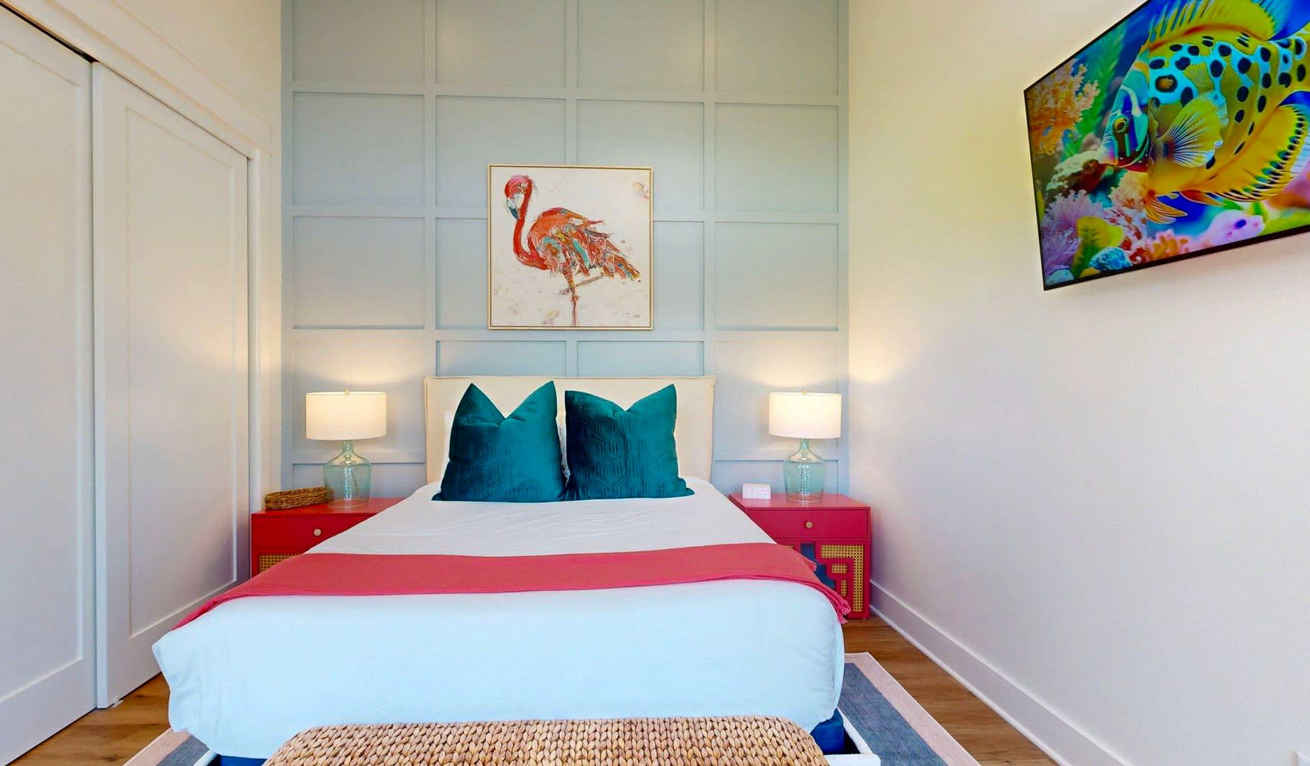 The home boasts five beautifully appointed bedrooms, including three king suites, one queen room, and a playful bunk room ideal for children. Each of the five full bathrooms features a walk-in shower, and a poolside half bath adds convenience for outdoor relaxation.