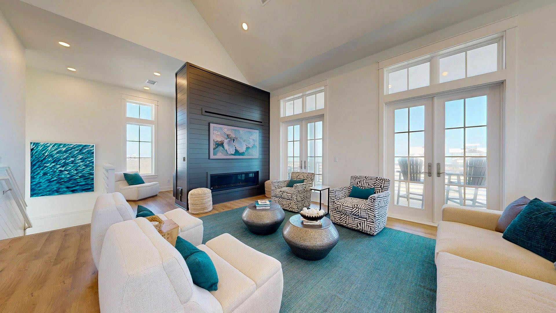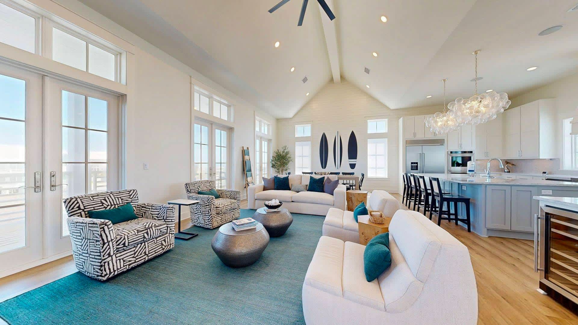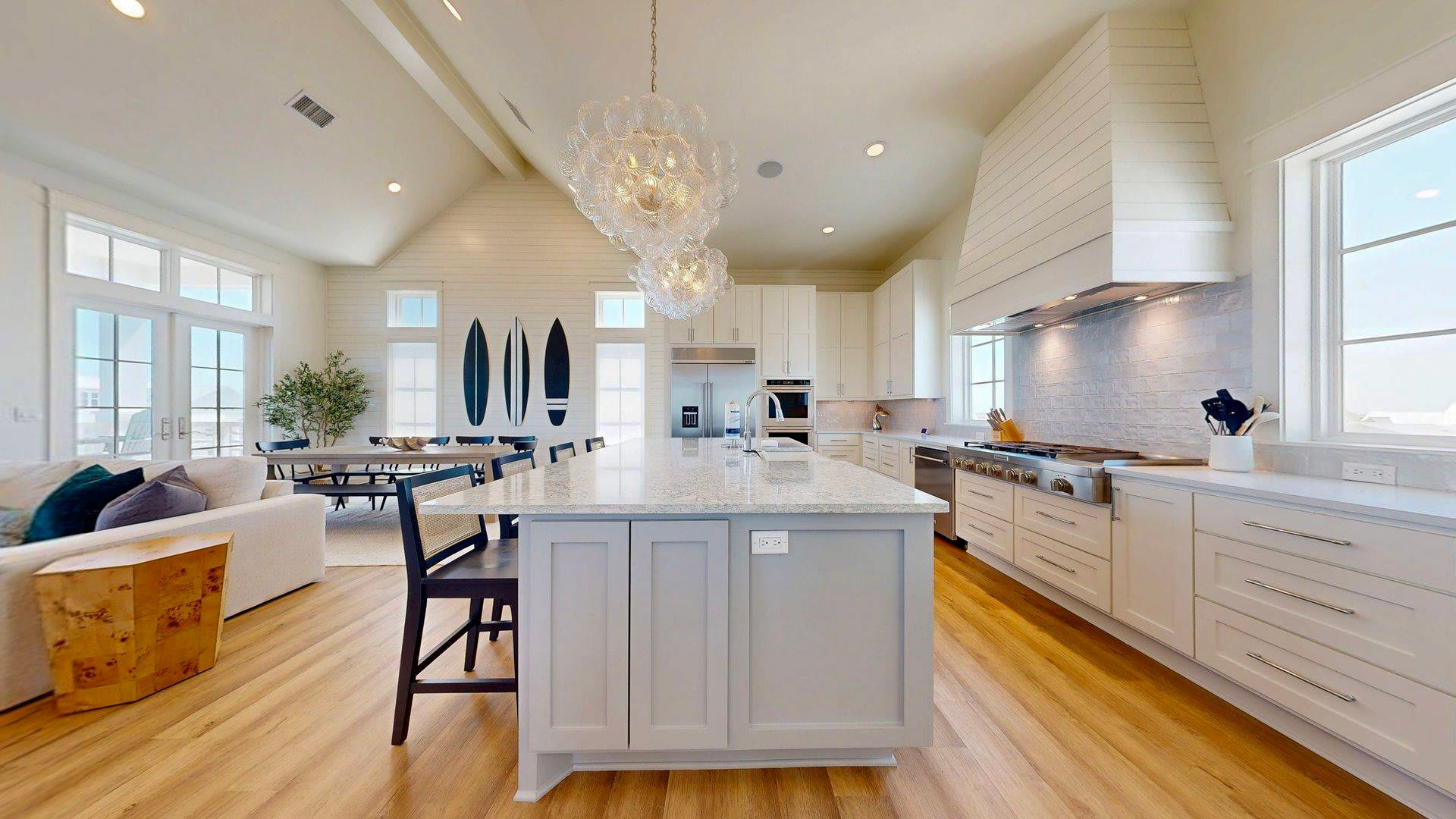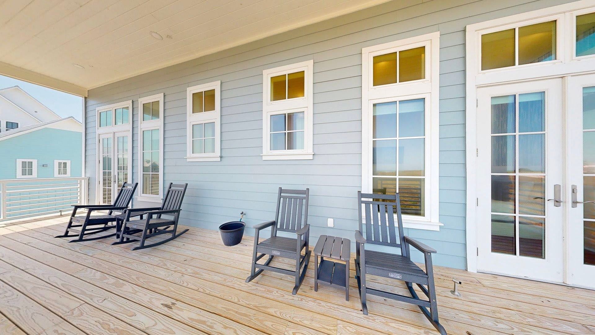 The third-floor living area is bright and open, designed for comfort and connection. The gourmet kitchen is equipped with top-tier appliances, including an air fryer, double oven, two dishwashers, a Keurig coffee maker (bring your favorite K-Cups), a wine/beverage fridge, and an ice maker. A second ice maker in the first-floor game room ensures you’re always ready for entertaining. Dine indoors or enjoy al fresco meals on the patio with ocean views, complete with a gas grill for barbecues.
