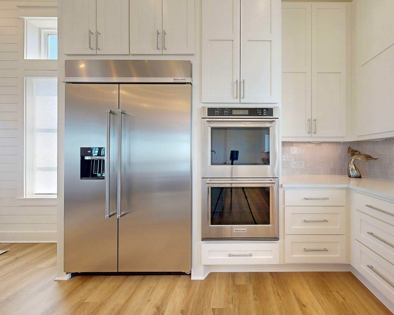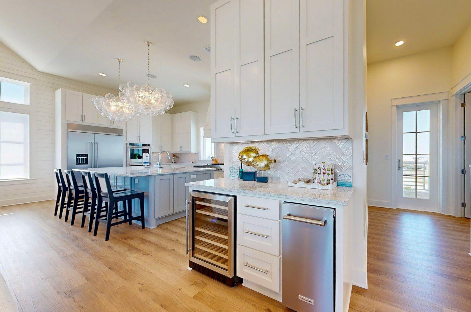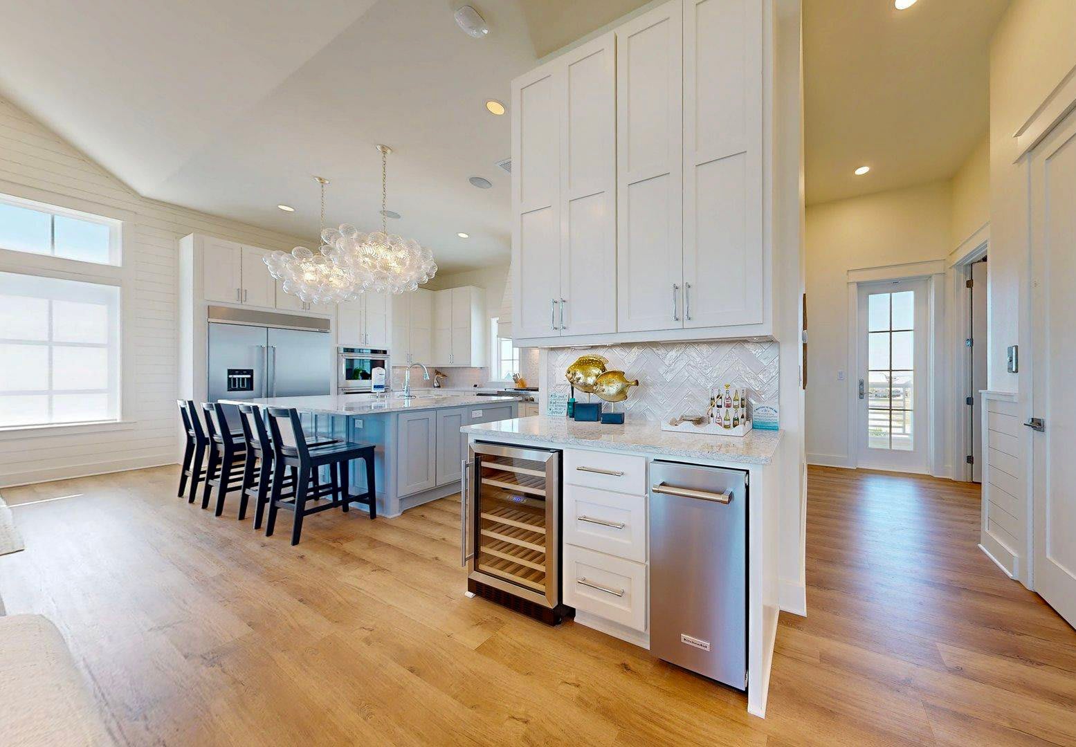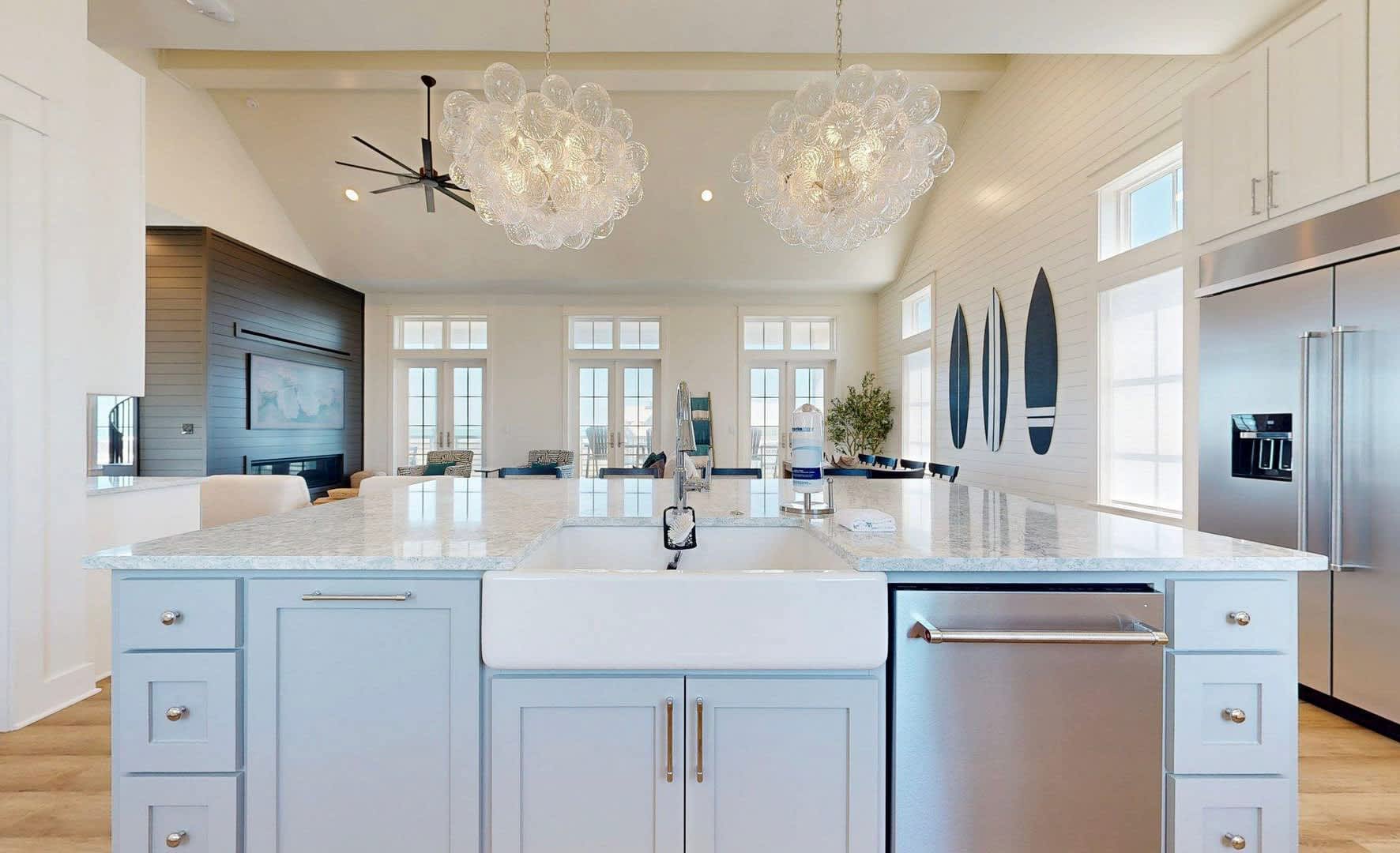 The third-floor living area is bright and open, designed for comfort and connection. The gourmet kitchen is equipped with top-tier appliances, including an air fryer, double oven, two dishwashers, a Keurig coffee maker (bring your favorite K-Cups), a wine/beverage fridge, and an ice maker. A second ice maker in the first-floor game room ensures you’re always ready for entertaining. Dine indoors or enjoy al fresco meals on the patio with ocean views, complete with a gas grill for barbecues.