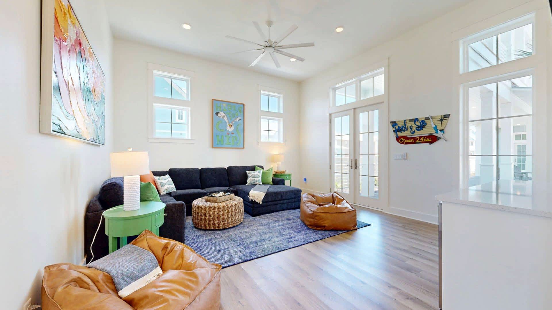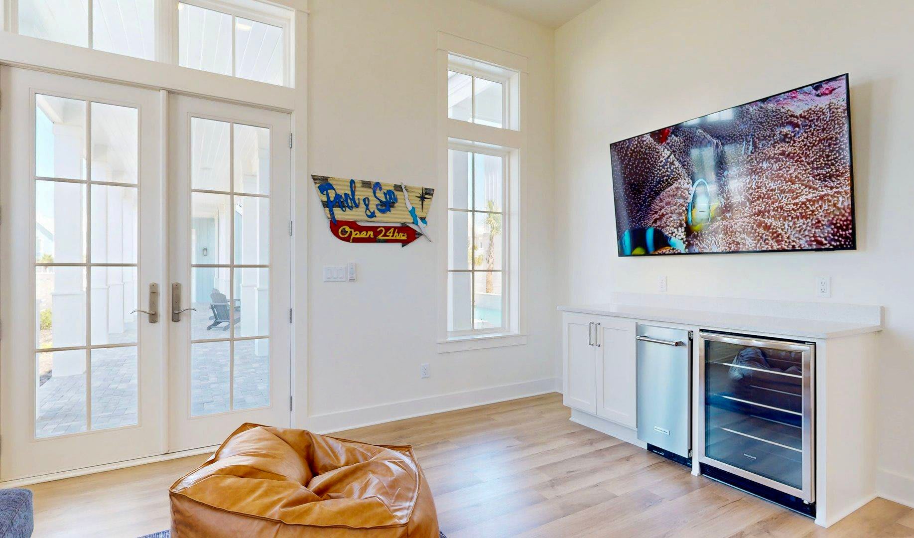 Game Room: Equipped with smart TVs, a bar area, board games, wine/beverage fridge, and ice maker.