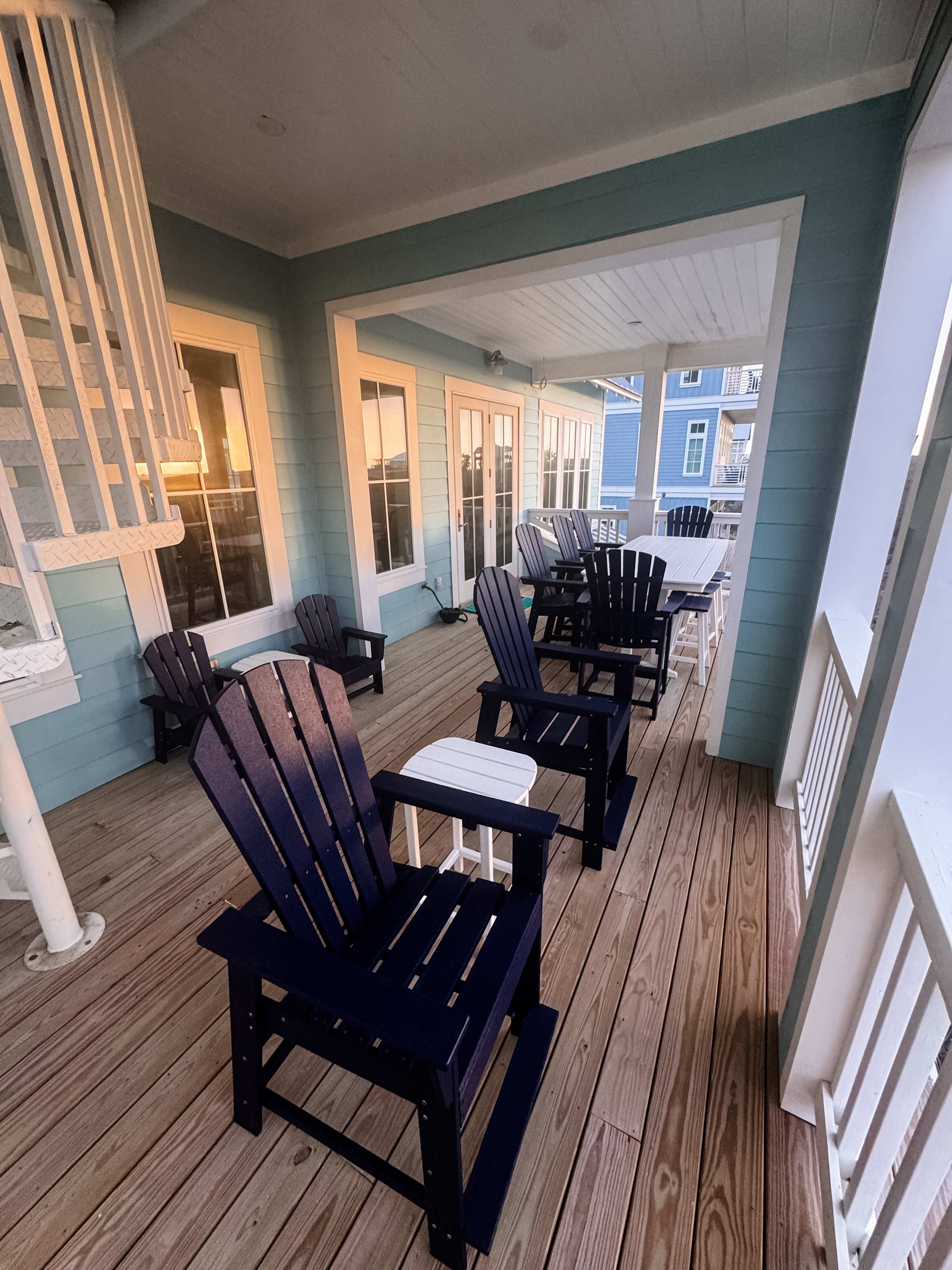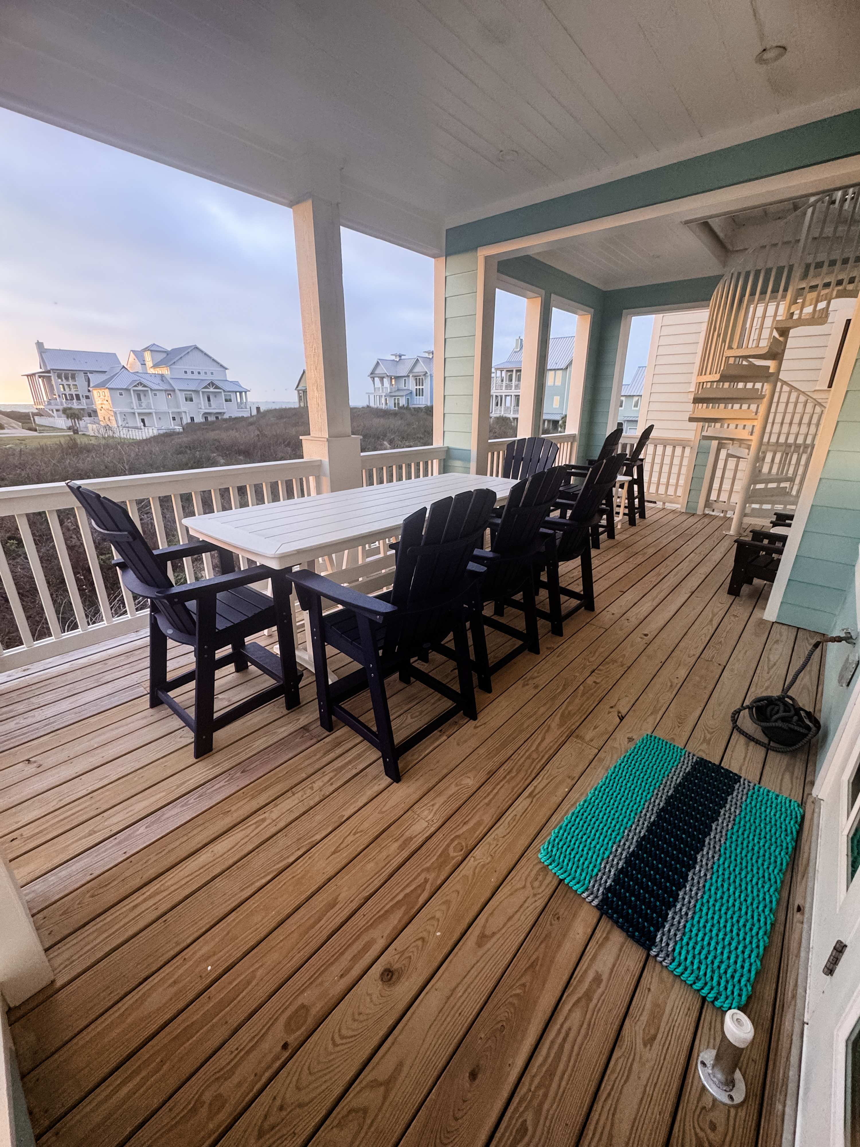 Designed for gathering and taking in the coastal surroundings, Dune Great offers expansive living spaces paired with elevated comfort. The open-concept kitchen, dining, and living area welcomes you in with generous seating for large groups, creating the perfect setting for shared meals, games, and relaxed evenings with ocean views. Multiple porches invite you to enjoy the Gulf breeze, while a spiral staircase leads to a charming crow’s nest—an ideal spot to unwind and take in the scenery.