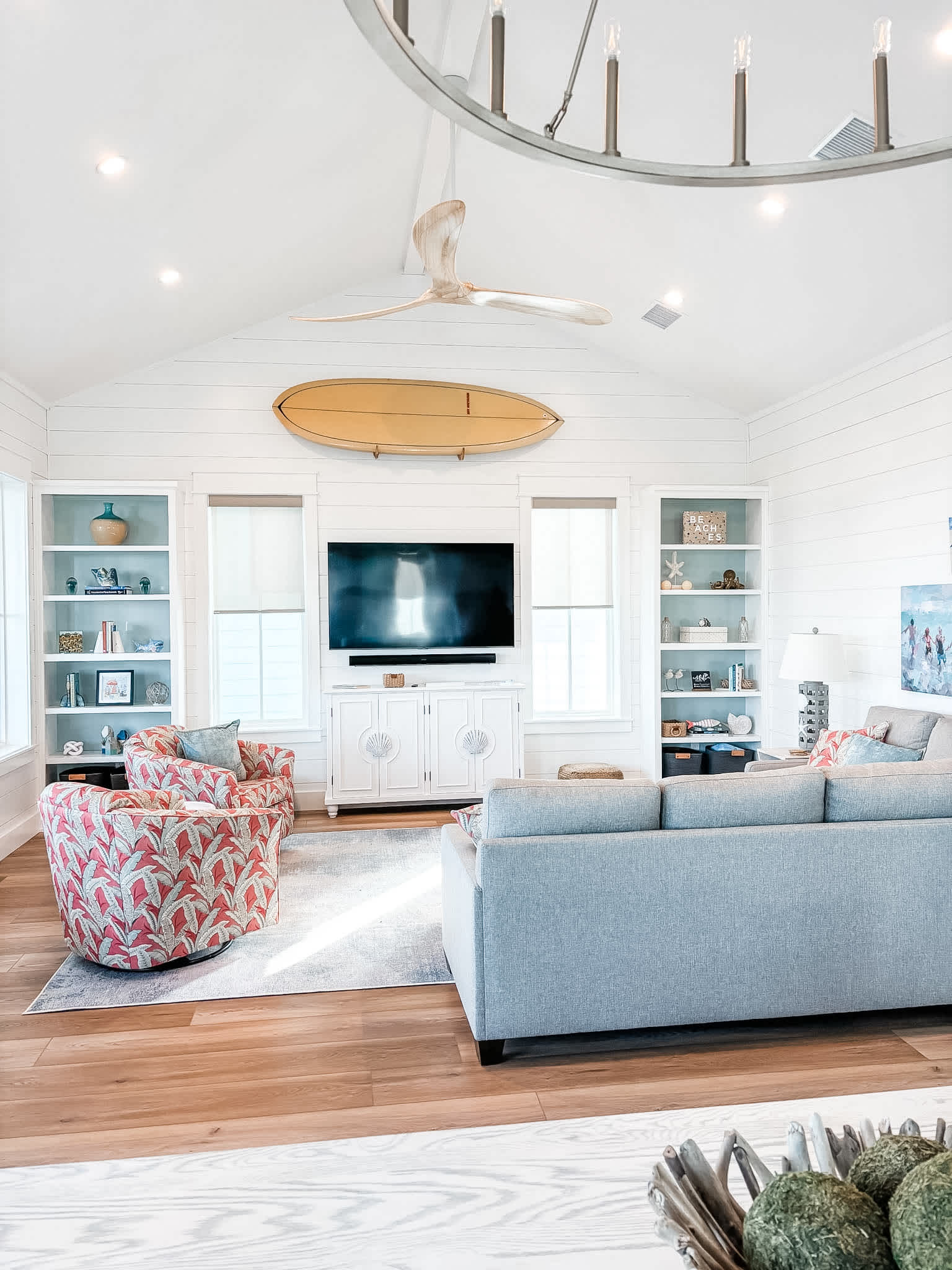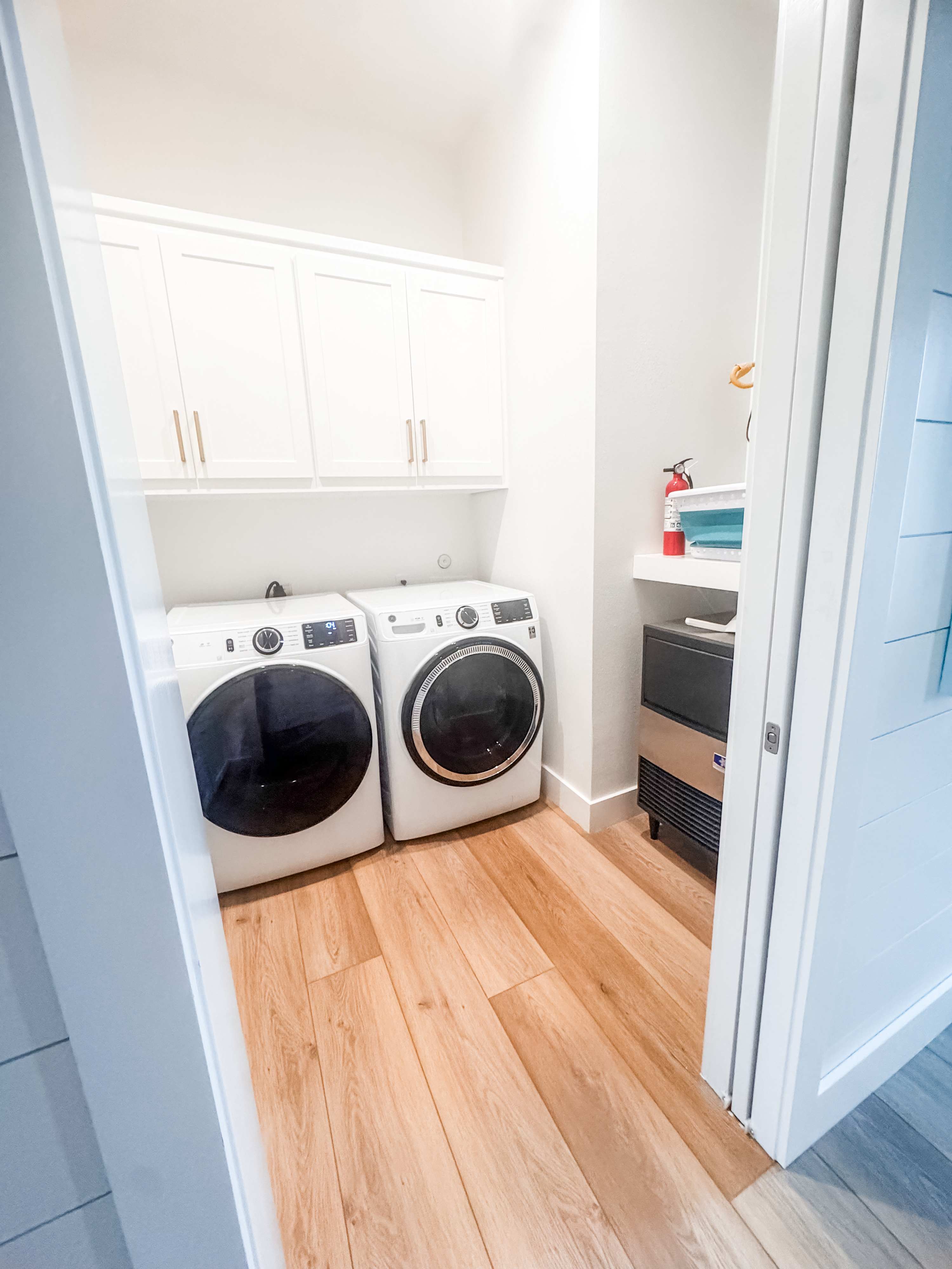 The home features three king suites, each with a private en suite bath, along with a spacious bunk room designed for families and groups. A secondary living area downstairs provides an additional place to gather, complete with a beverage fridge, sink, and bar area. Outdoor spaces are equally inviting, with a turf lawn, fire pit, and outdoor shower for easy transitions from beach to home. Thoughtful touches like a second ice maker and multiple entertainment areas make this home as functional as it is relaxing—all set within the laid-back coastal lifestyle of Port Aransas.