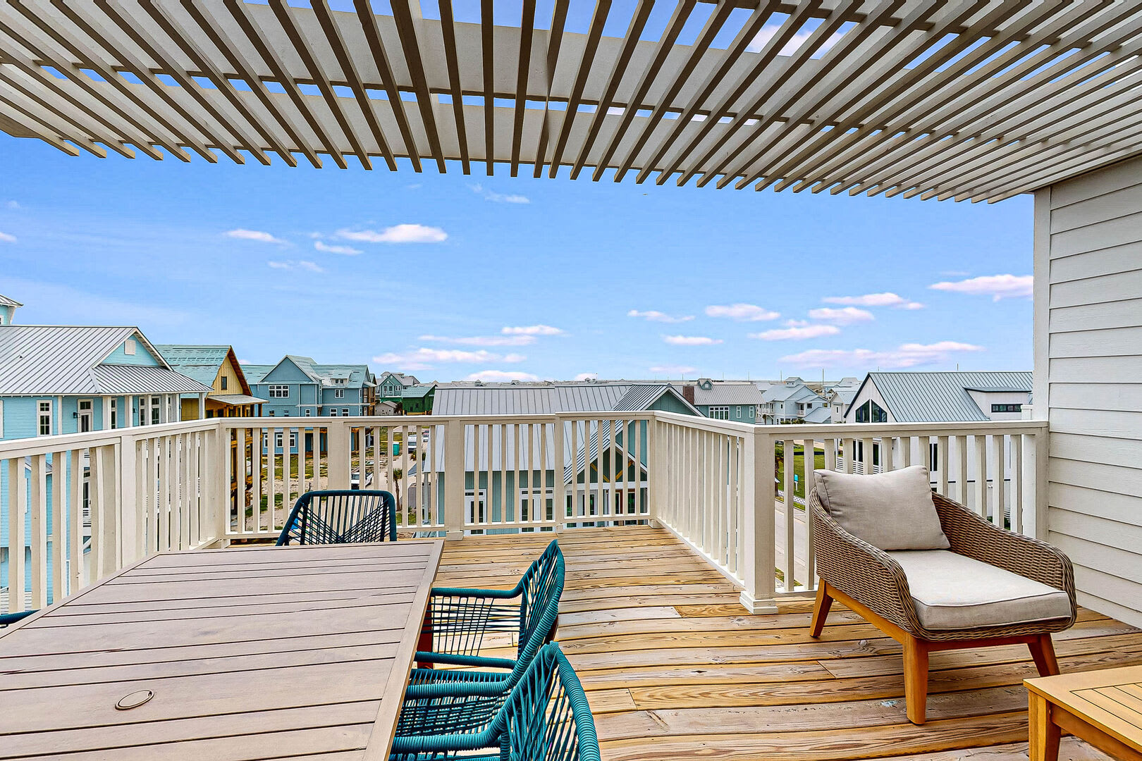 The top level is an entertainer's dream, featuring a bar area complete with a snack fridge and leading out to a sprawling deck furnished with dining and living spaces, providing panoramic vistas of the Gulf and Bay.
