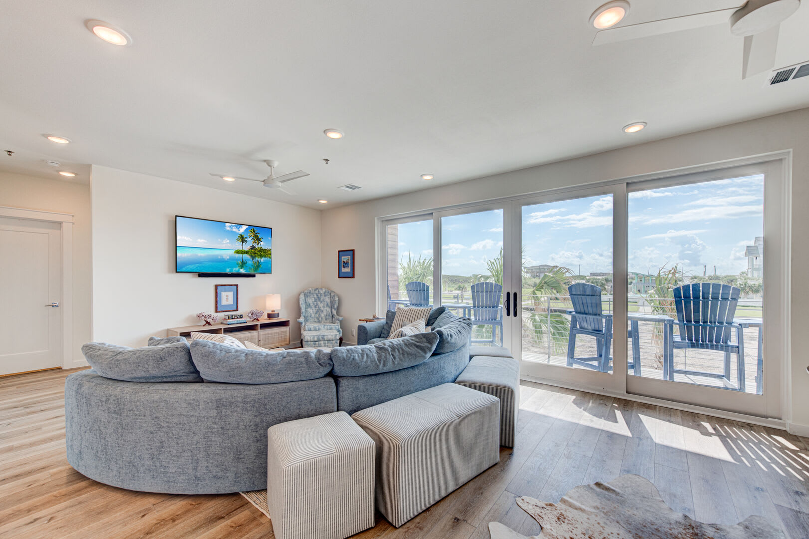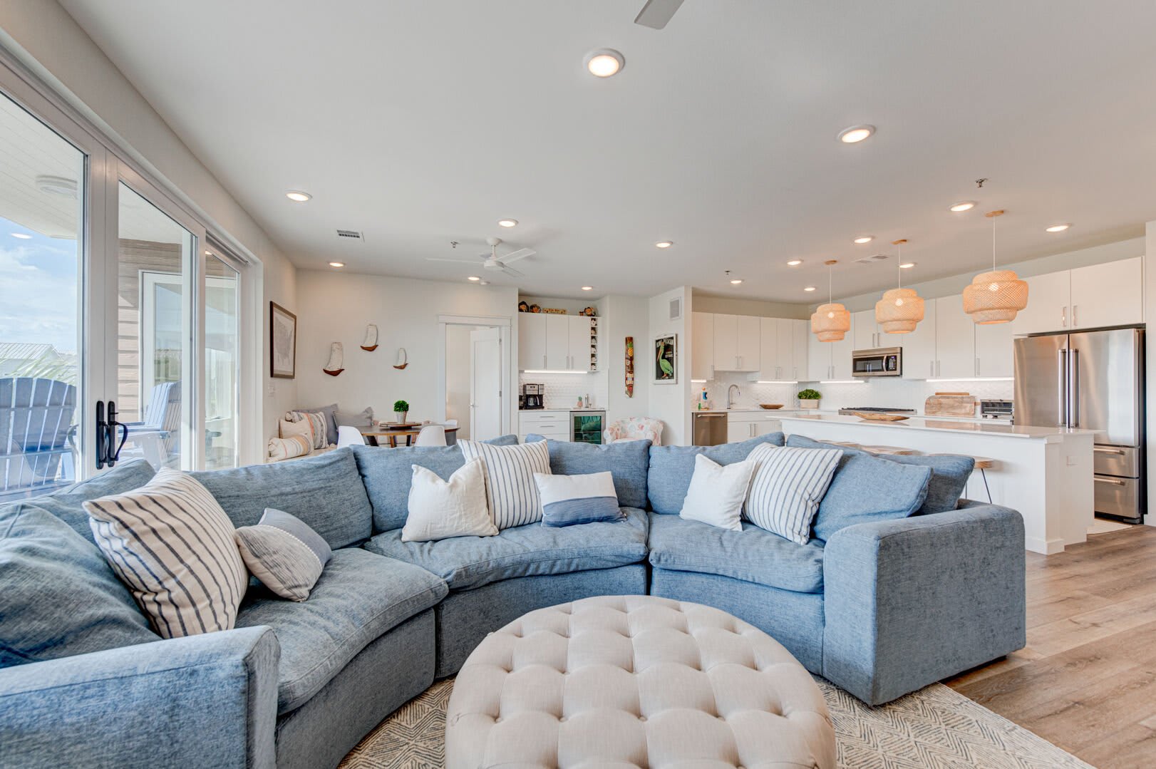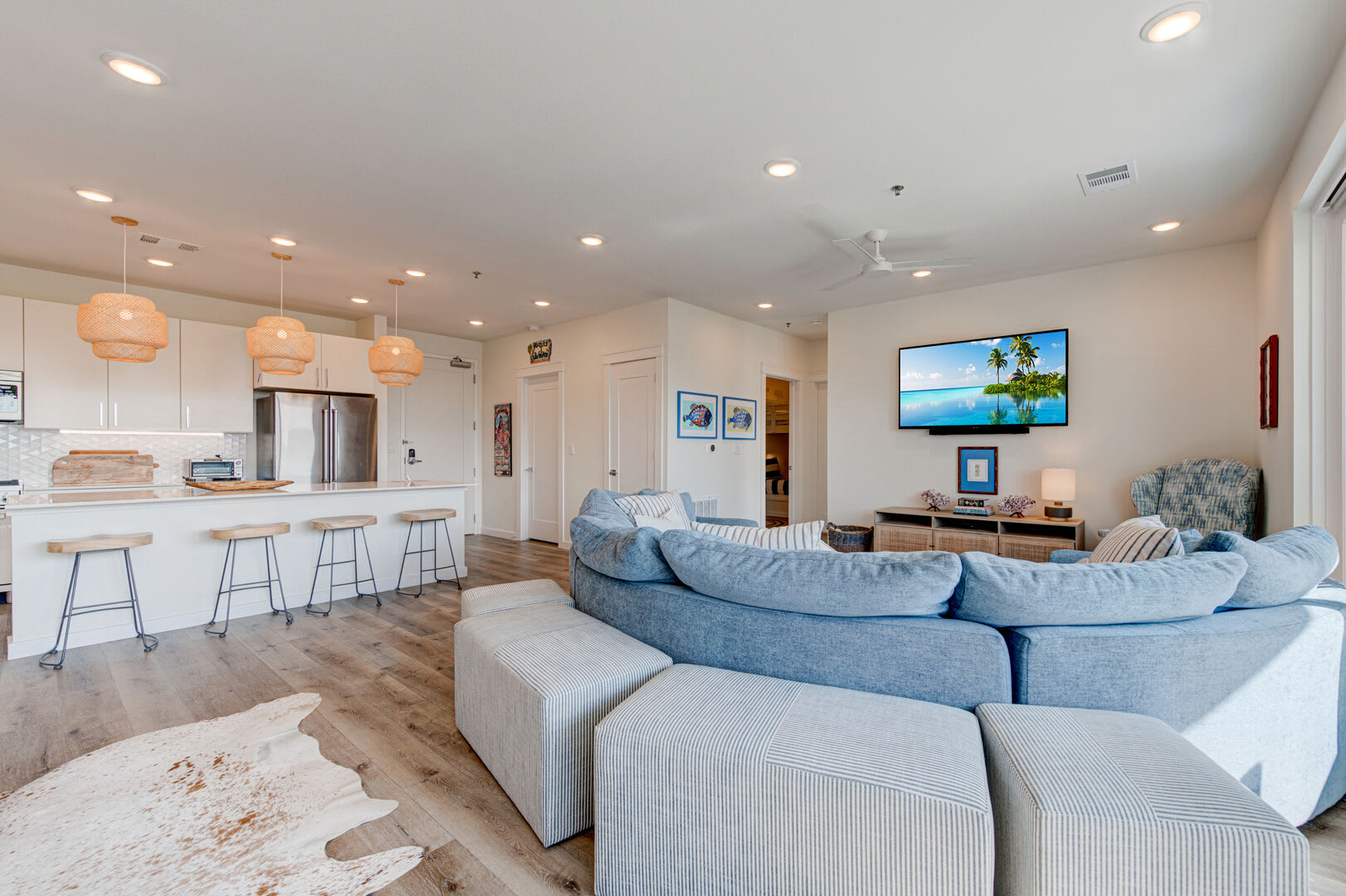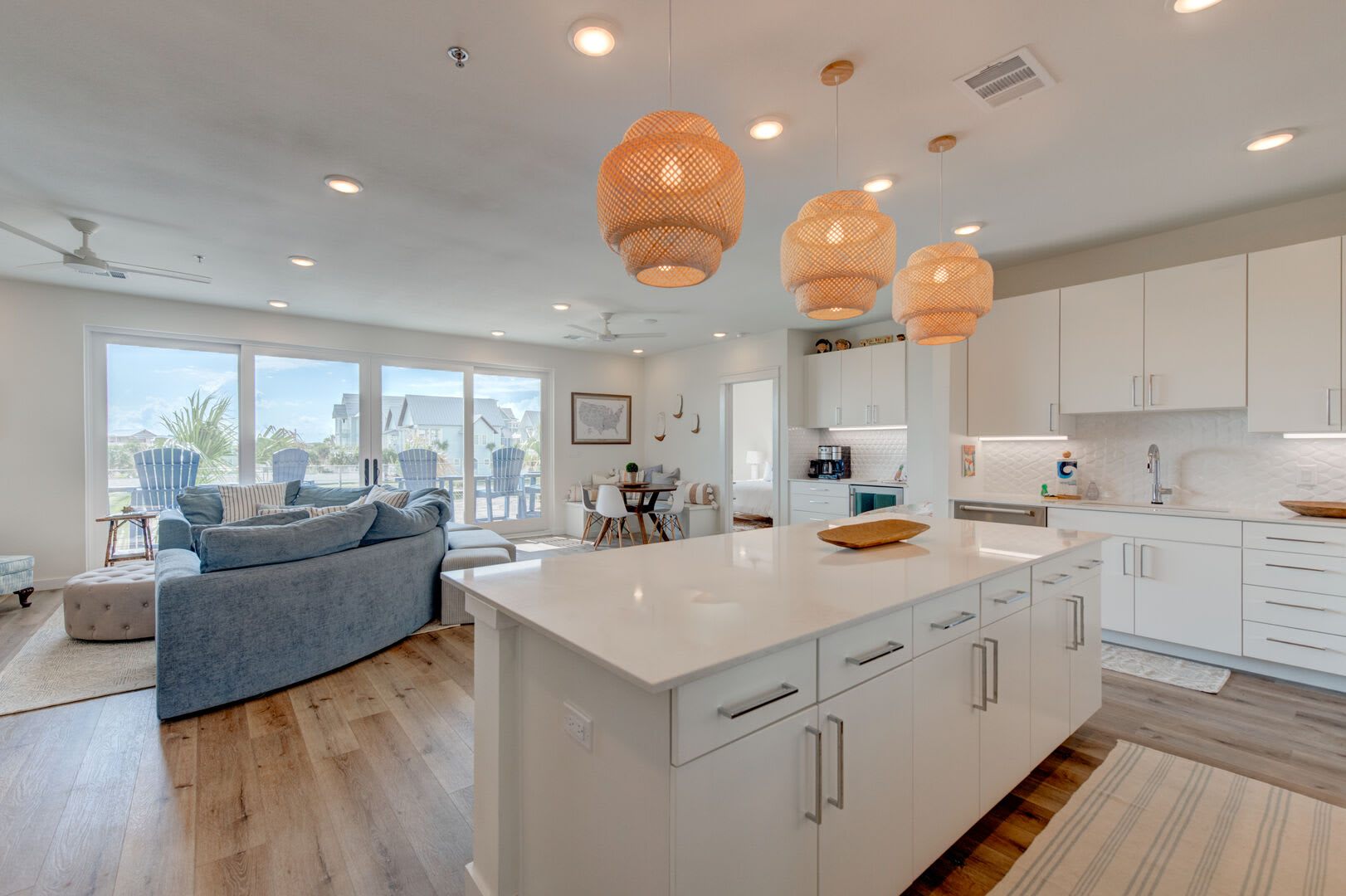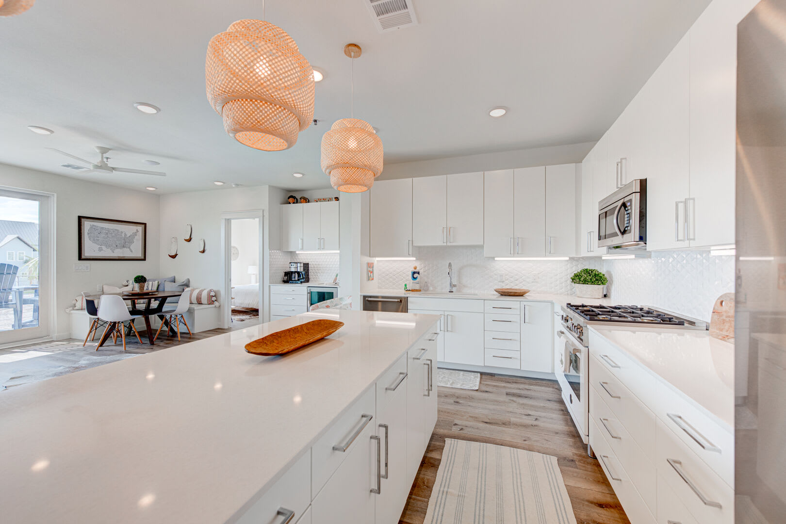 A beautifully furnished living area and plush furniture await inside the entryway. Guests will love settling in for a cozy family night in front of the flat-screen television. The stunning kitchen is perfectly equipped to prepare and enjoy fresh, coastal meals with elite stainless-steel appliances, white cabinetry, and beautiful countertops. The dining table and chairs provide ample seating to enjoy mealtimes together.