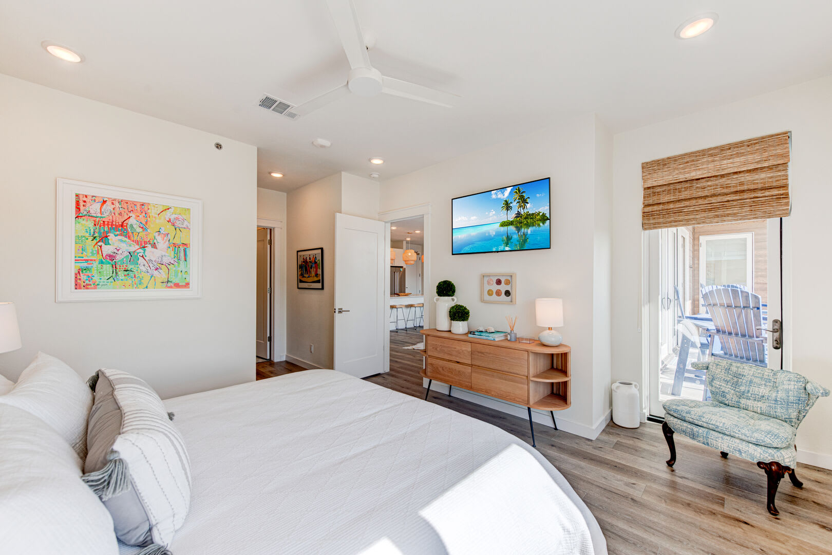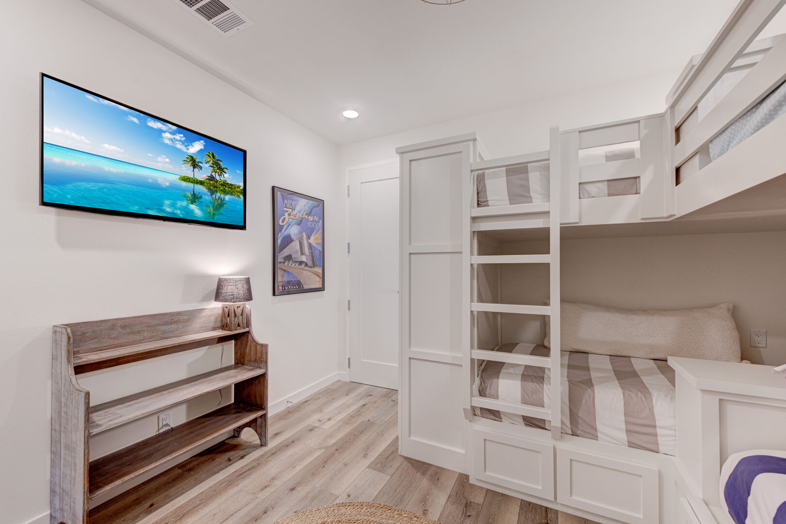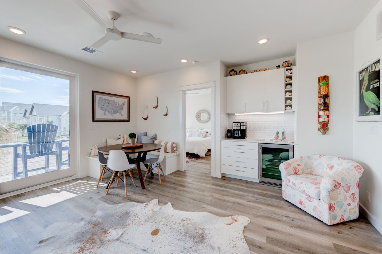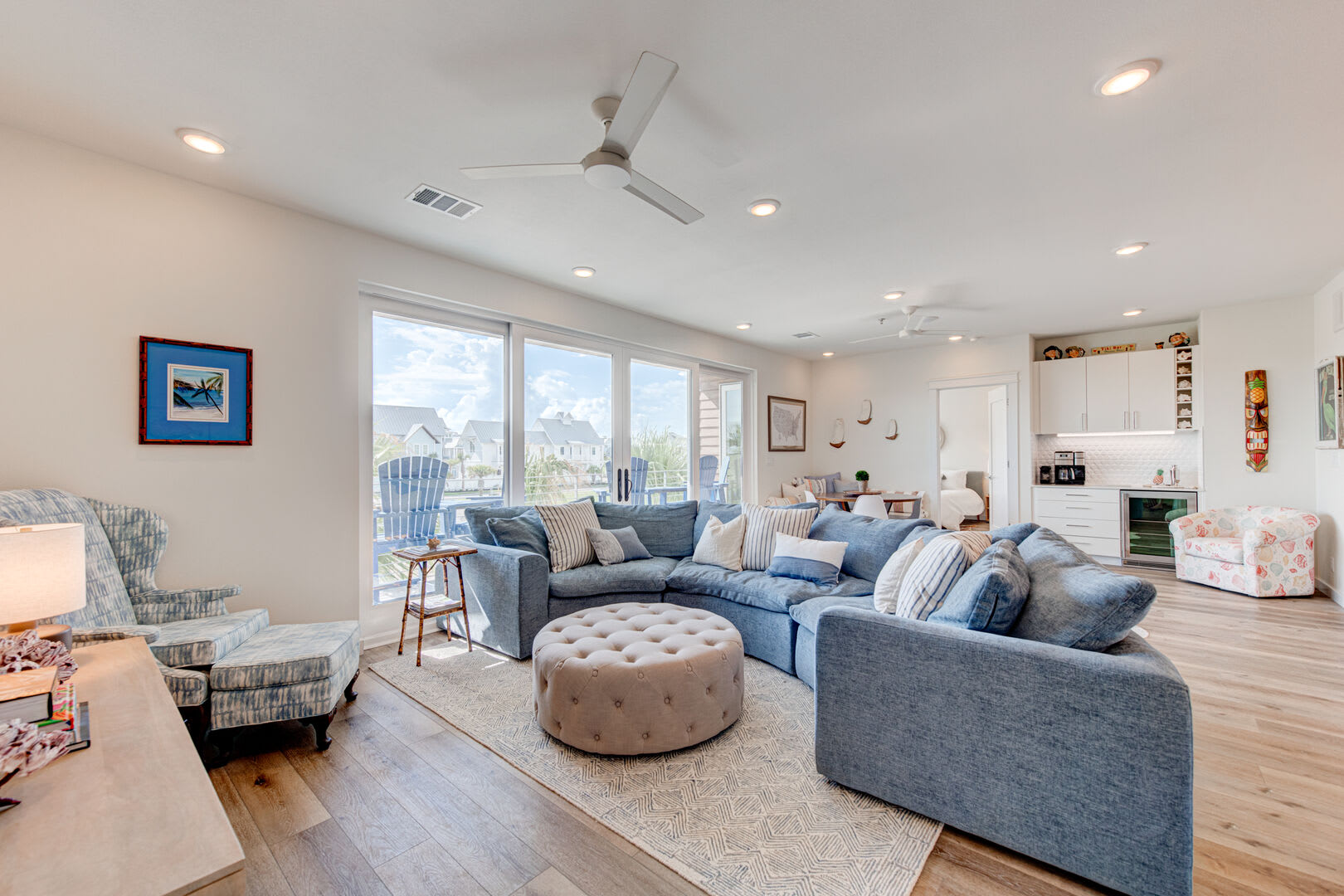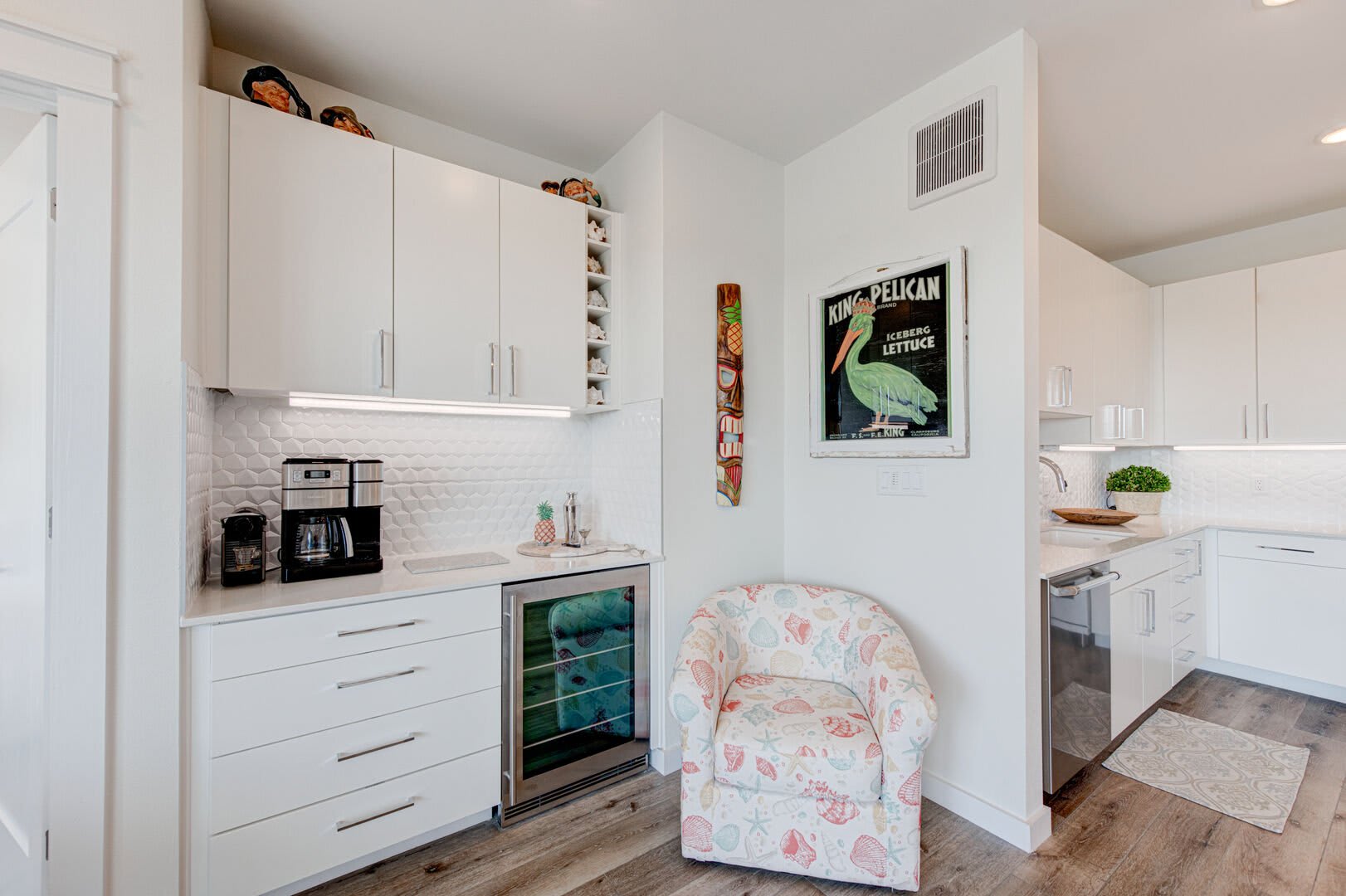A beautifully furnished living area and plush furniture await inside the entryway. Guests will love settling in for a cozy family night in front of the flat-screen television. The stunning kitchen is perfectly equipped to prepare and enjoy fresh, coastal meals with elite stainless-steel appliances, white cabinetry, and beautiful countertops. The dining table and chairs provide ample seating to enjoy mealtimes together.