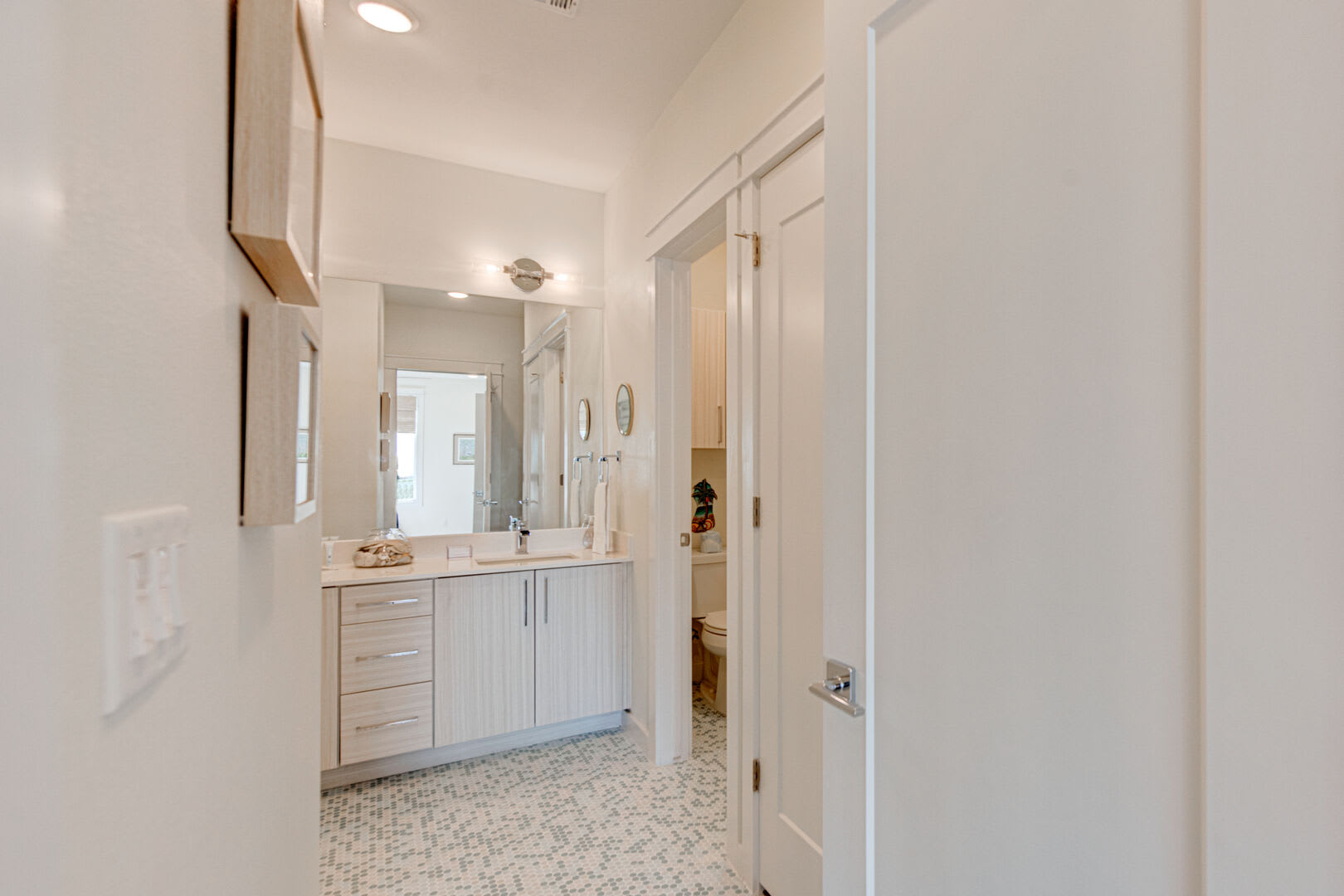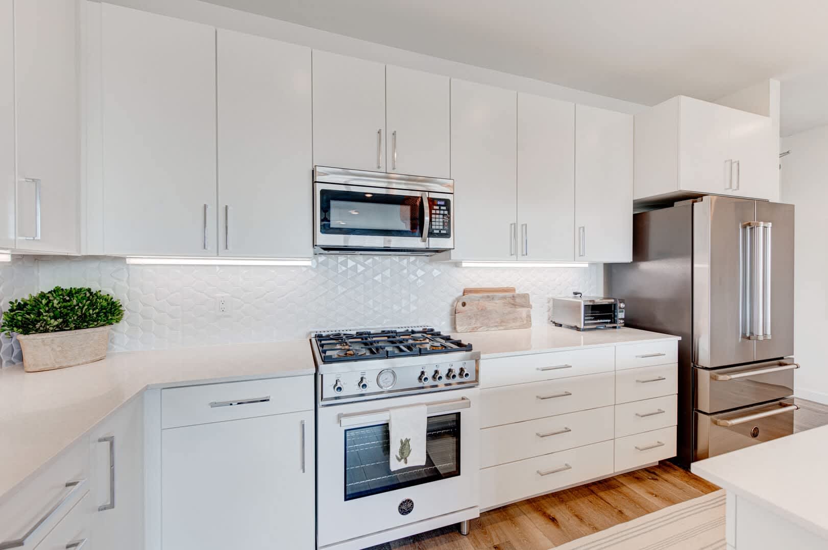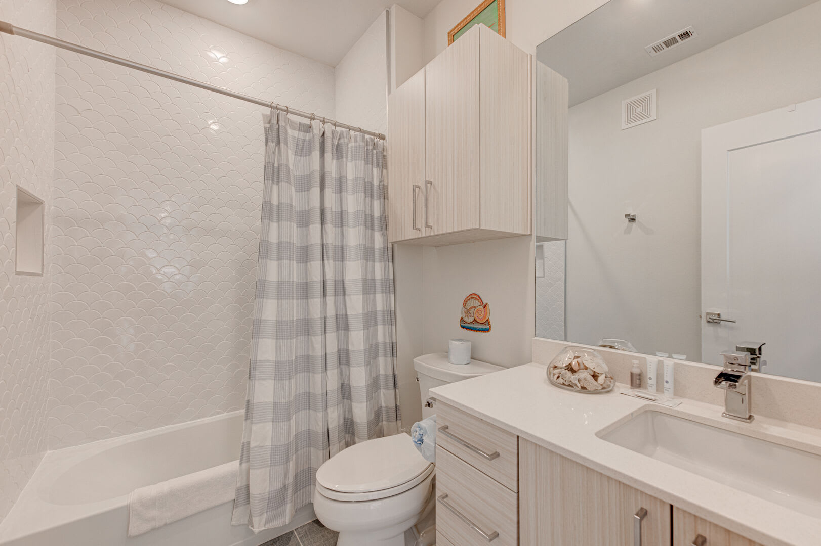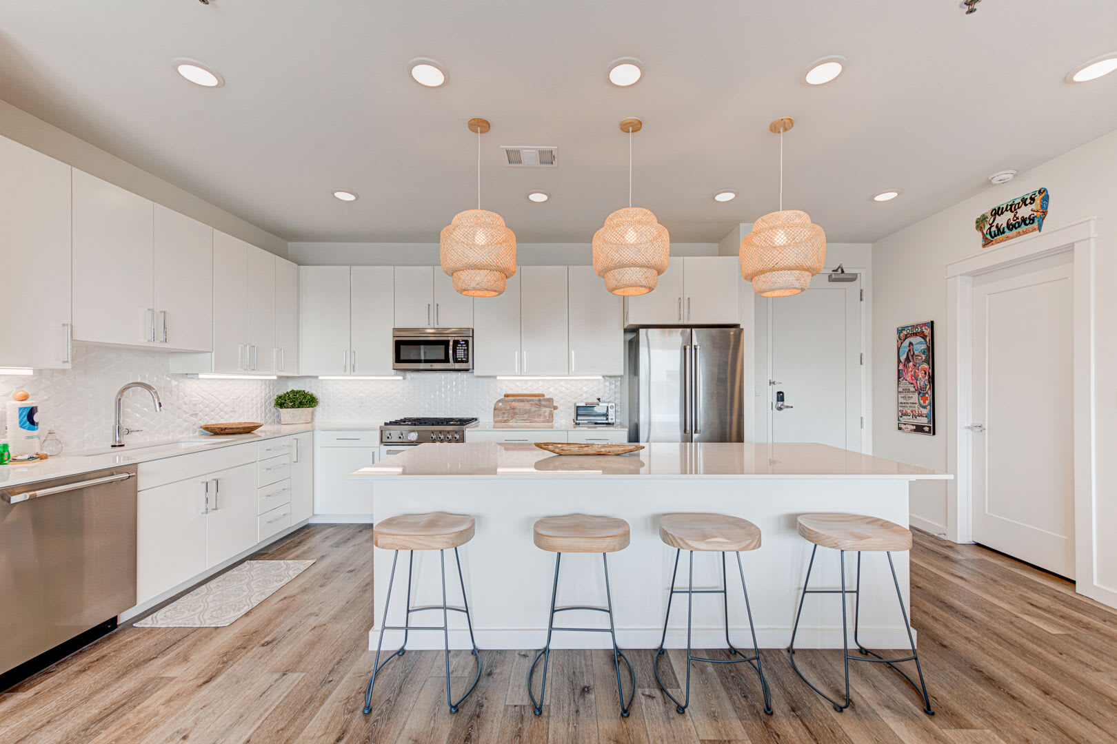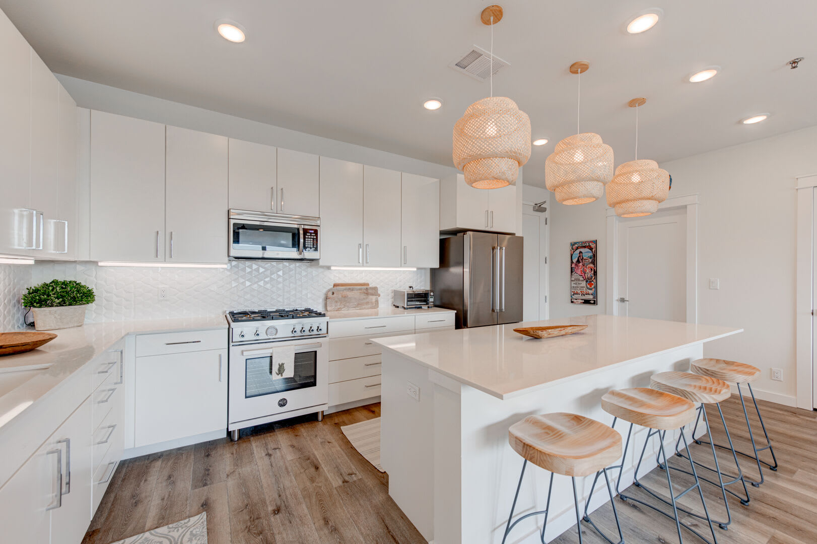 A beautifully furnished living area and plush furniture await inside the entryway. Guests will love settling in for a cozy family night in front of the flat-screen television. The stunning kitchen is perfectly equipped to prepare and enjoy fresh, coastal meals with elite stainless-steel appliances, white cabinetry, and beautiful countertops. The dining table and chairs provide ample seating to enjoy mealtimes together.