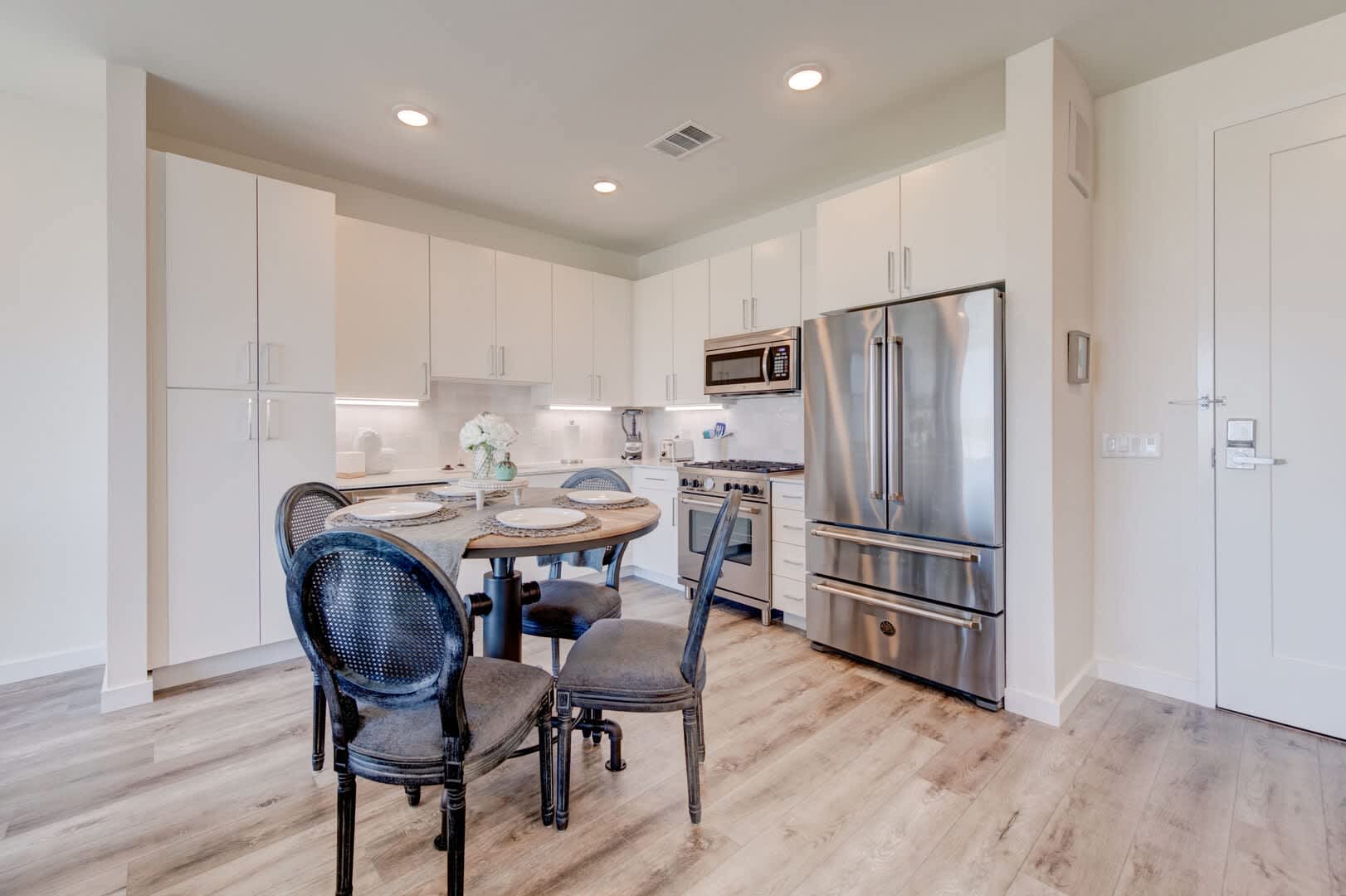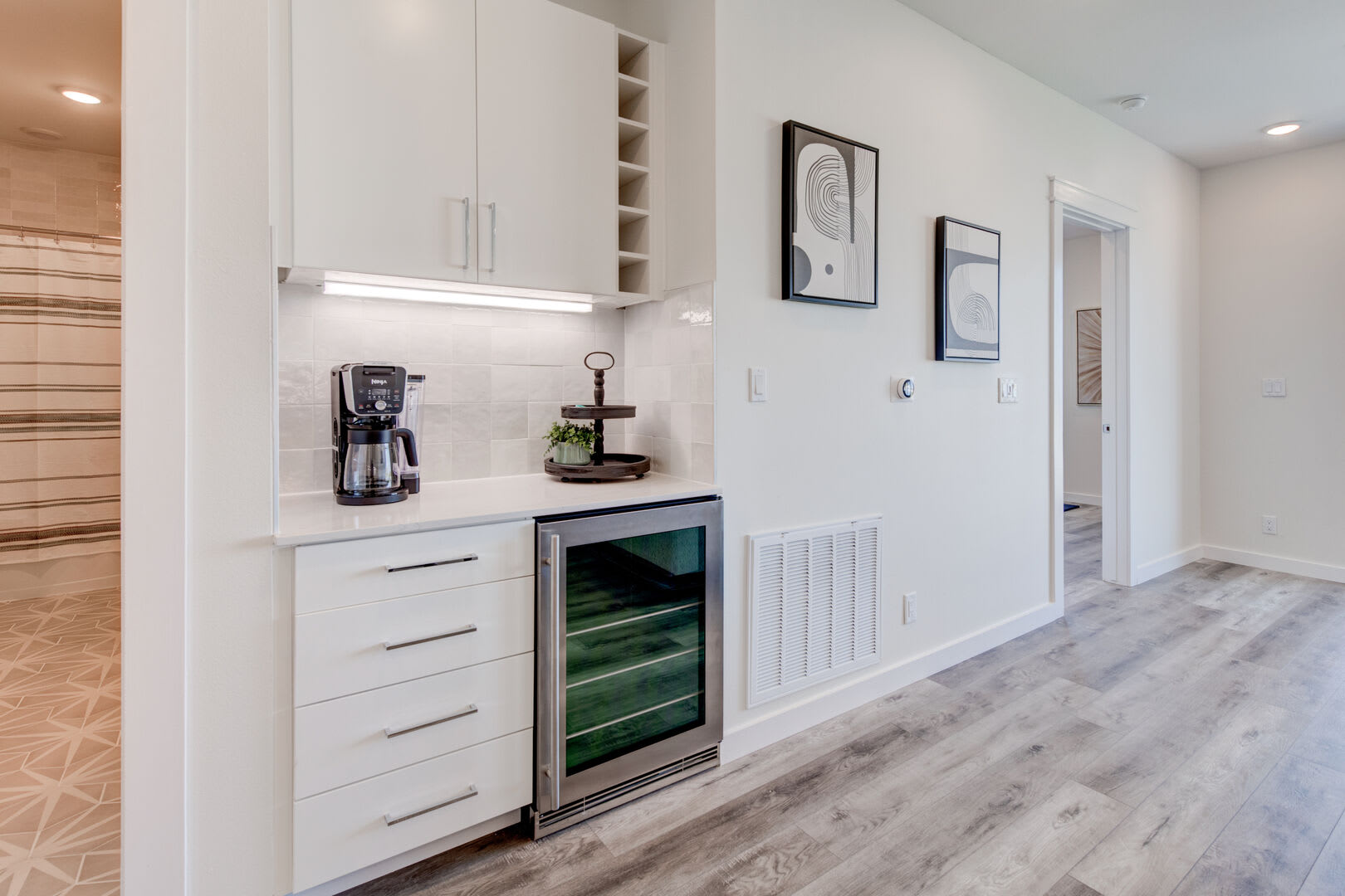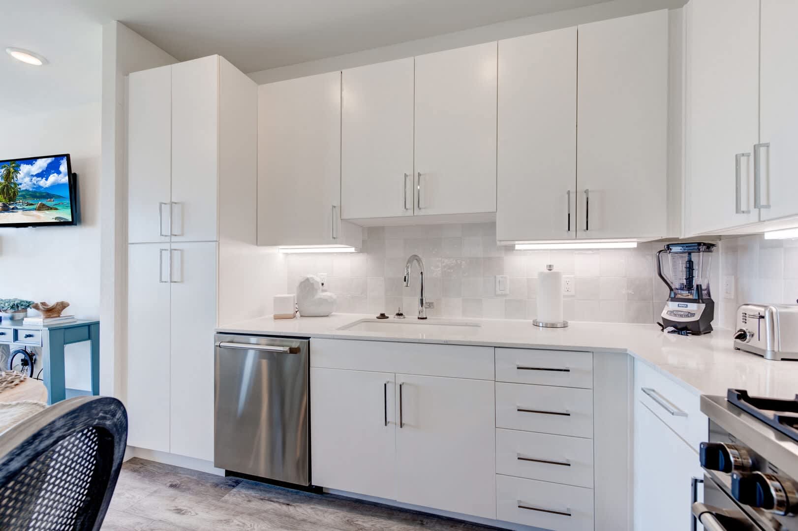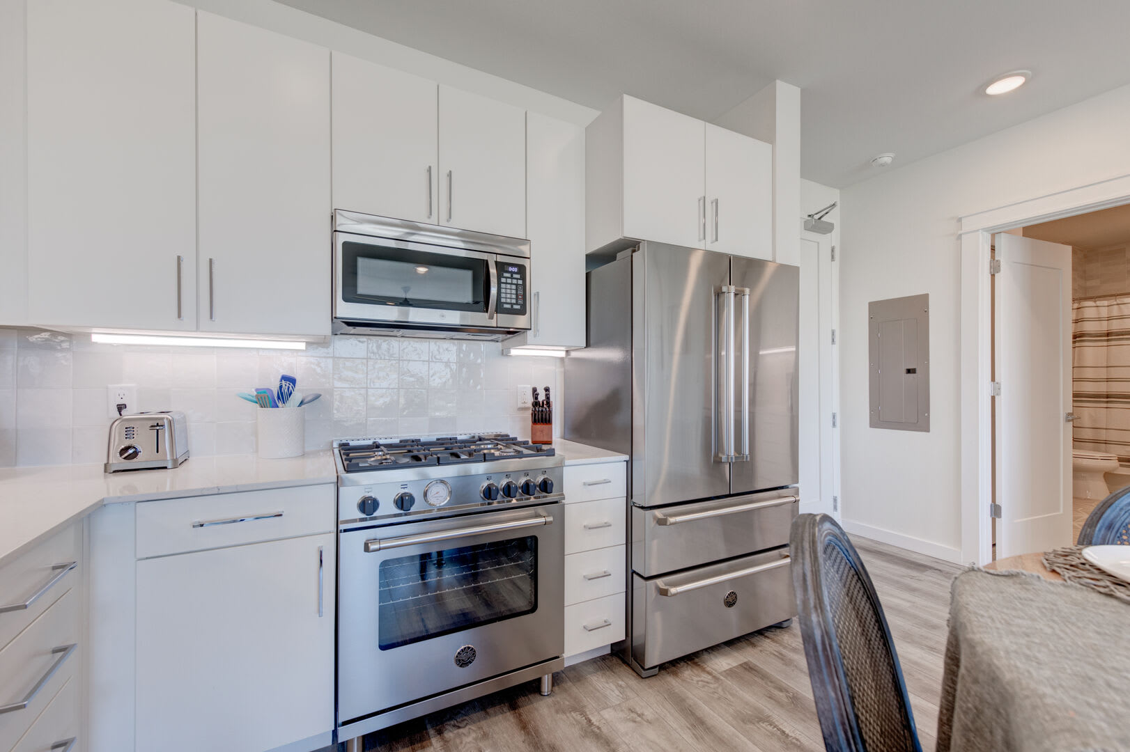 The stunning kitchen is perfectly equipped to prepare and enjoy fresh, coastal meals with elite stainless-steel appliances, white cabinetry, and beautiful countertops. The dining table and 4 chairs provide ample seating to enjoy mealtimes together.