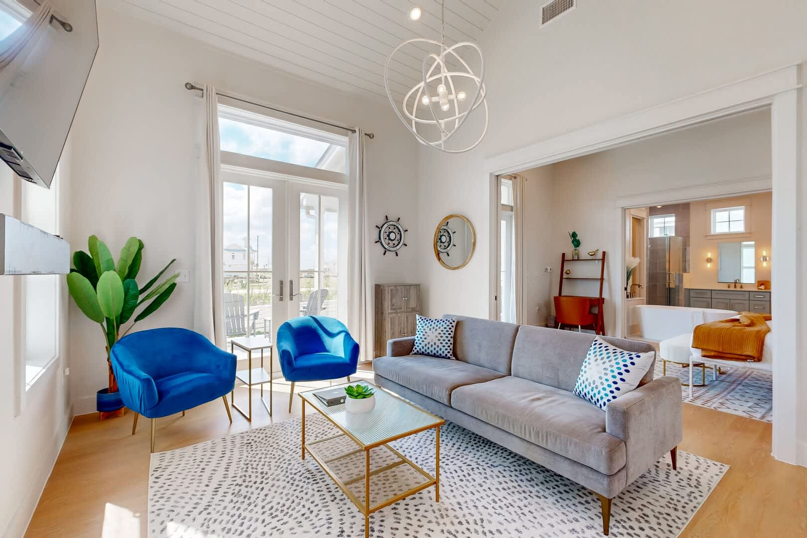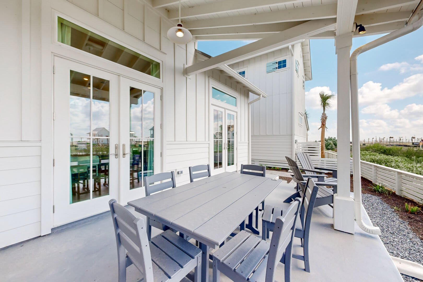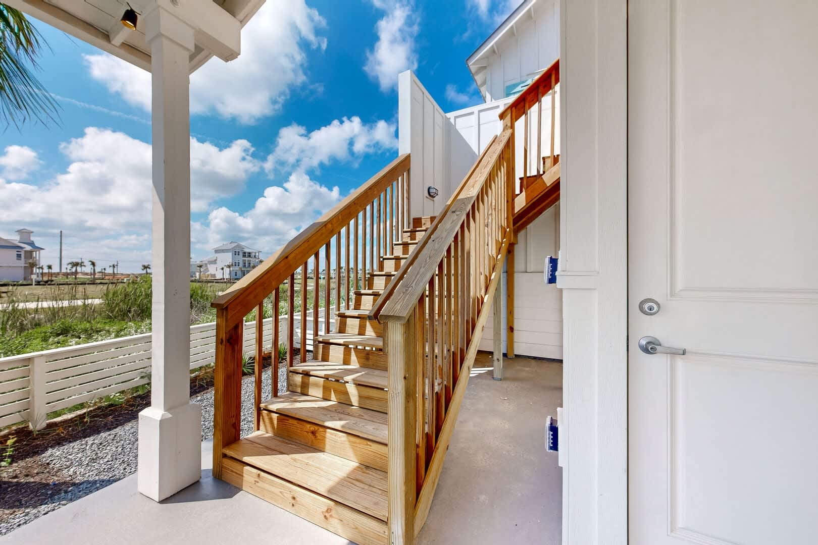 Relish in the coastal breeze on the half-covered porch, complete with a table and chairs, perfect for soaking up the Port A sunshine or stargazing in the evenings. Access the secondary bedroom and bath via the outside stairs, providing a private entrance for guests.