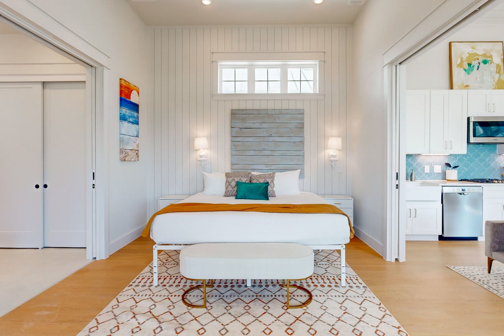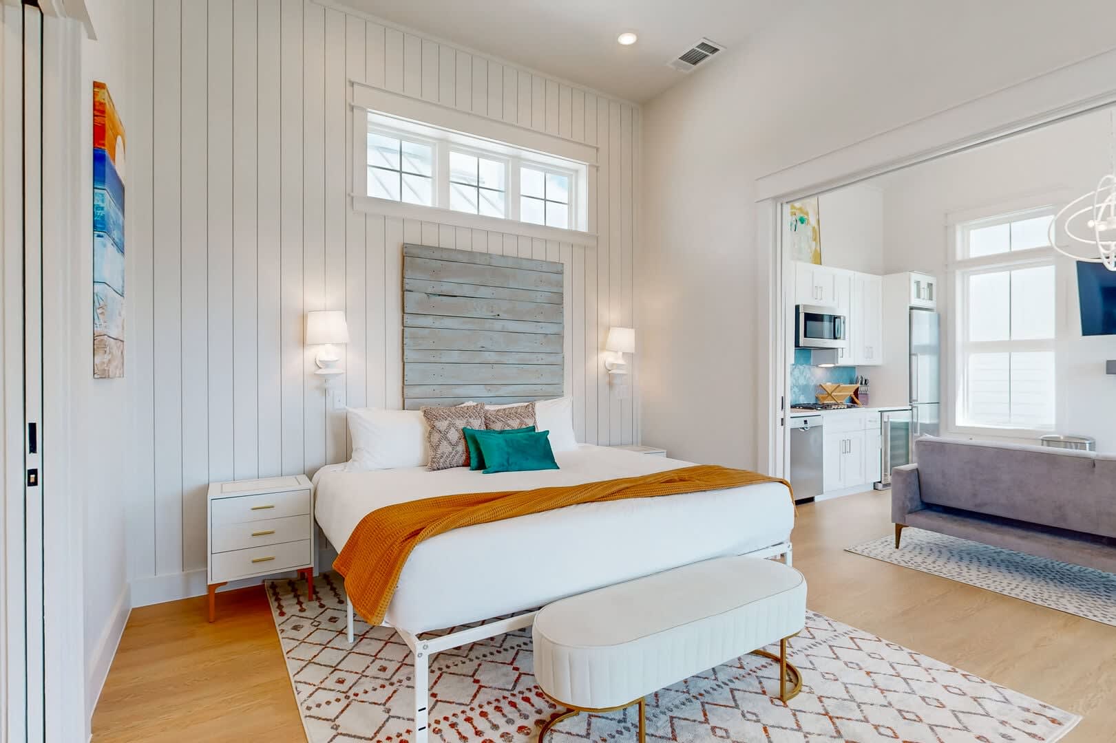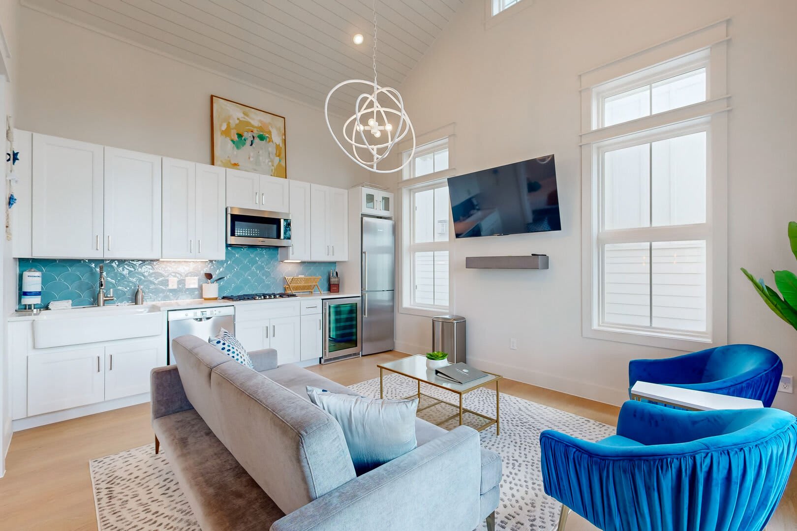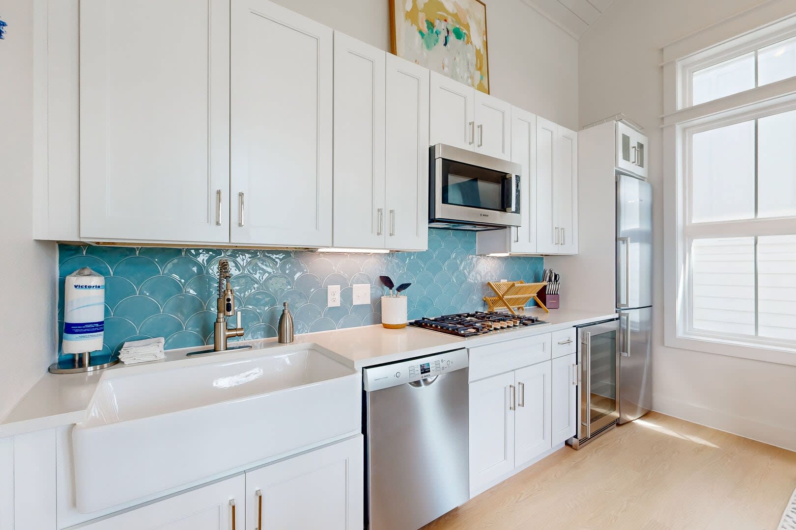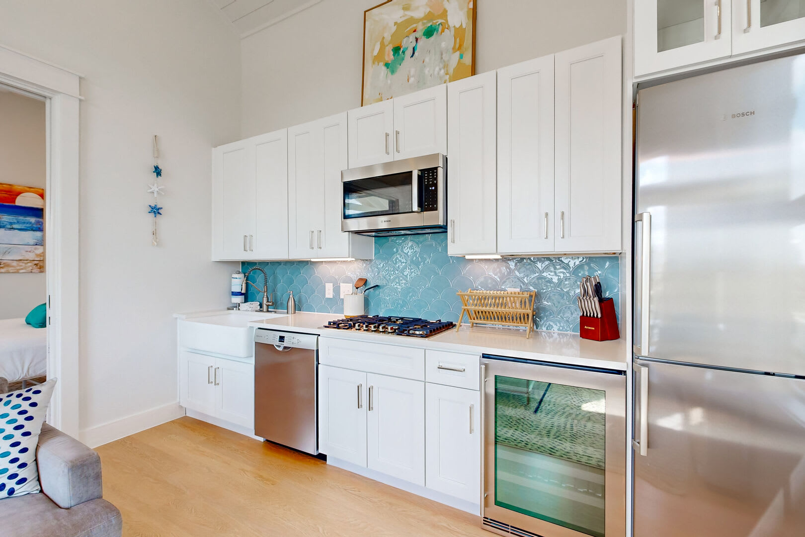 The beautifully designed kitchenette area is fully equipped with top-of-the-line Bosch stainless steel appliances, including a gas cooktop, microwave, wine/beverage fridge, dishwasher, and refrigerator.