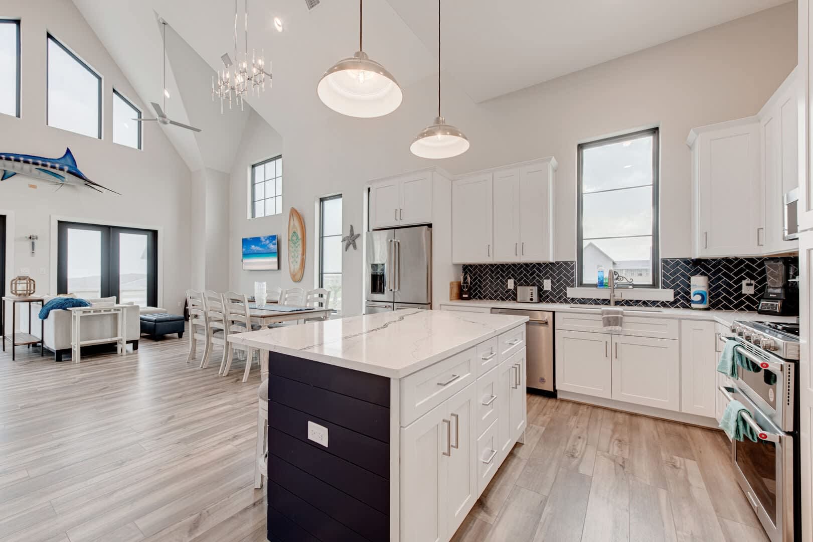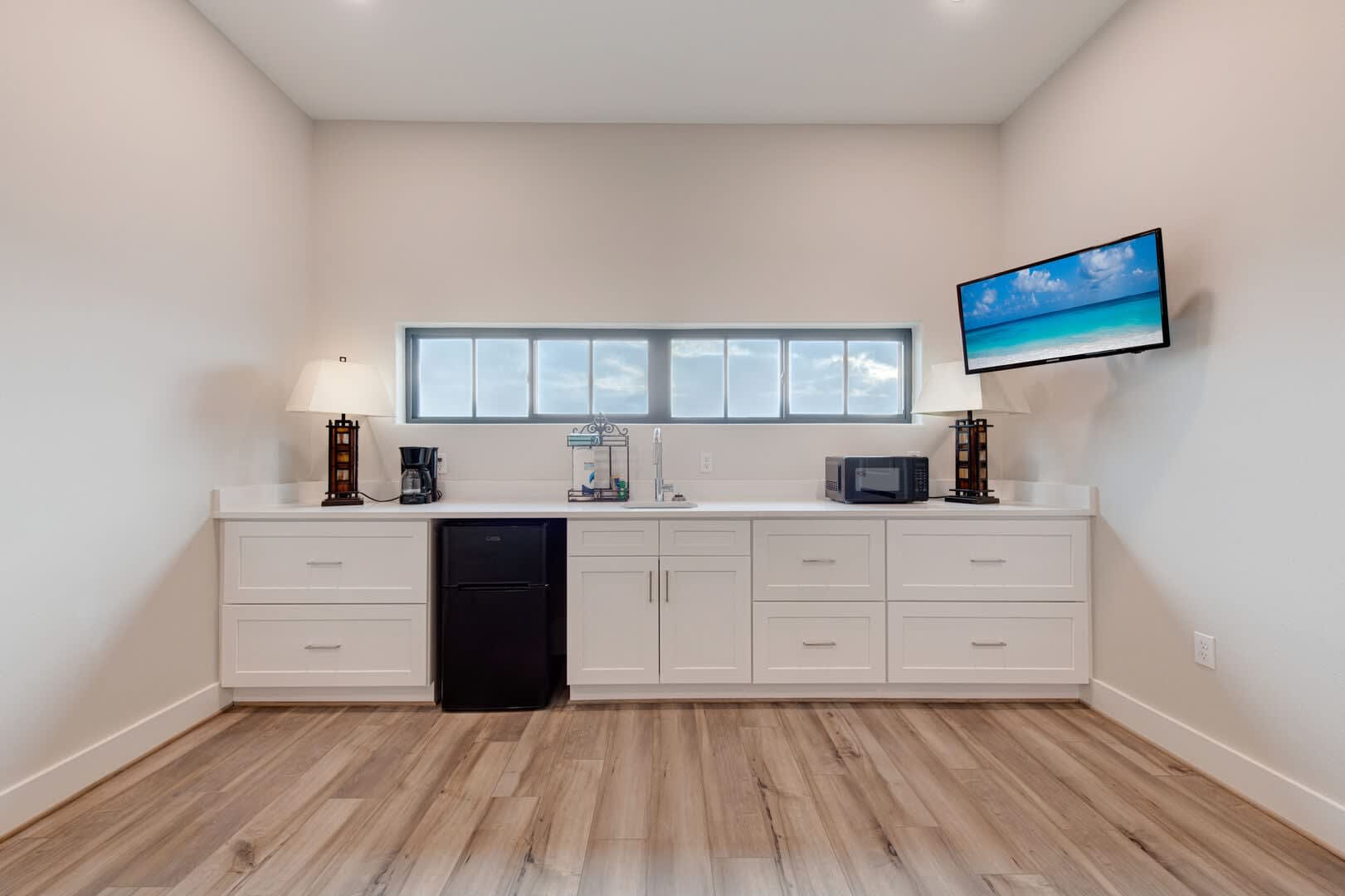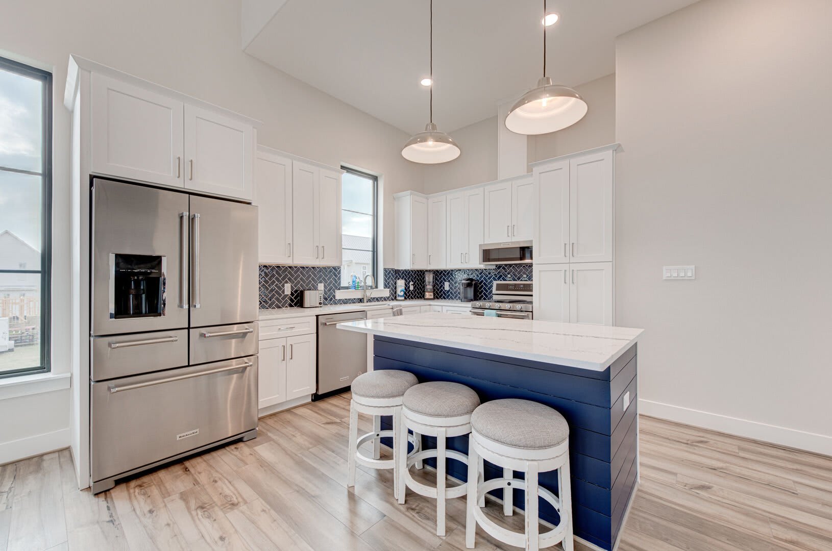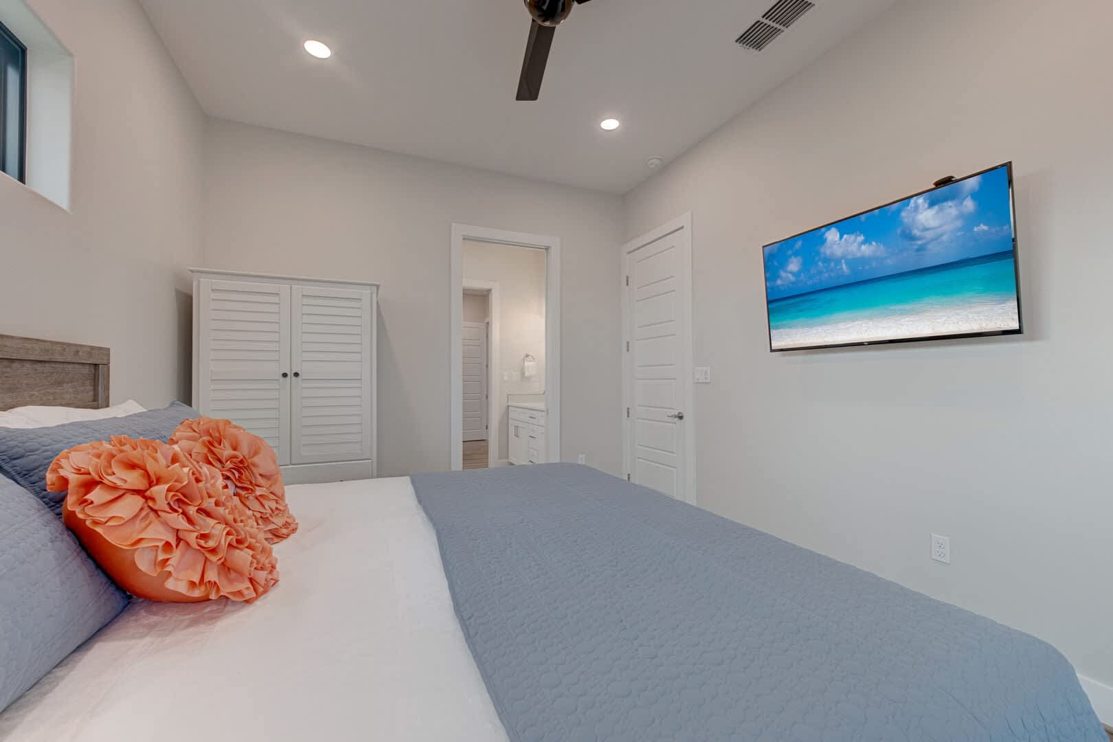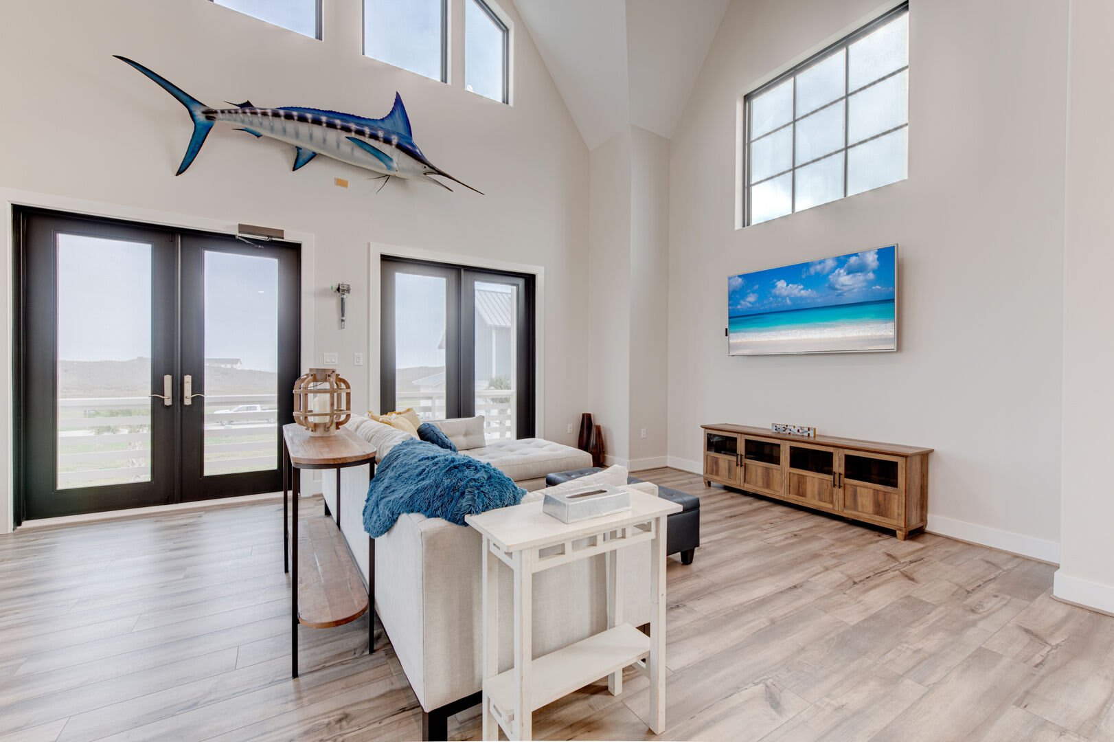 At Last Mango, you’ll sleep like a baby after a long day of Port A adventures in three well-appointed and supremely cozy bedrooms. The front bedroom features a king-size bed with a Smart flat-screen TV and a Jack and Jill bathroom shared with the second bedroom. The second bedroom has a queen-size bed and a flat-screen TV. The shared bathroom has a walk-in shower and dual vanities with quartz countertops. The primary bedroom is located on the second floor and has a king-size bed, a Smart flat-screen TV, and a private balcony with bay views, perfect for viewing gorgeous coastal sunsets. The primary bathroom features a walk-in shower, cathedral ceilings, and a backlit, double vanity. Left your charger at home? This bedroom has nightstands with wireless charging stations. Additional guests can use the queen-size sleeper sofa in the flexible bonus space.