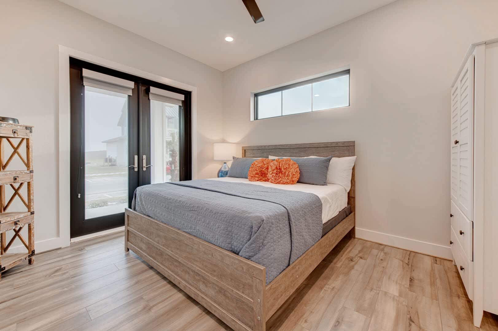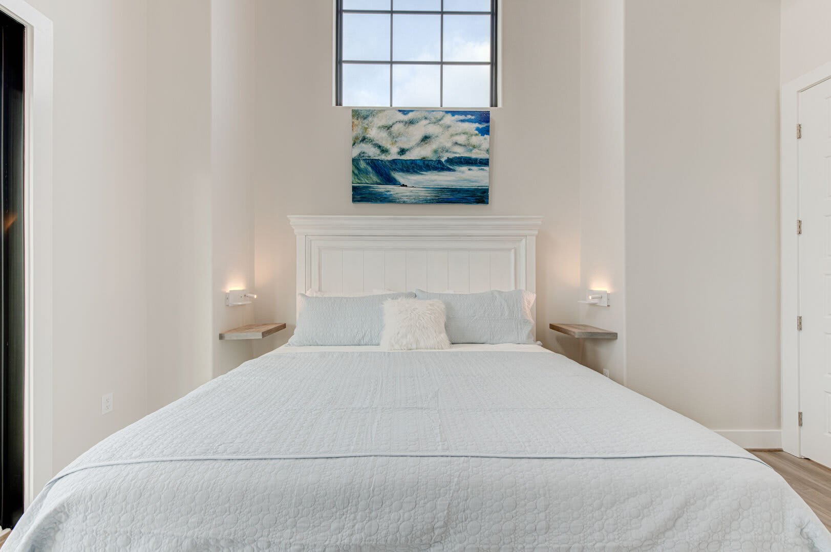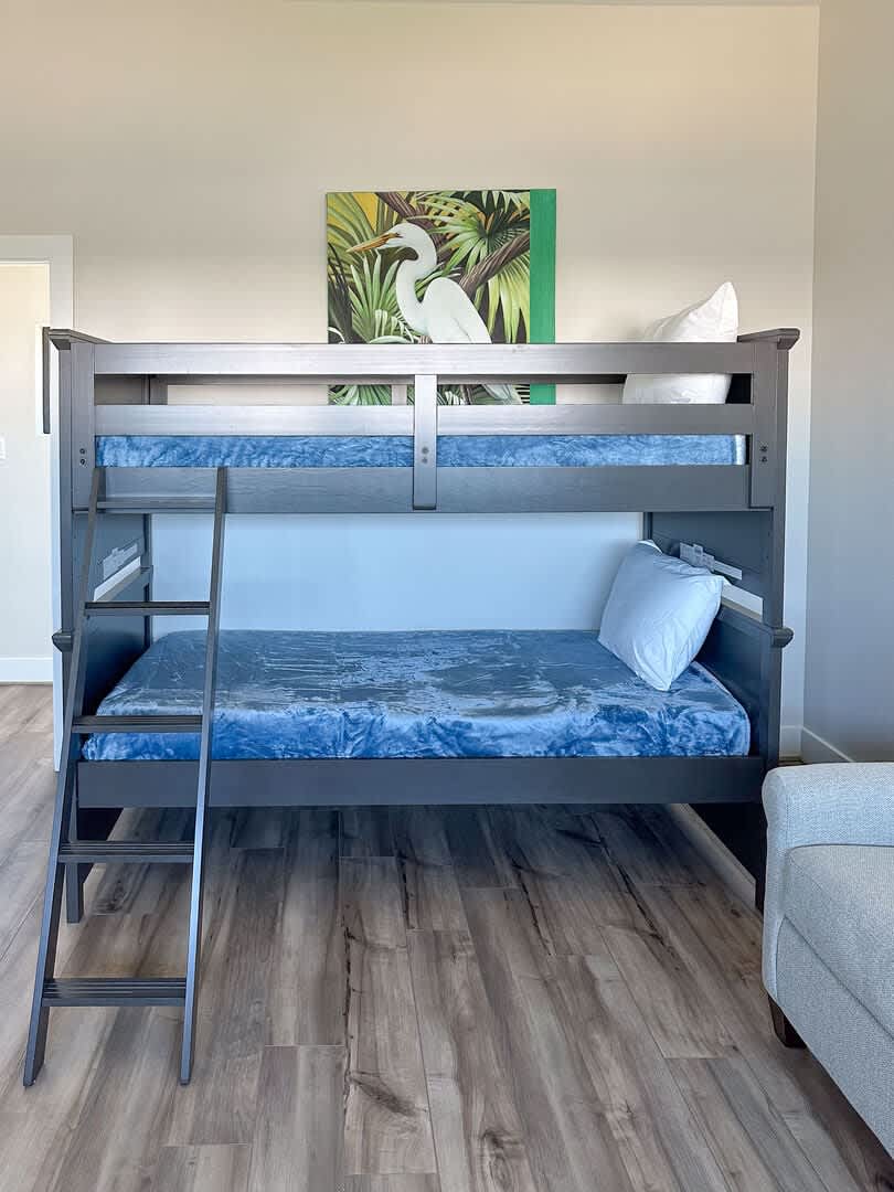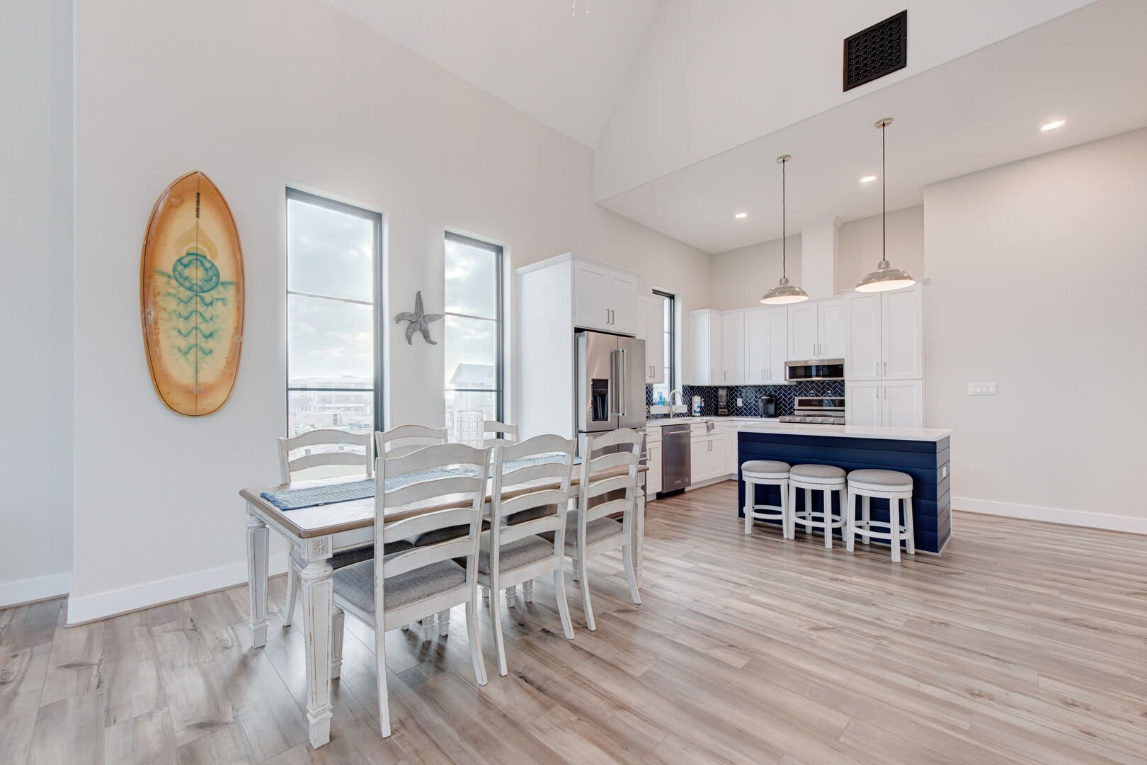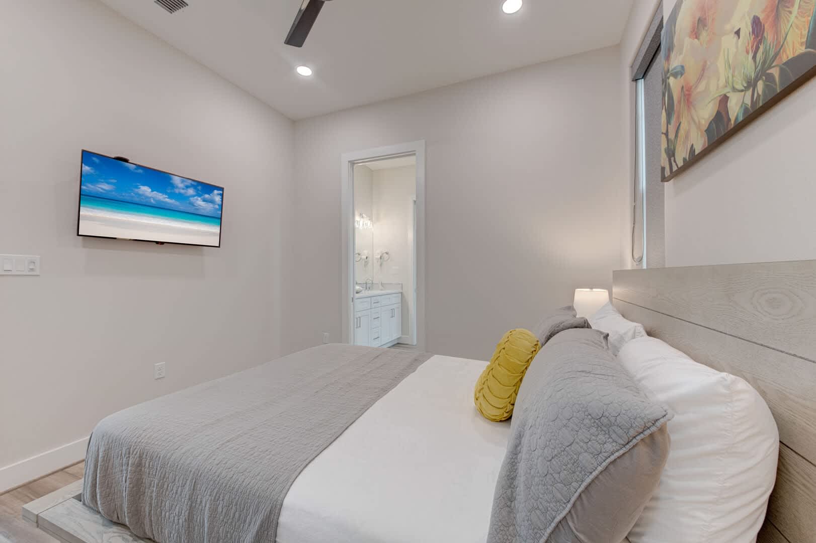 At Last Mango, you’ll sleep like a baby after a long day of Port A adventures in three well-appointed and supremely cozy bedrooms. The front bedroom features a king-size bed with a Smart flat-screen TV and a Jack and Jill bathroom shared with the second bedroom. The second bedroom has a queen-size bed and a flat-screen TV. The shared bathroom has a walk-in shower and dual vanities with quartz countertops. The primary bedroom is located on the second floor and has a king-size bed, a Smart flat-screen TV, and a private balcony with bay views, perfect for viewing gorgeous coastal sunsets. The primary bathroom features a walk-in shower, cathedral ceilings, and a backlit, double vanity. Left your charger at home? This bedroom has nightstands with wireless charging stations. Additional guests can use the queen-size sleeper sofa in the flexible bonus space.