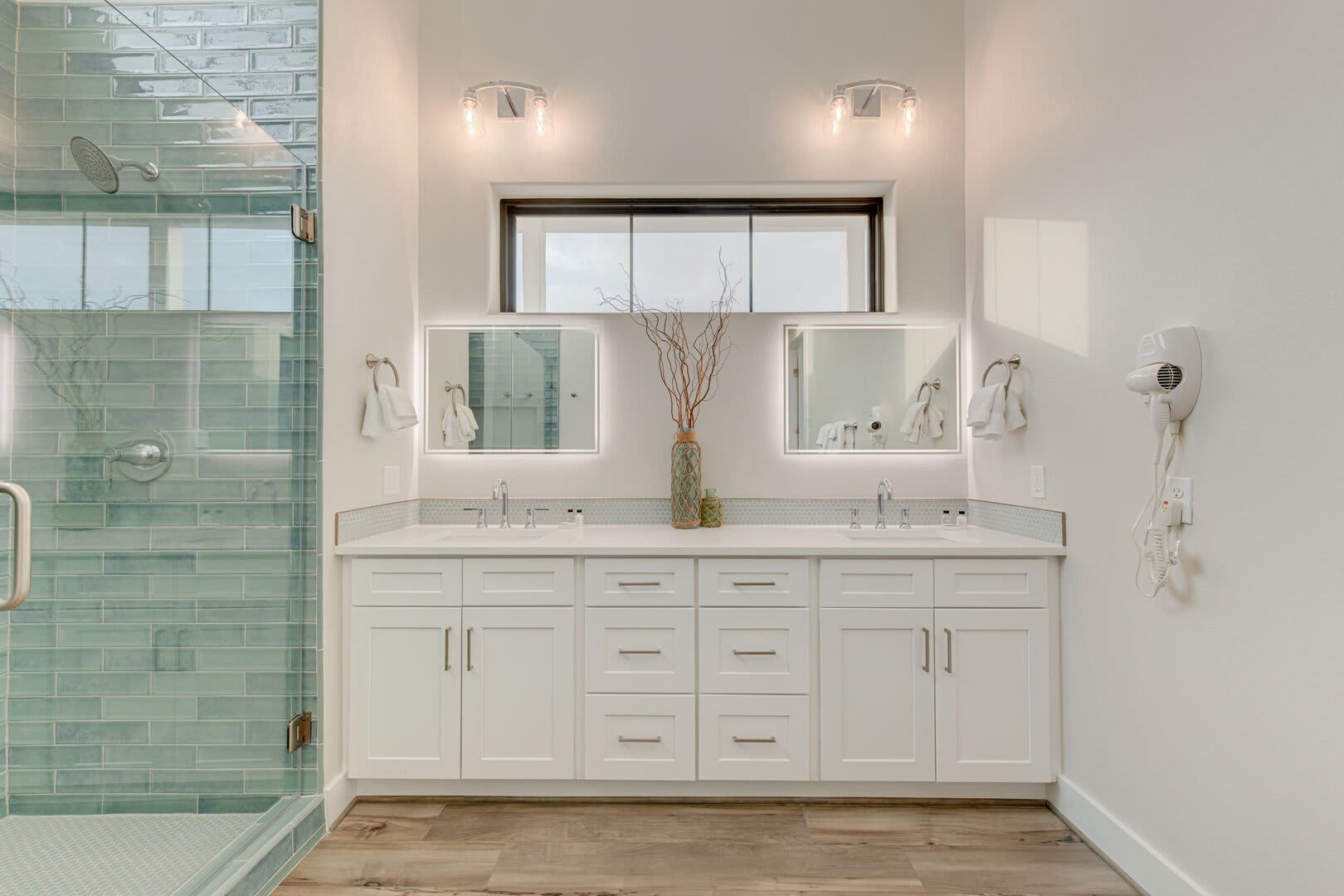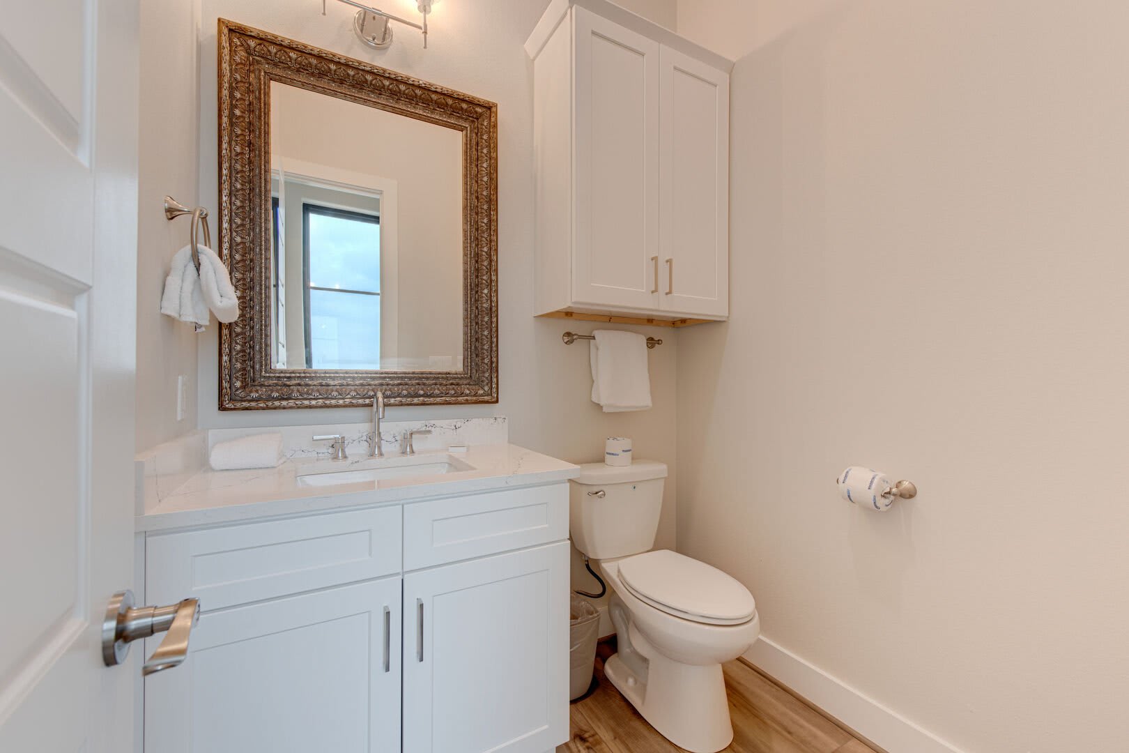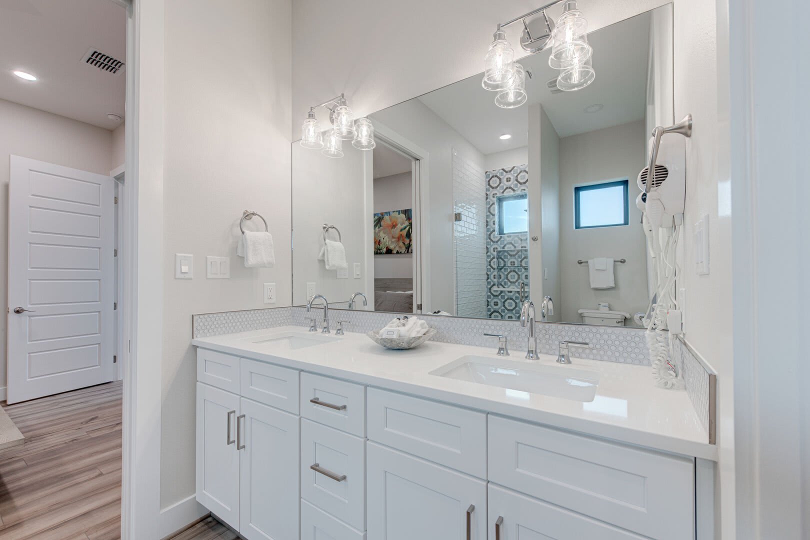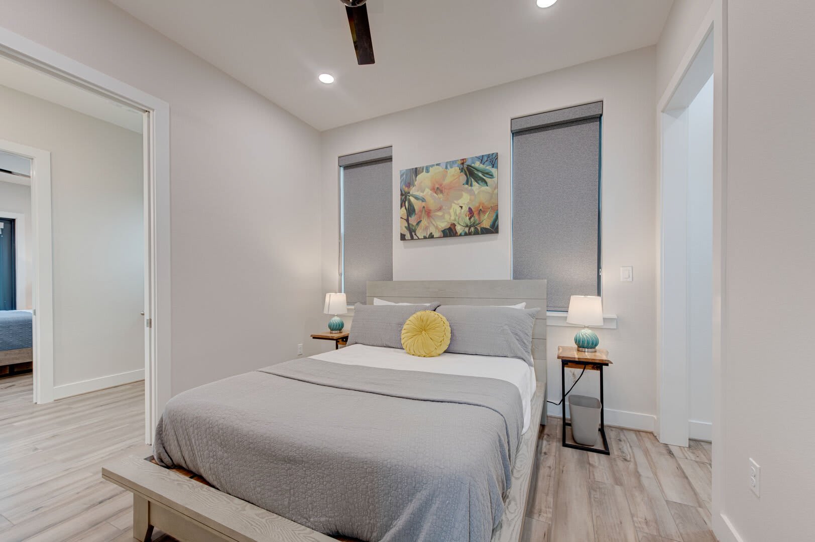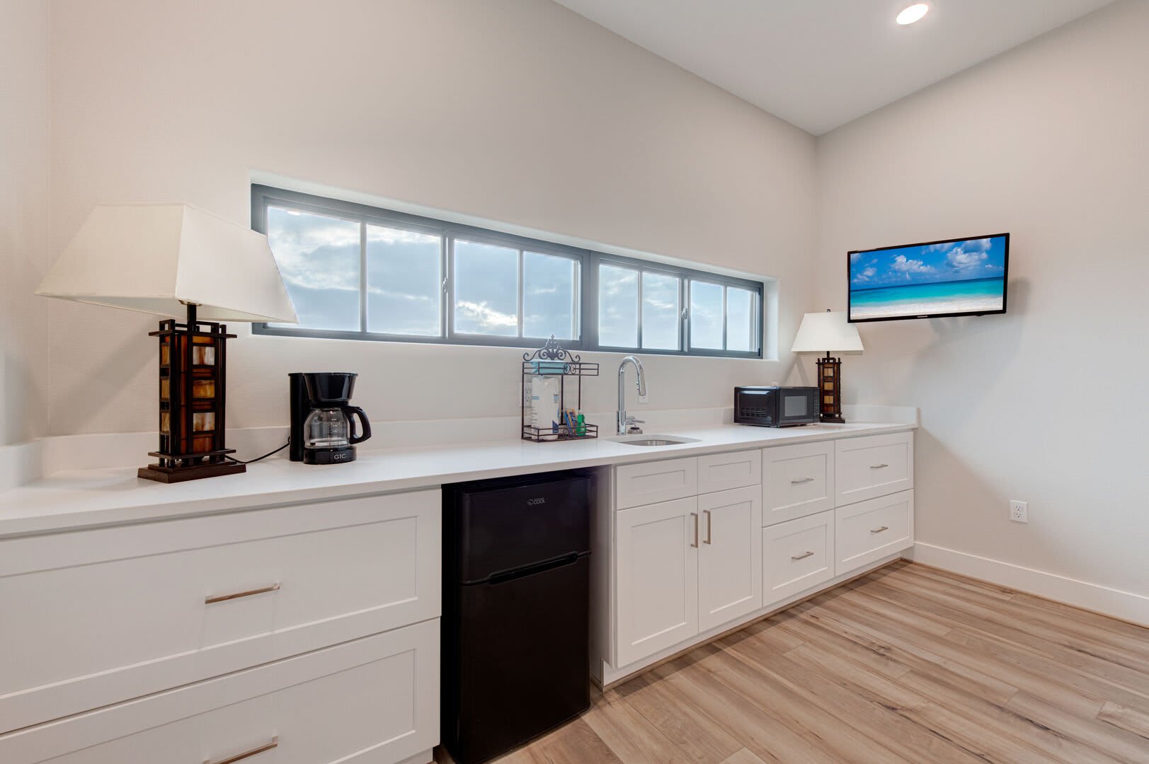 At Last Mango, you’ll sleep like a baby after a long day of Port A adventures in three well-appointed and supremely cozy bedrooms. The front bedroom features a king-size bed with a Smart flat-screen TV and a Jack and Jill bathroom shared with the second bedroom. The second bedroom has a queen-size bed and a flat-screen TV. The shared bathroom has a walk-in shower and dual vanities with quartz countertops. The primary bedroom is located on the second floor and has a king-size bed, a Smart flat-screen TV, and a private balcony with bay views, perfect for viewing gorgeous coastal sunsets. The primary bathroom features a walk-in shower, cathedral ceilings, and a backlit, double vanity. Left your charger at home? This bedroom has nightstands with wireless charging stations. Additional guests can use the queen-size sleeper sofa in the flexible bonus space.