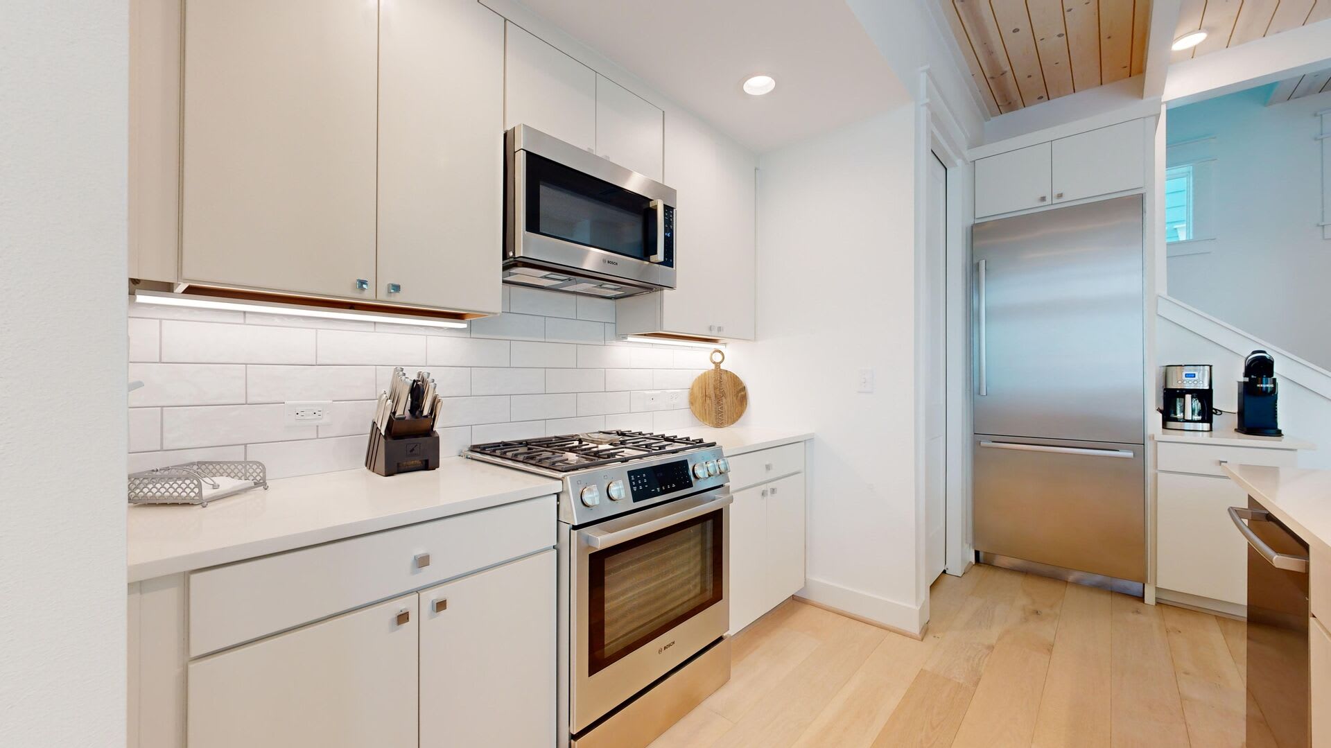 The fully stocked kitchen is a chef's dream, equipped with top-of-the-line stainless Bosch appliances, including an air fryer, blender, toaster, and much more, making meal prep a breeze. A convenient half bath on the first level adds to the home's functionality.