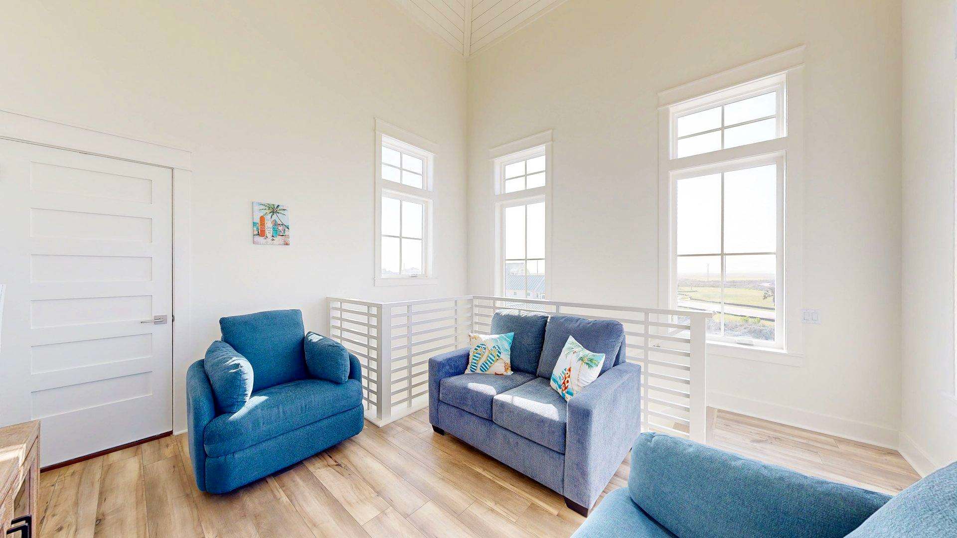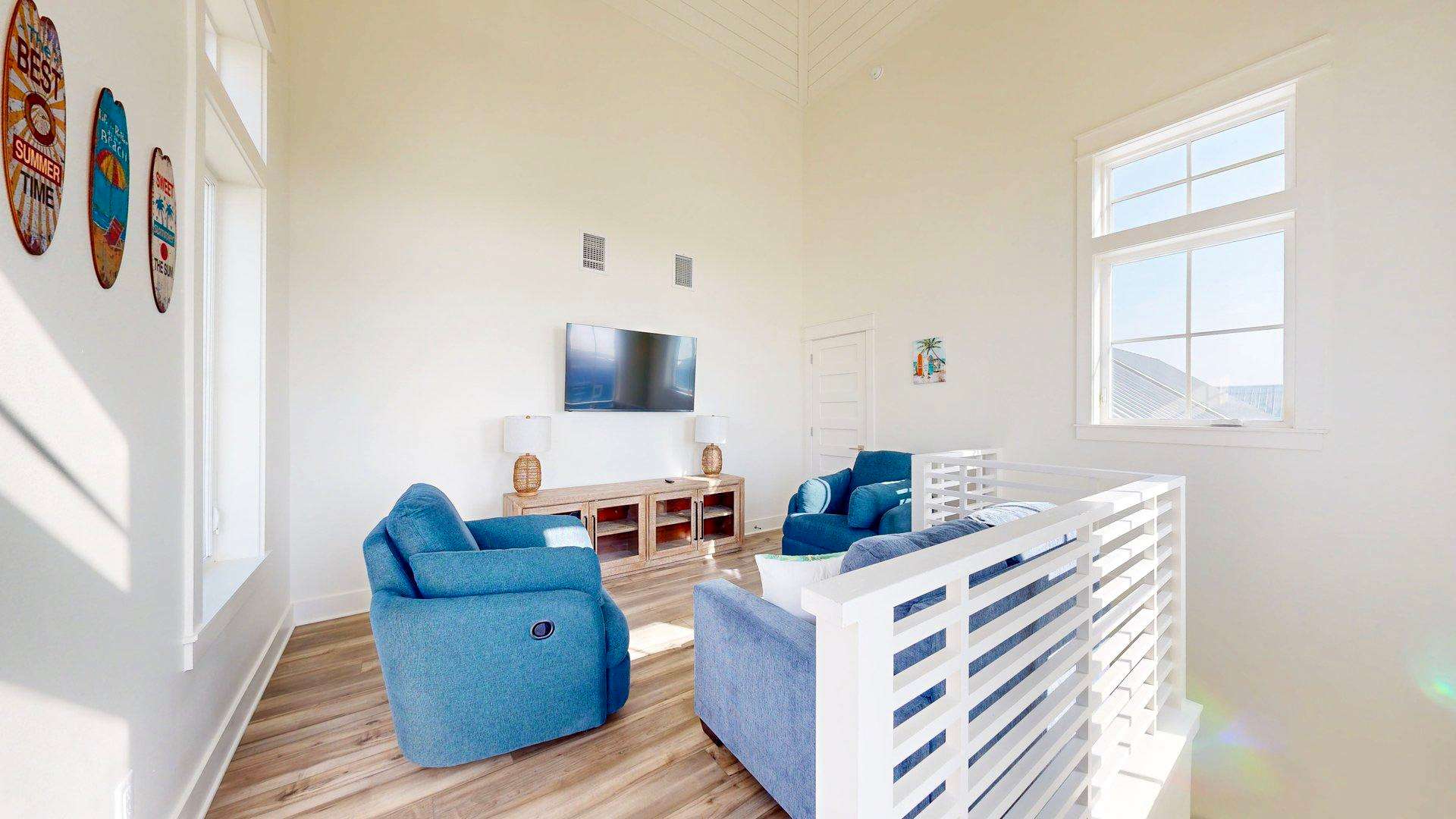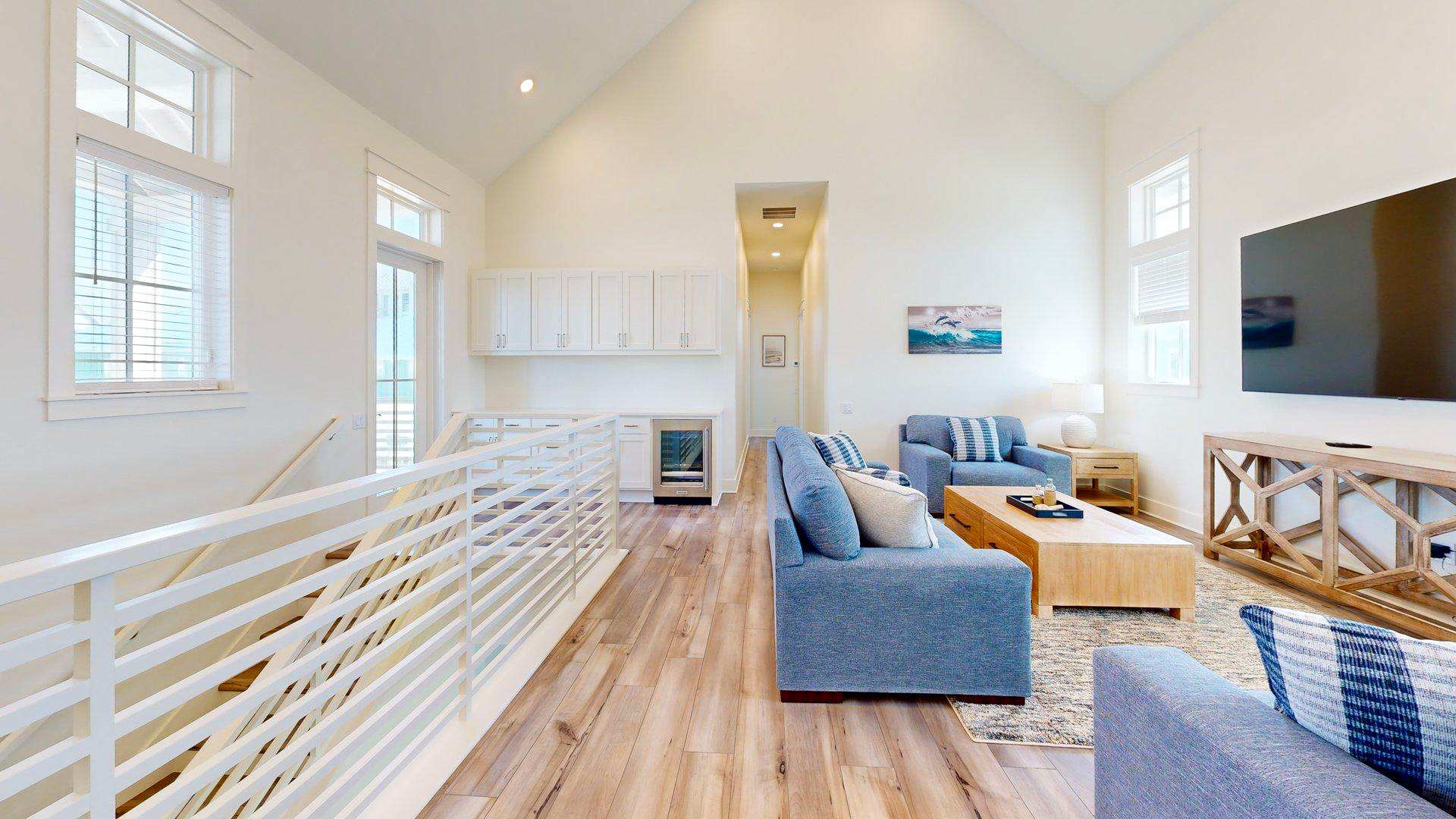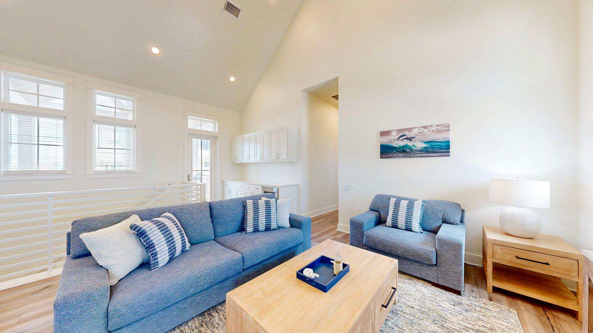 Venture to the second level, where another inviting living room awaits, complete with two fold-out queen sleeper sofas, a side chair, and a TV for added relaxation. This level also features a kitchenette area with a mini fridge for snacks and drinks, along with five balconies furnished for you to soak up the warm Port A sunshine. With four bedrooms on this level, three with their own ensuite baths, and an additional full bath off the hallway, there’s plenty of space for everyone to enjoy their own privacy.