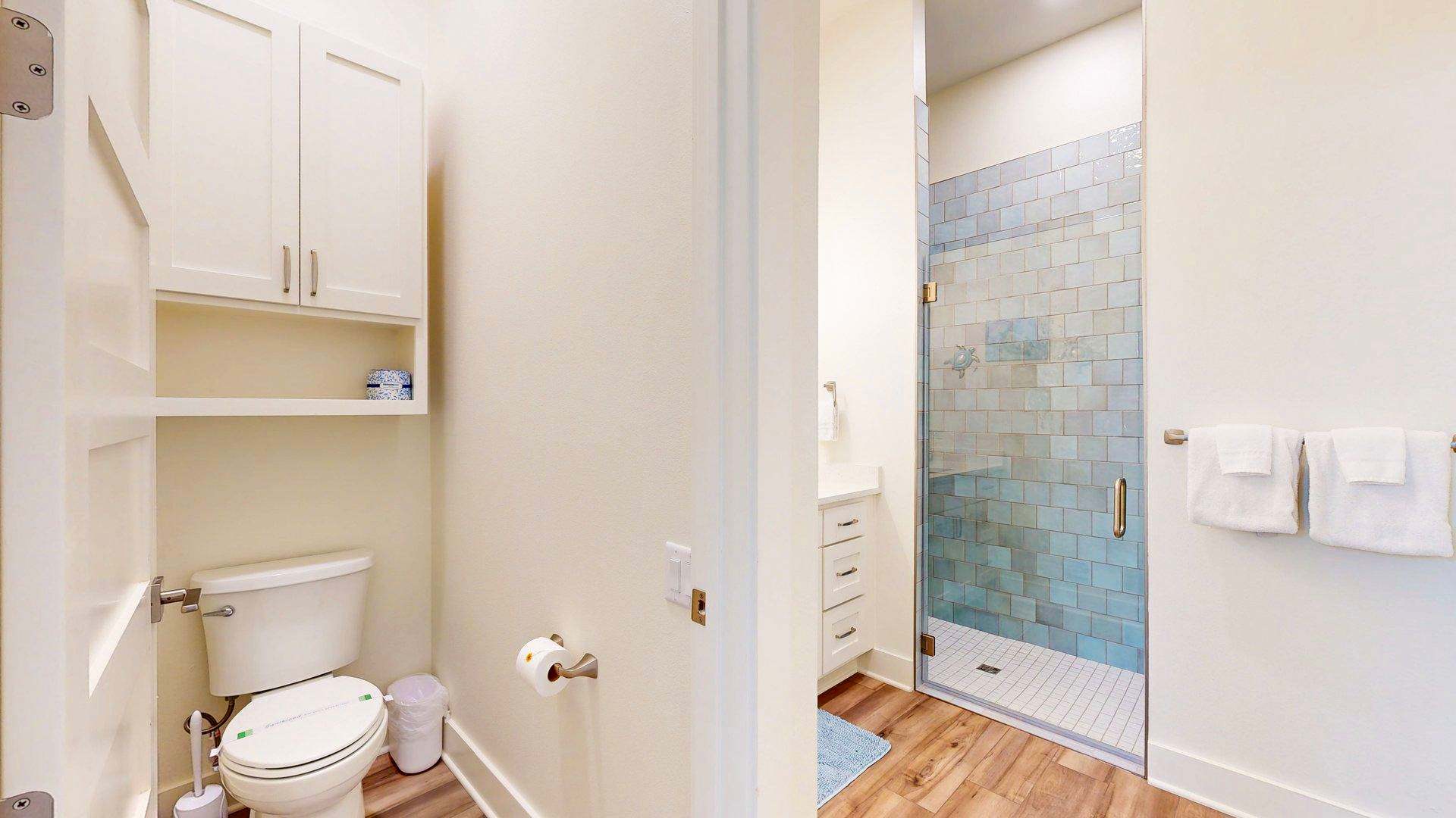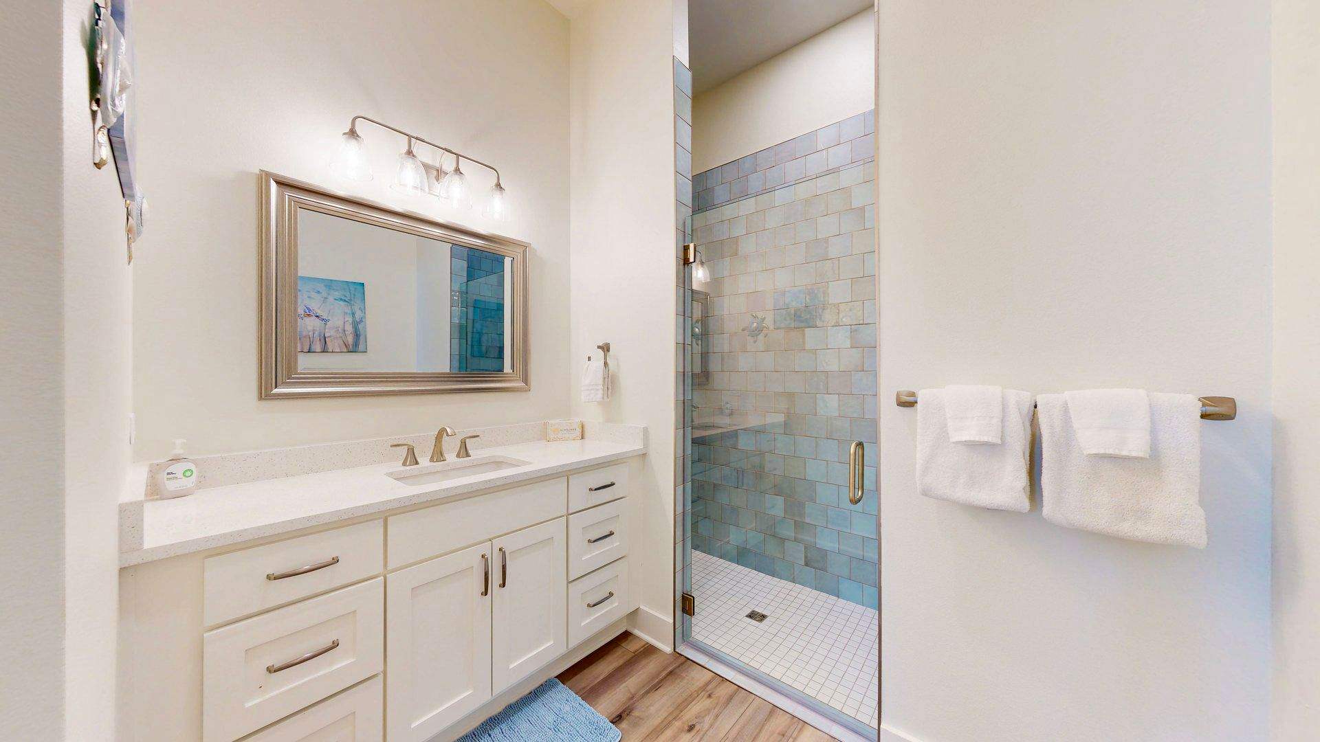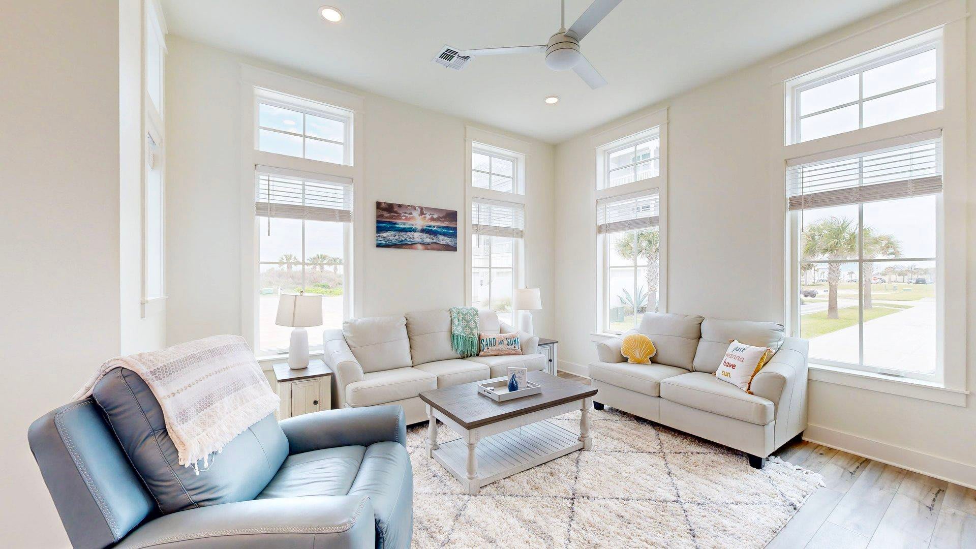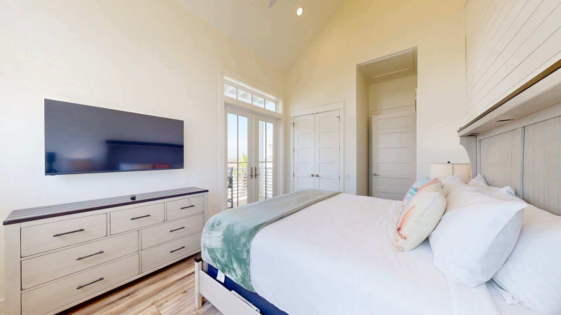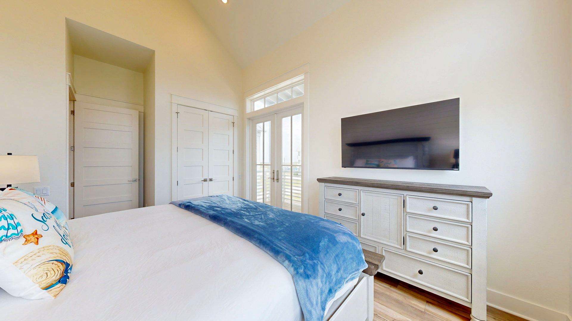 Venture to the second level, where another inviting living room awaits, complete with two fold-out queen sleeper sofas, a side chair, and a TV for added relaxation. This level also features a kitchenette area with a mini fridge for snacks and drinks, along with five balconies furnished for you to soak up the warm Port A sunshine. With four bedrooms on this level, three with their own ensuite baths, and an additional full bath off the hallway, there’s plenty of space for everyone to enjoy their own privacy.