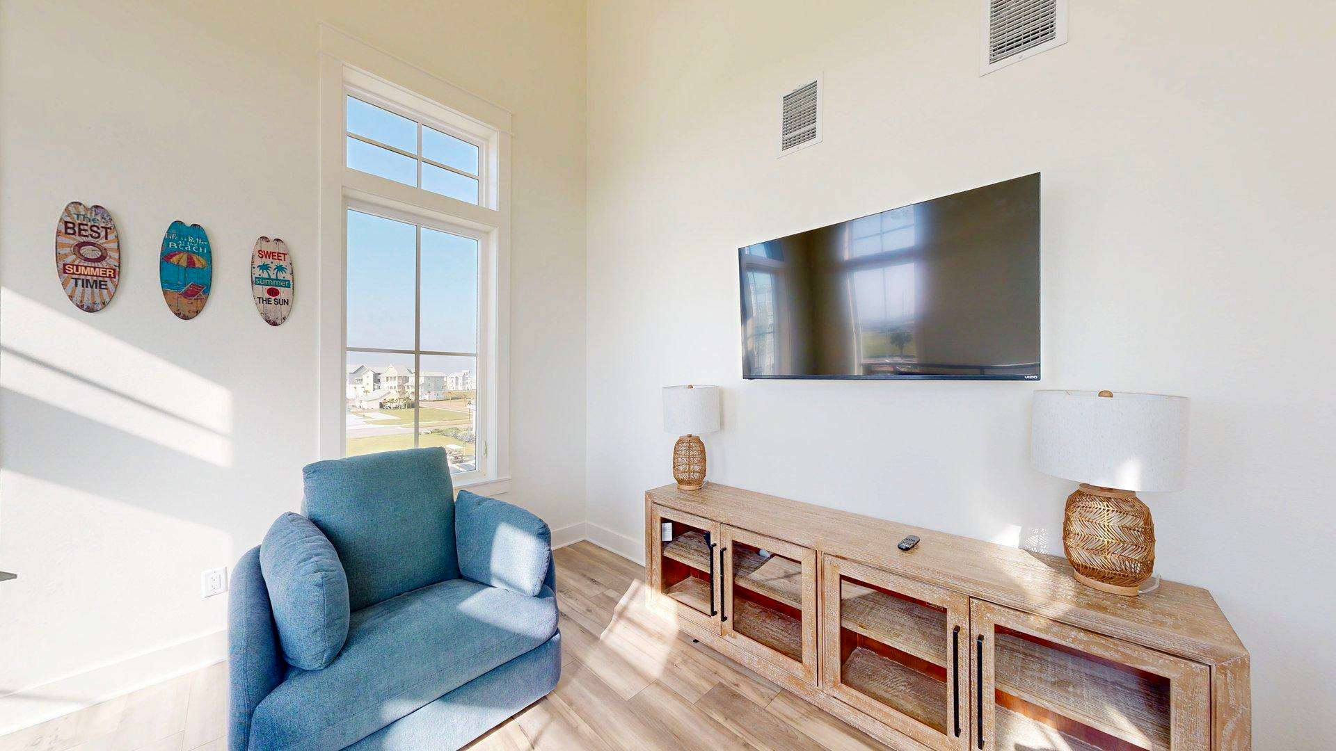 The third level offers a cozy, small living area, perfect for quiet evenings in, furnished with a sofa, two side chairs, and a TV for your entertainment needs.