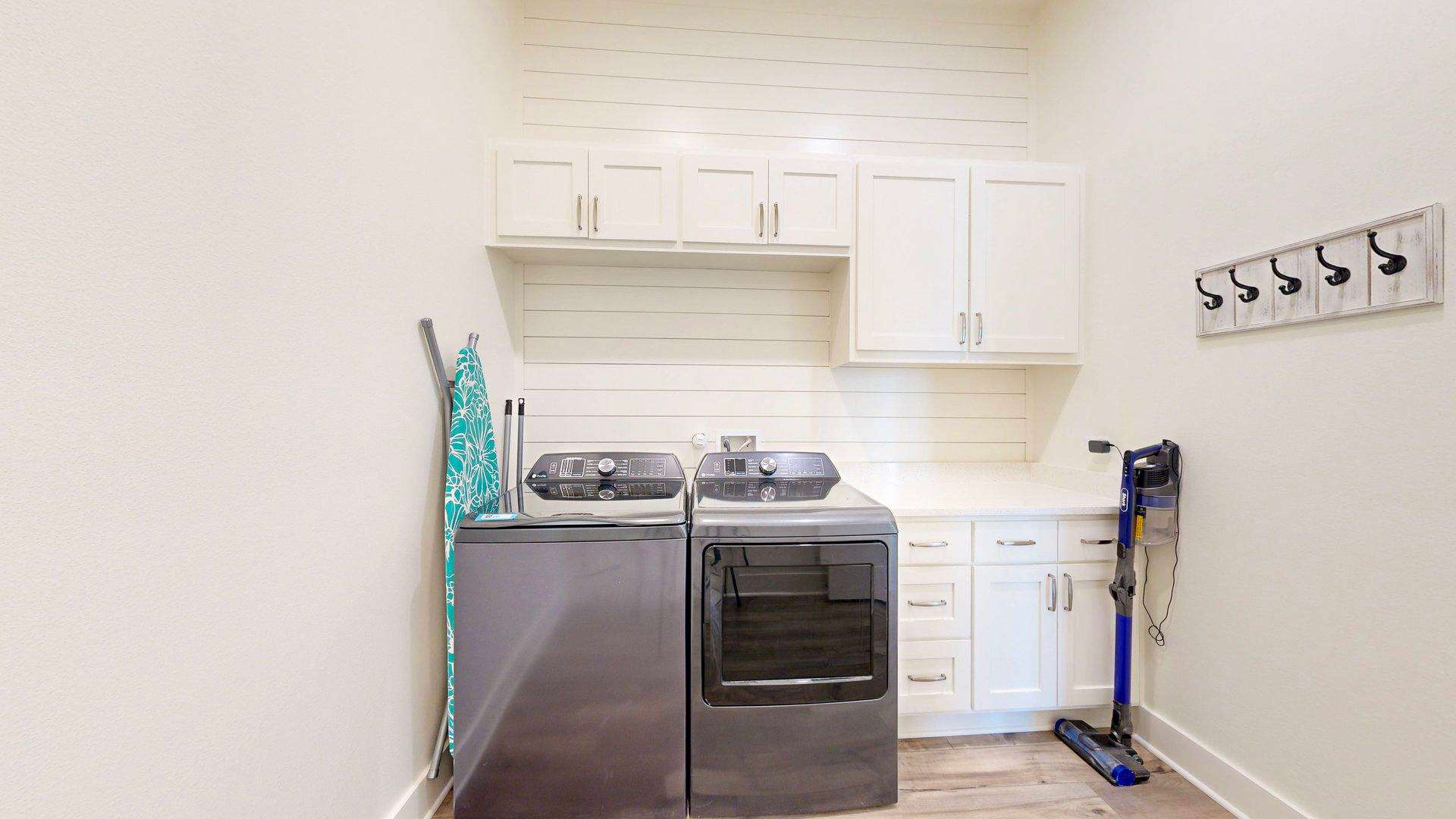 The fully stocked kitchen boasts stainless steel appliances, generous counter space, and modern cabinets, making meal prep a breeze. This level also includes a comfortable bedroom with an ensuite bath, a convenient laundry room equipped with a full-size washer and dryer, and a stylish half bath, ensuring all your needs are met.