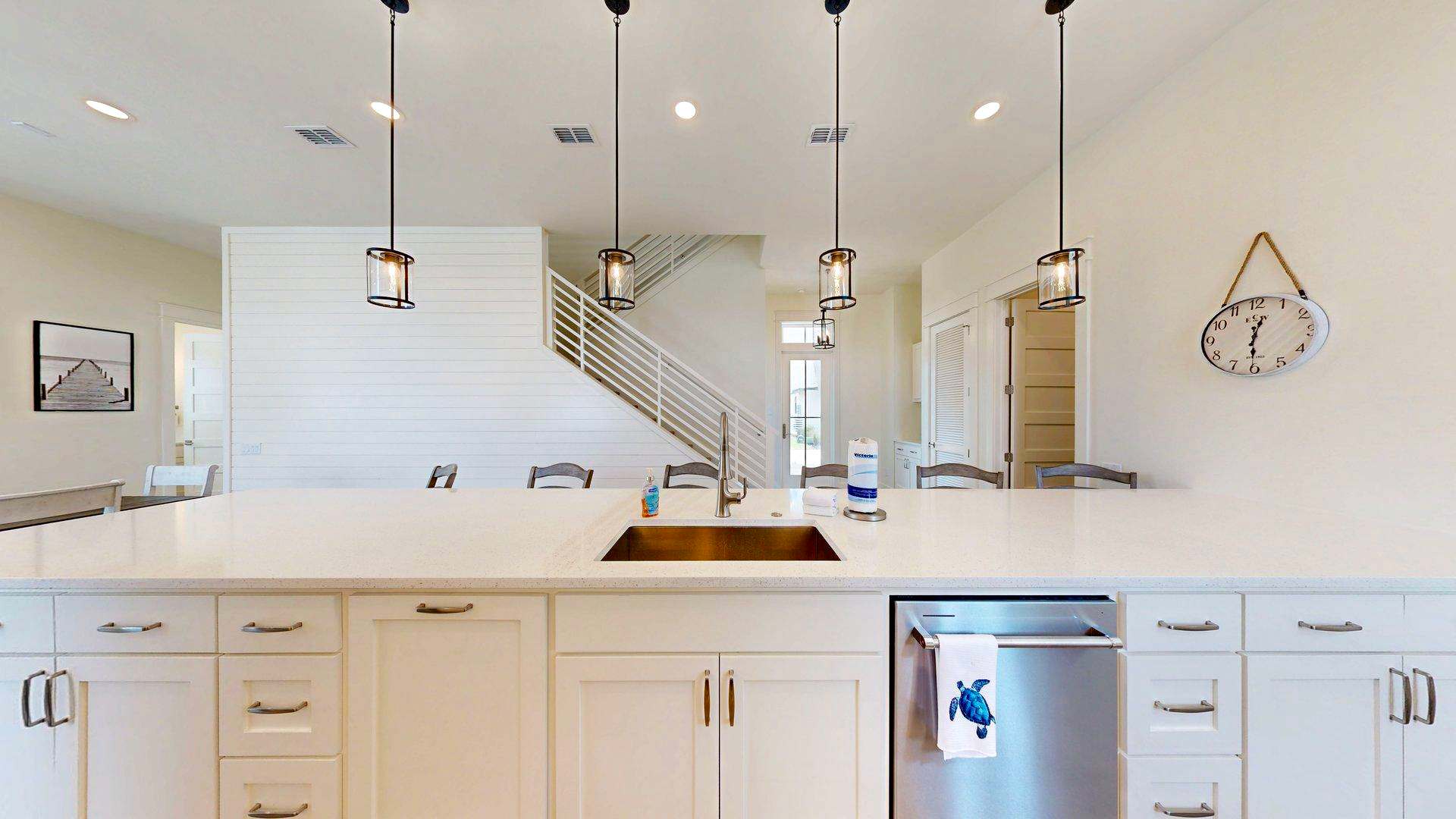 As you enter the first level, you are greeted by an inviting open floor plan that seamlessly integrates the living, dining, and kitchen areas. The cozy living room features a plush sofa, a recliner, and a side chair, making it the perfect spot to unwind after a day at the beach while enjoying your favorite shows on the TV. The spacious dining table seats eight, with additional seating for six at the kitchen bar, creating an ideal setting for memorable meals together.