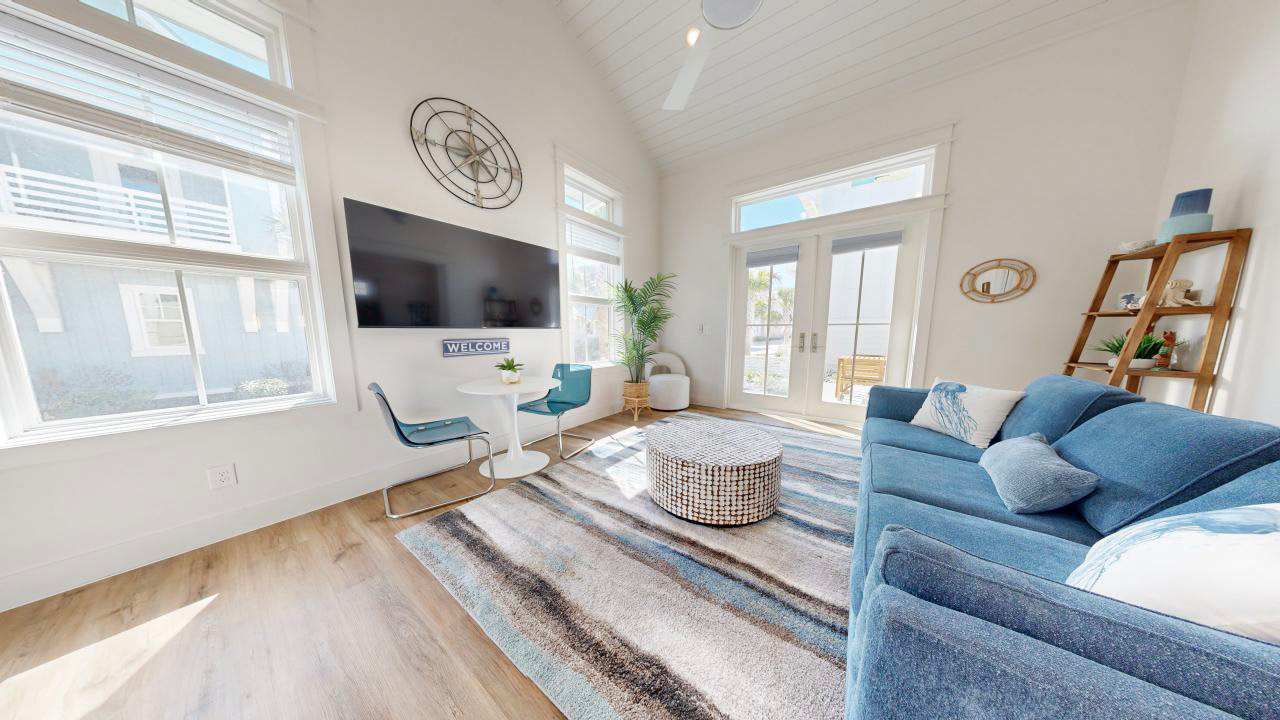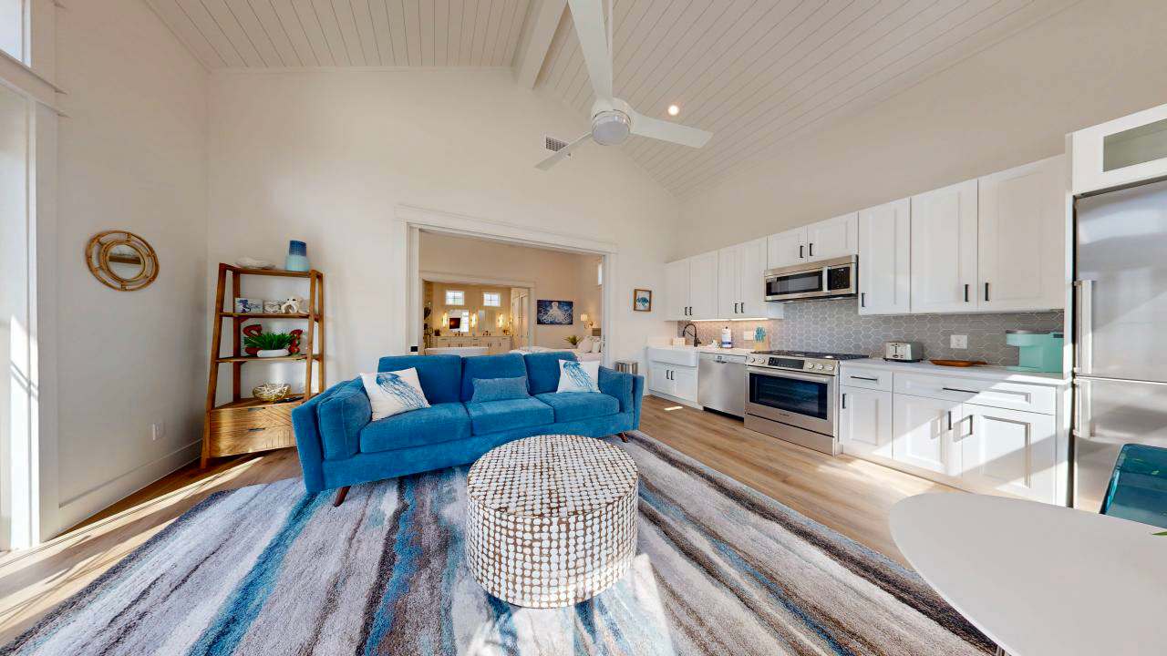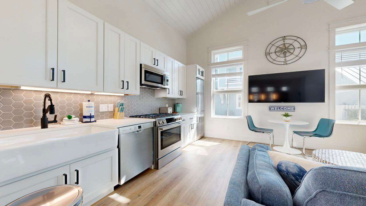 The living area is furnished with a plush sofa that conveniently folds out into a queen sleeper and a large screen TV for your entertainment needs.