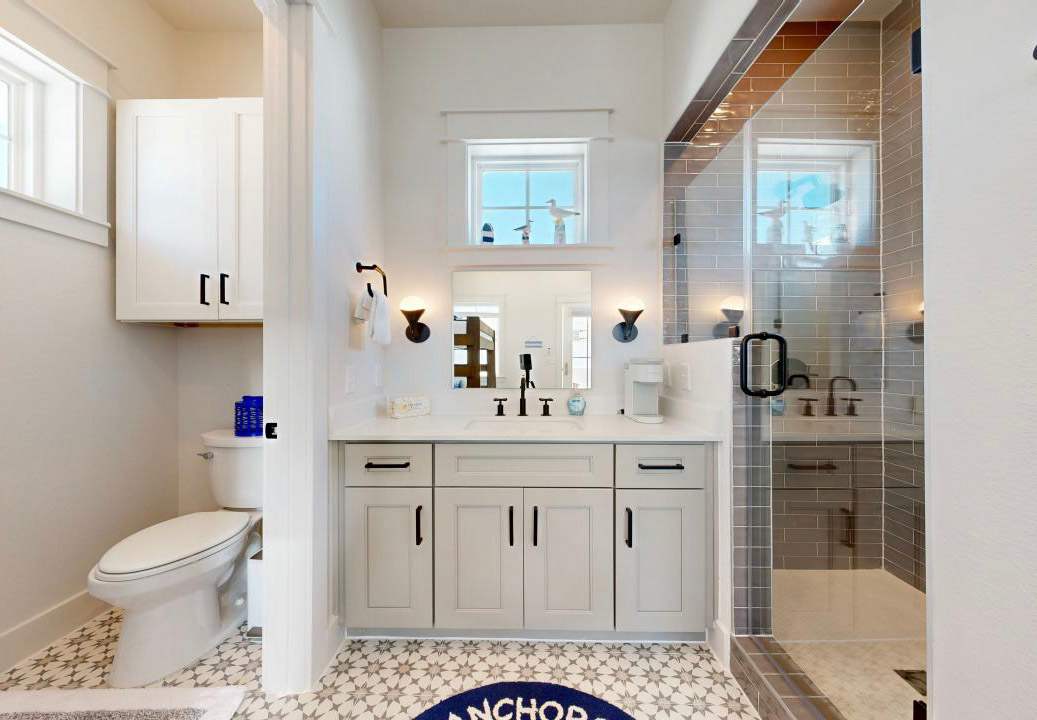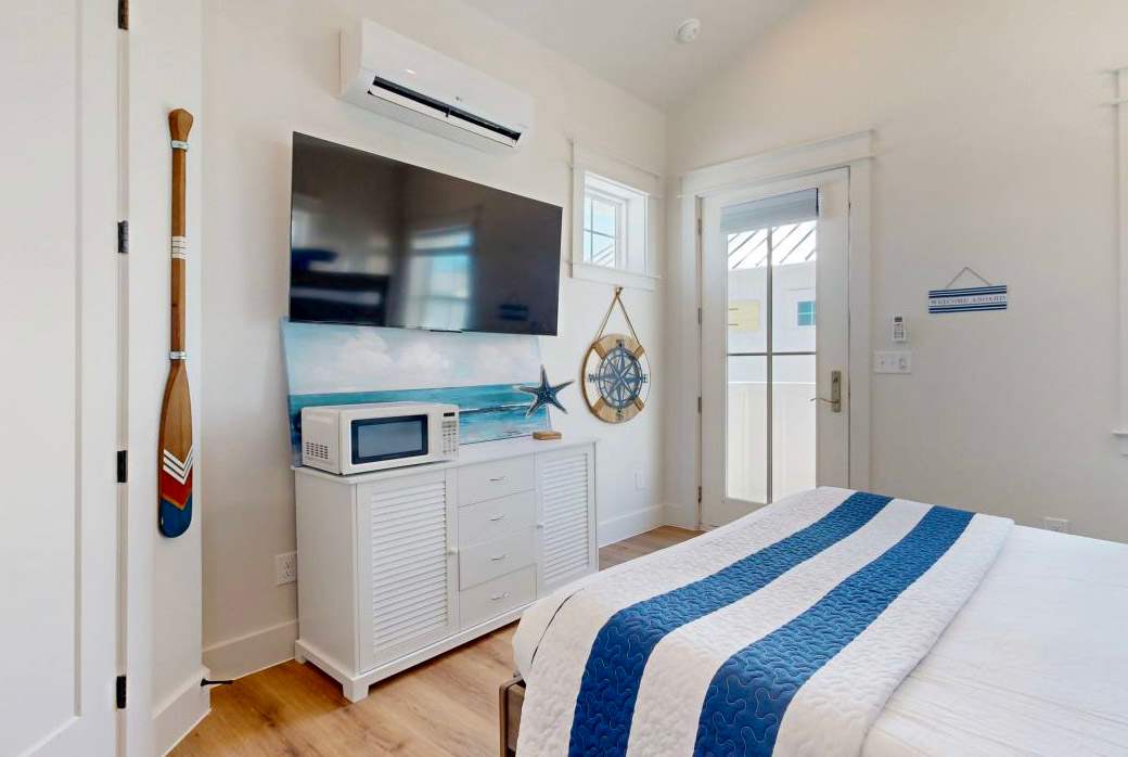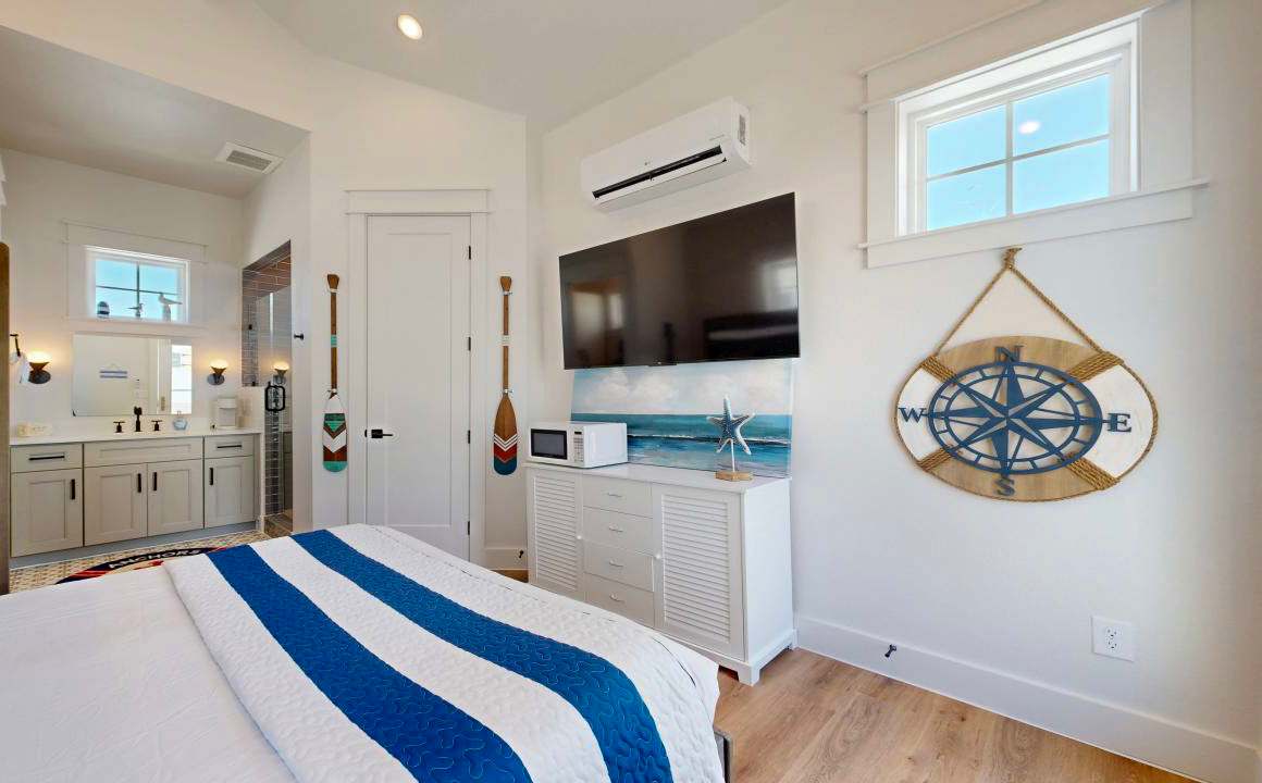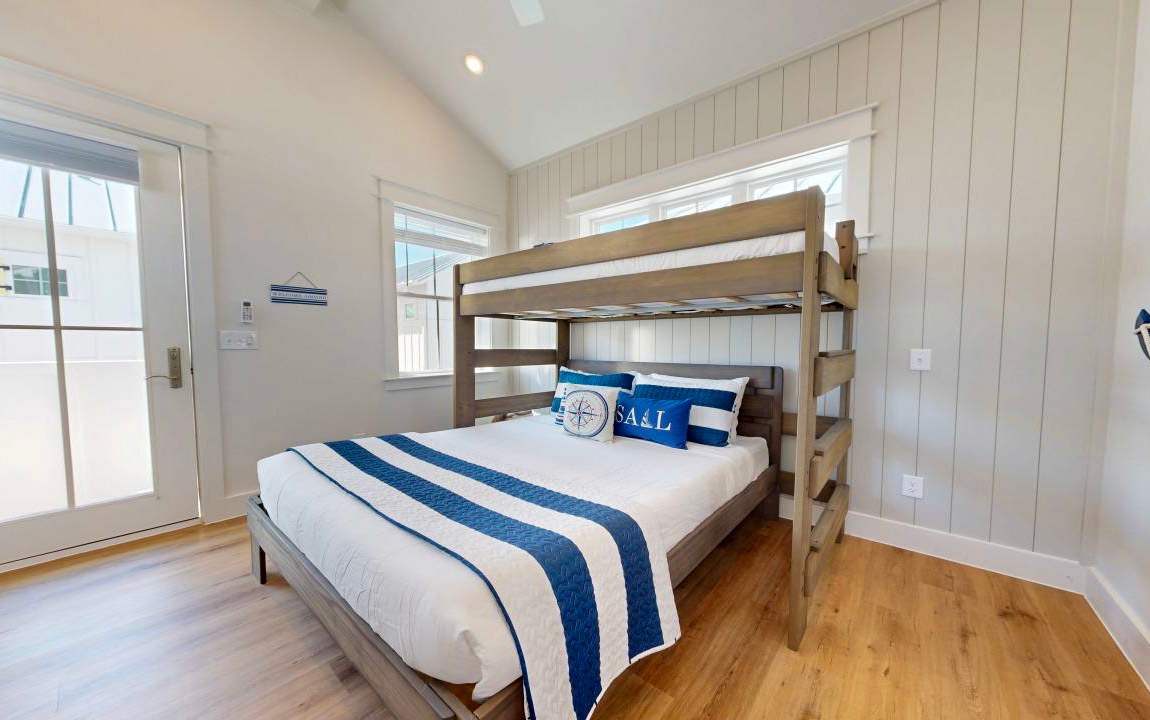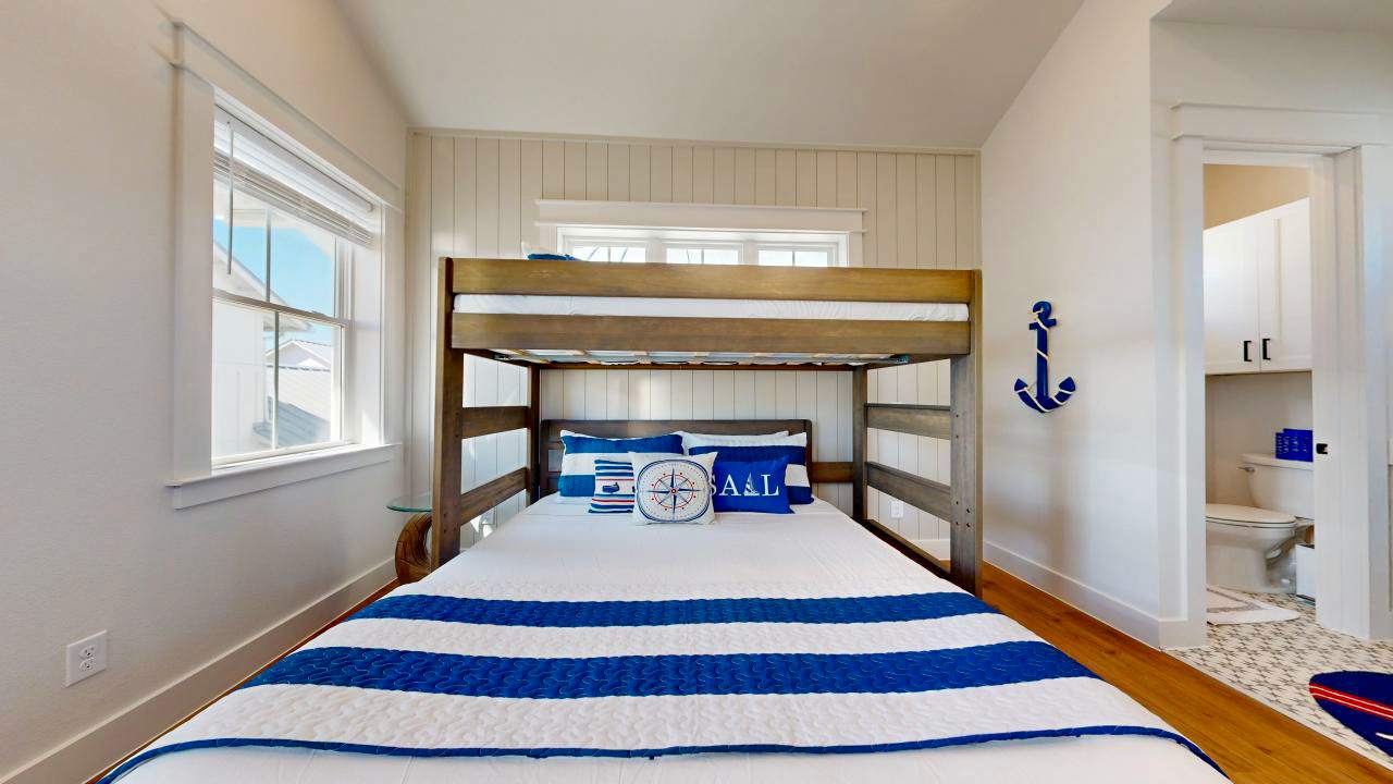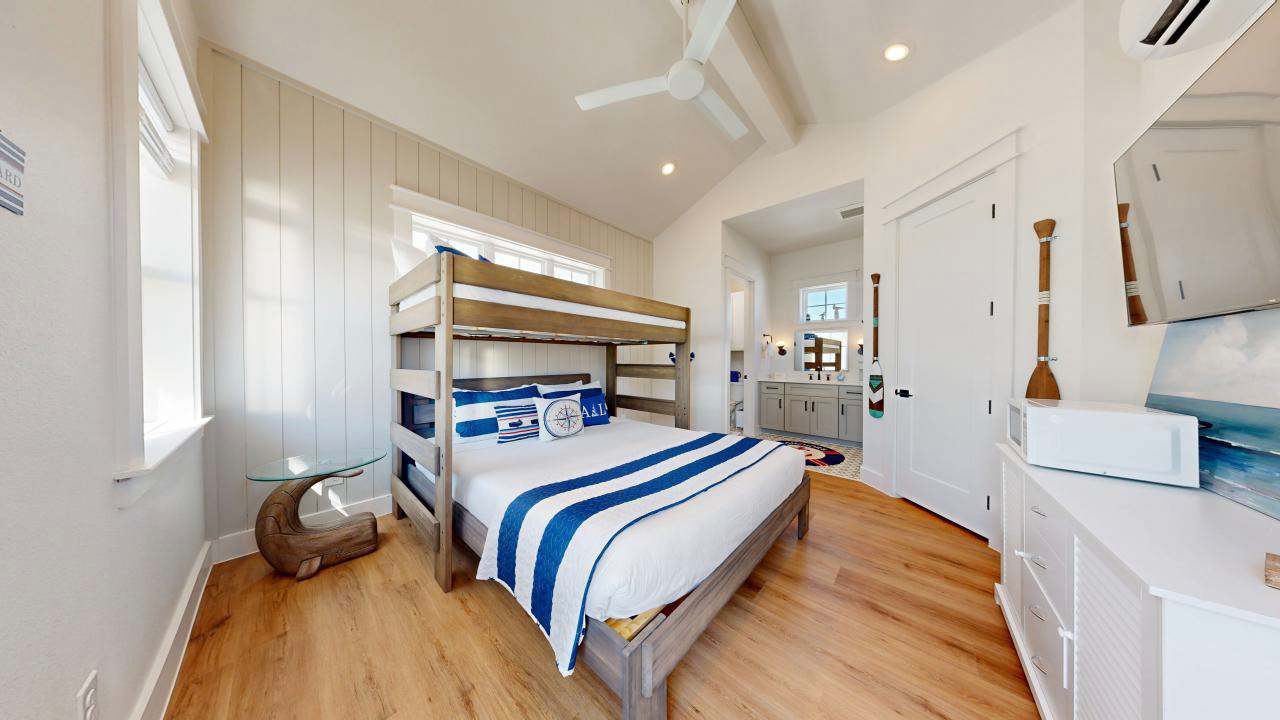 BR2 Bunk Bed, Twin over Queen, TV, Closet, ensuite bath w/ walk-in shower, single vanity (this bedroom has to be accessed from the outdoor patio stairs)