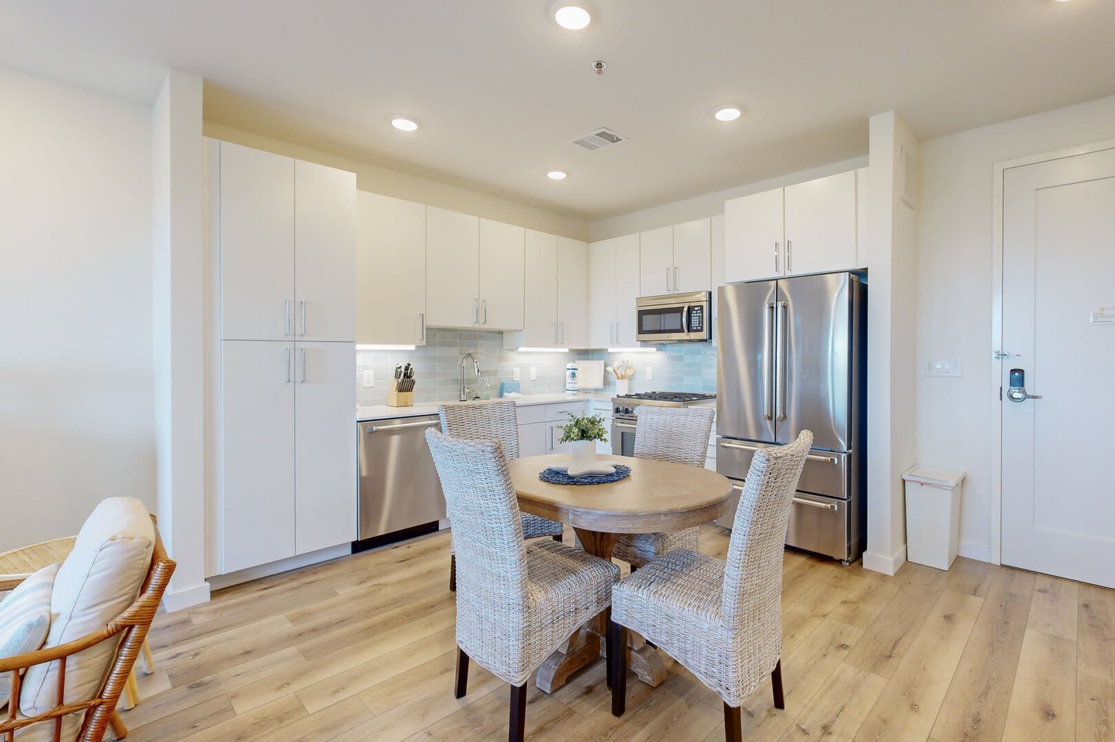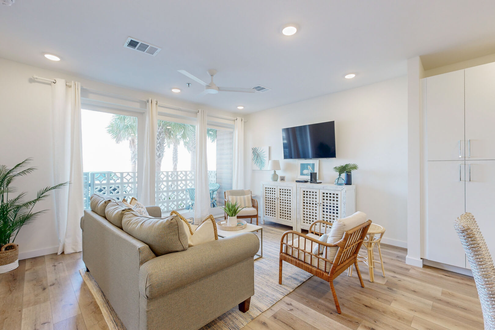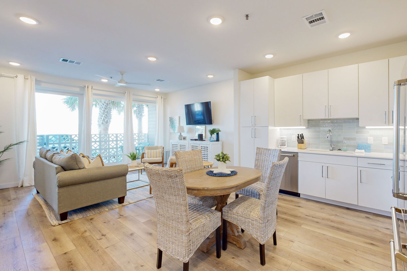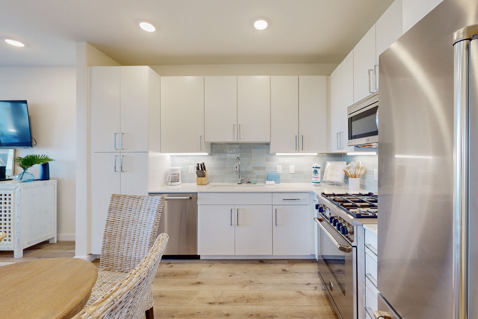 A beautifully furnished living area and plush furniture are sure to provide a comfortable spot to make happy memories with family and friends. Guests will love settling in for a cozy night in front of the flat-screen TV. The stunning kitchen is perfectly equipped to prepare fresh coastal meals with elite stainless-steel appliances, white cabinetry, and beautiful countertops. The dining table and 4 chairs provide ample seating to enjoy mealtimes together.