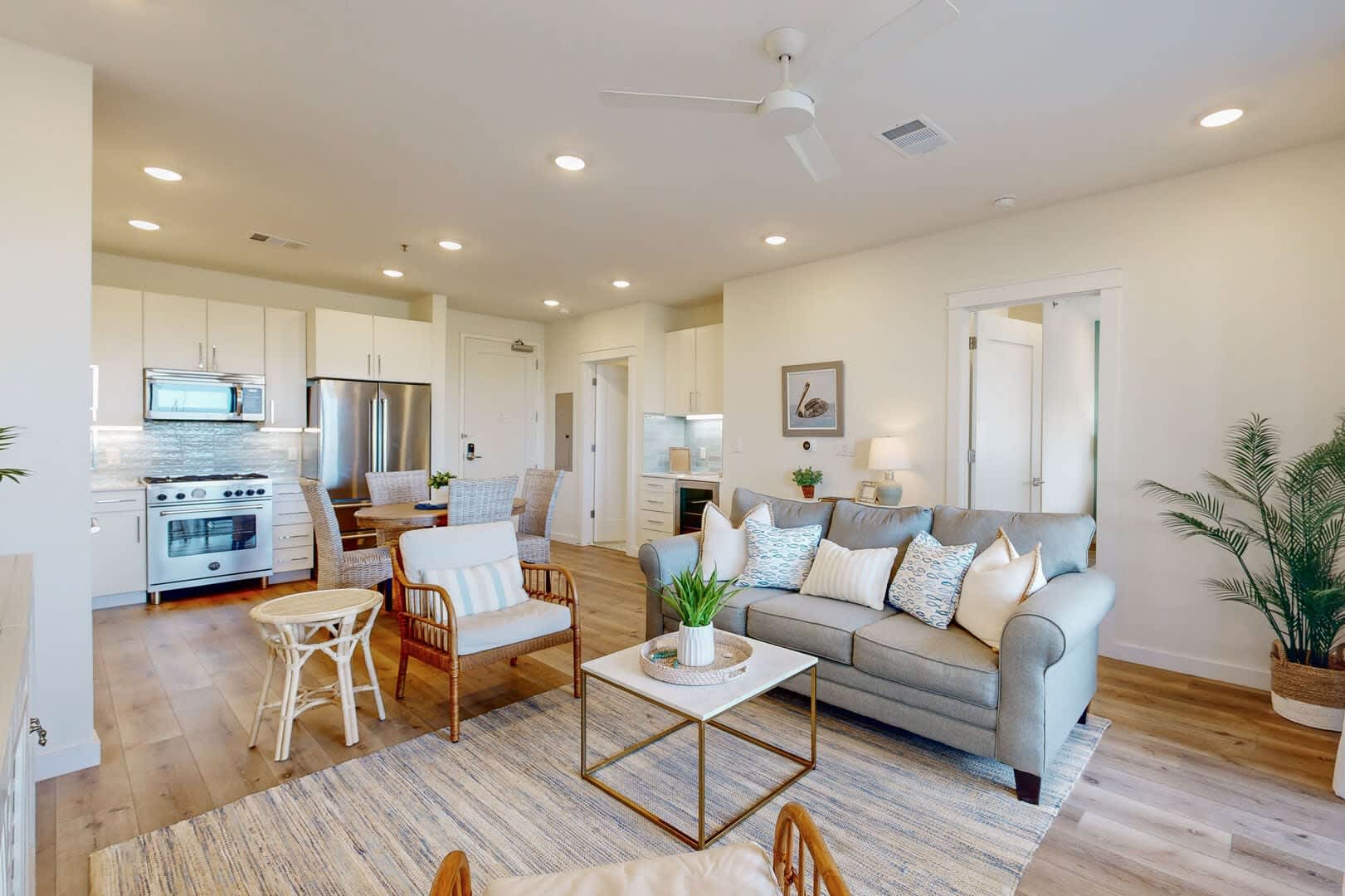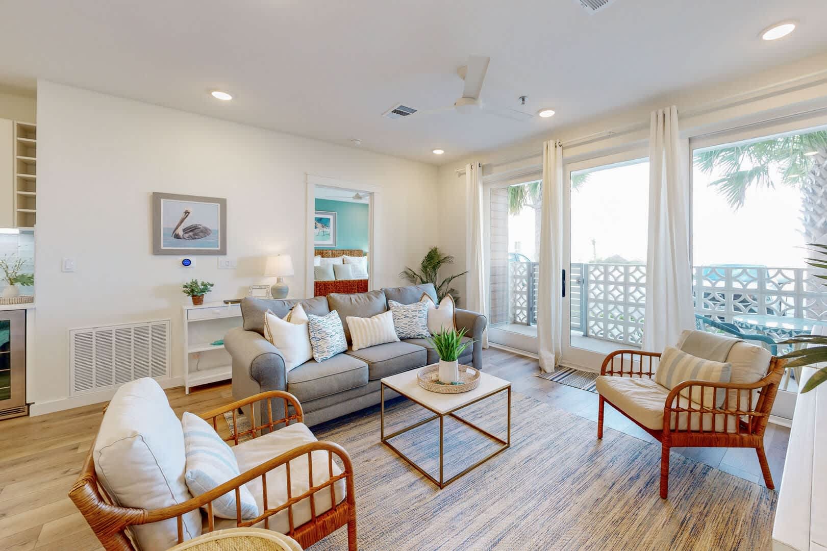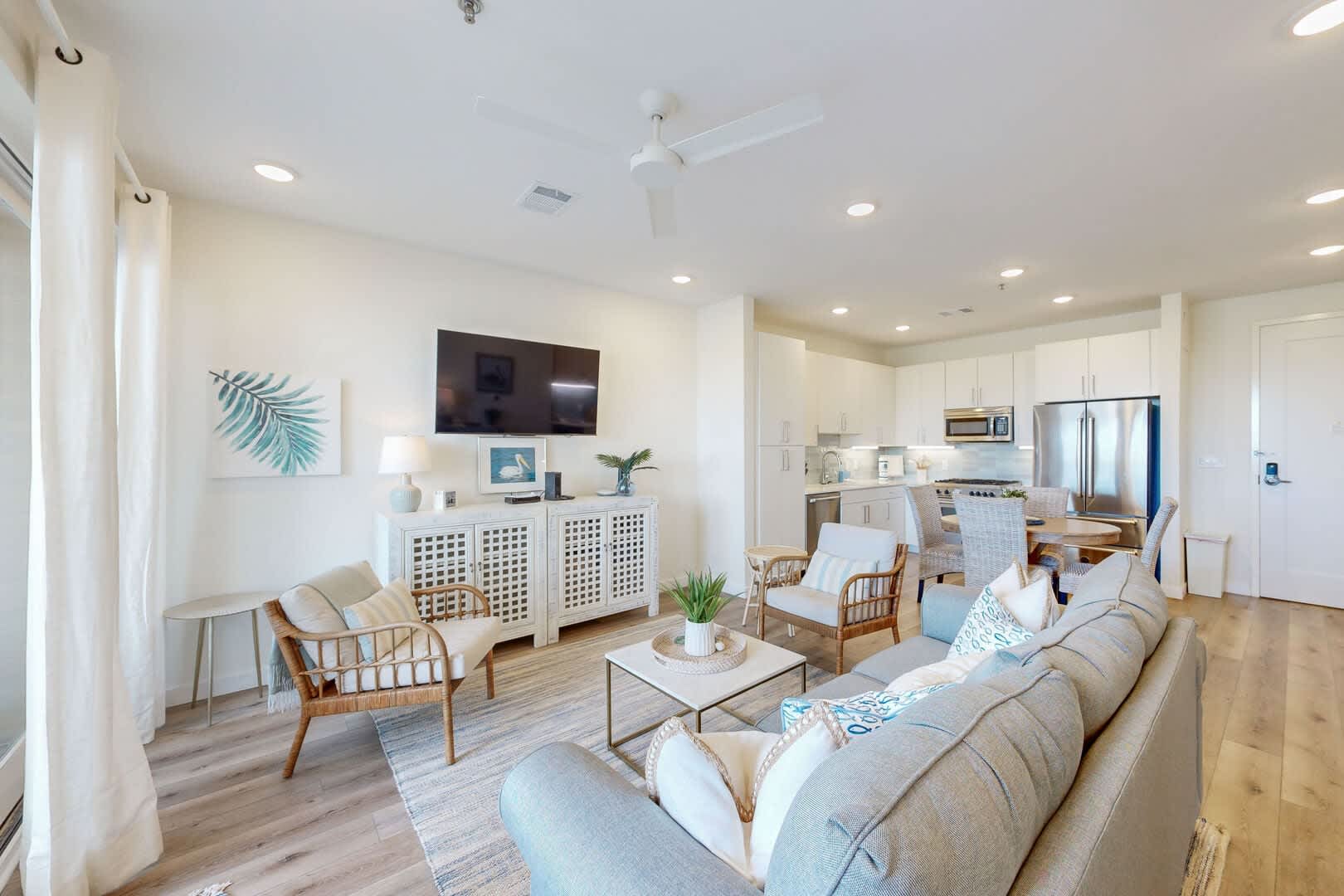 A beautifully furnished living area and plush furniture are sure to provide a comfortable spot to make happy memories with family and friends. Guests will love settling in for a cozy night in front of the flat-screen TV. The stunning kitchen is perfectly equipped to prepare fresh coastal meals with elite stainless-steel appliances, white cabinetry, and beautiful countertops. The dining table and 4 chairs provide ample seating to enjoy mealtimes together.
