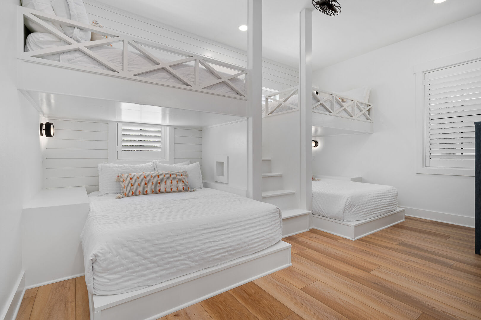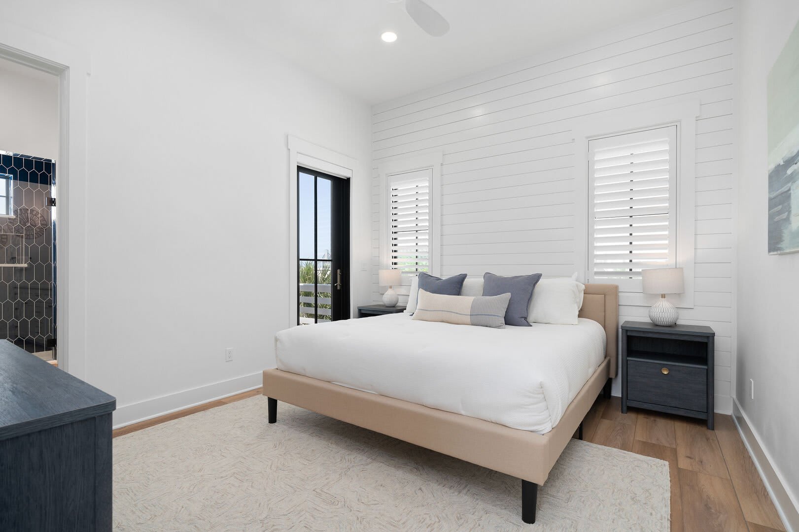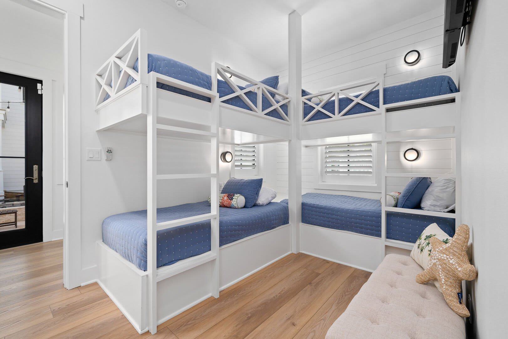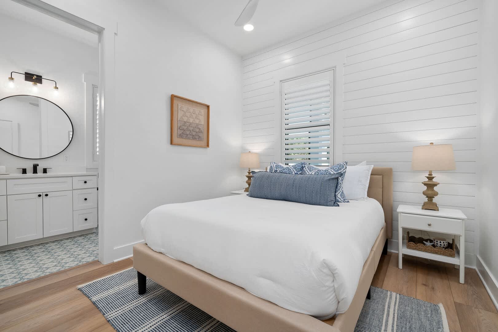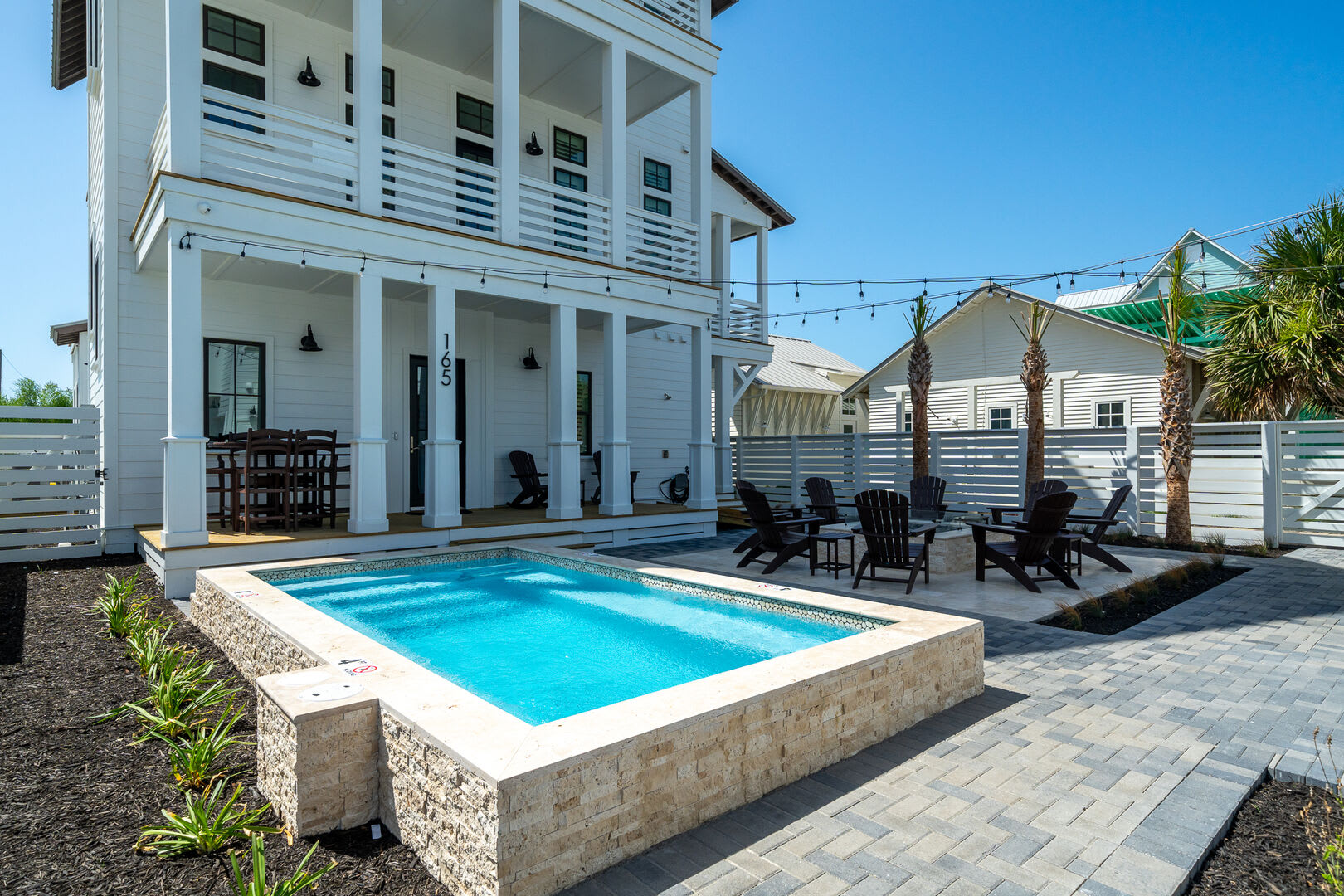Bedrooms & Bathrooms: The Poolside House offers two bedrooms and 2.5 baths. The first floor features a bunk room that comfortably sleeps four and has a large ensuite bath. The second floor includes a primary suite with a king-sized bed and a luxurious walk-in rain shower.
