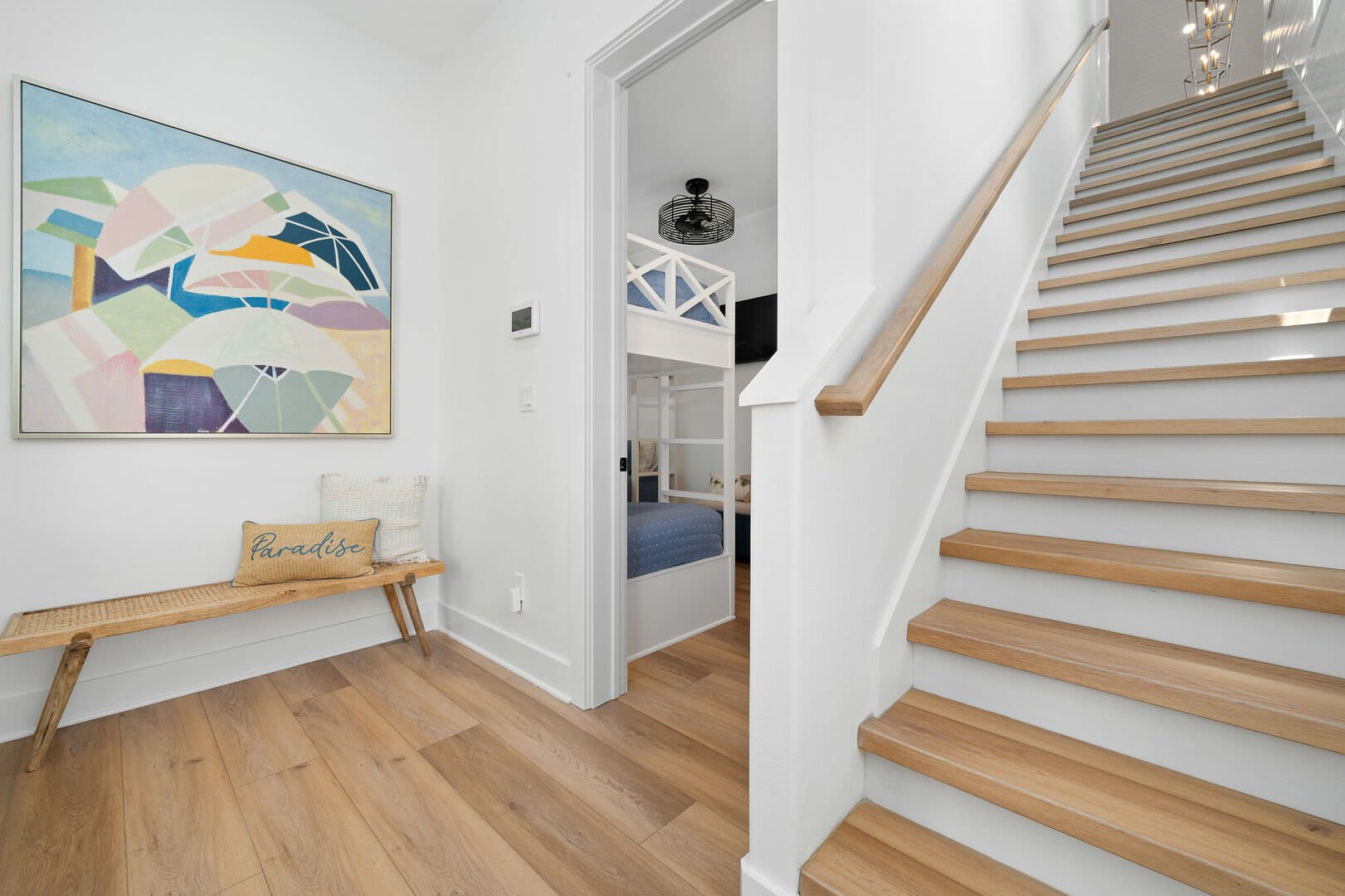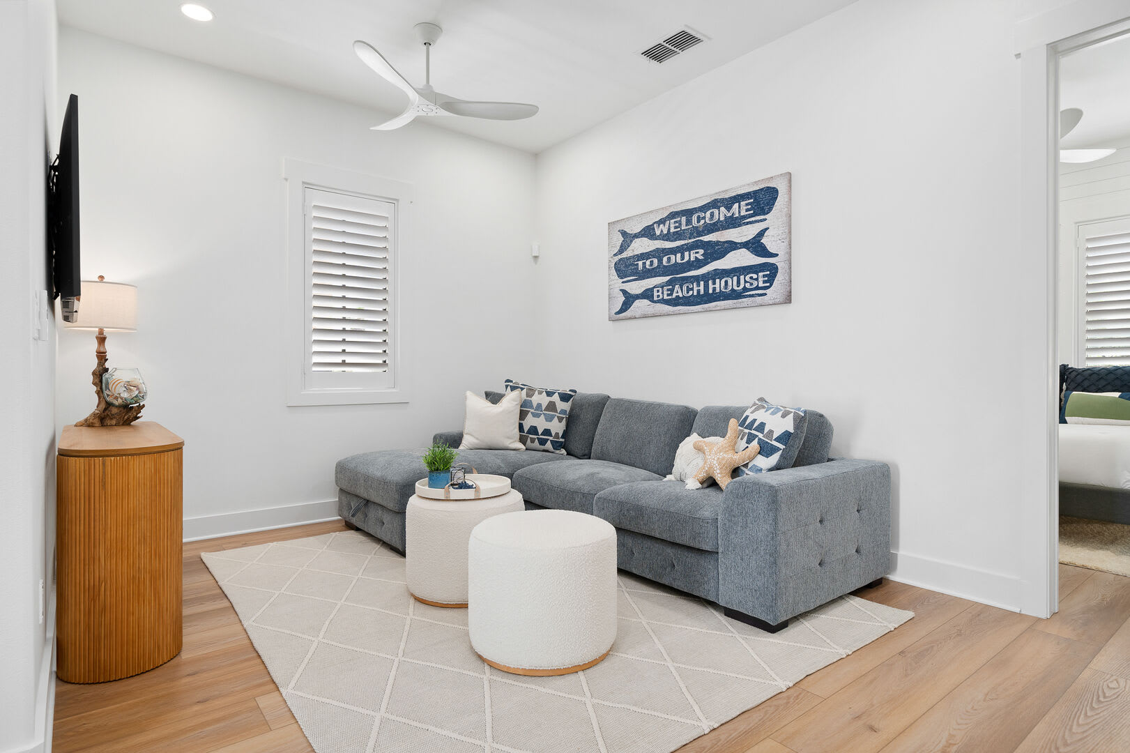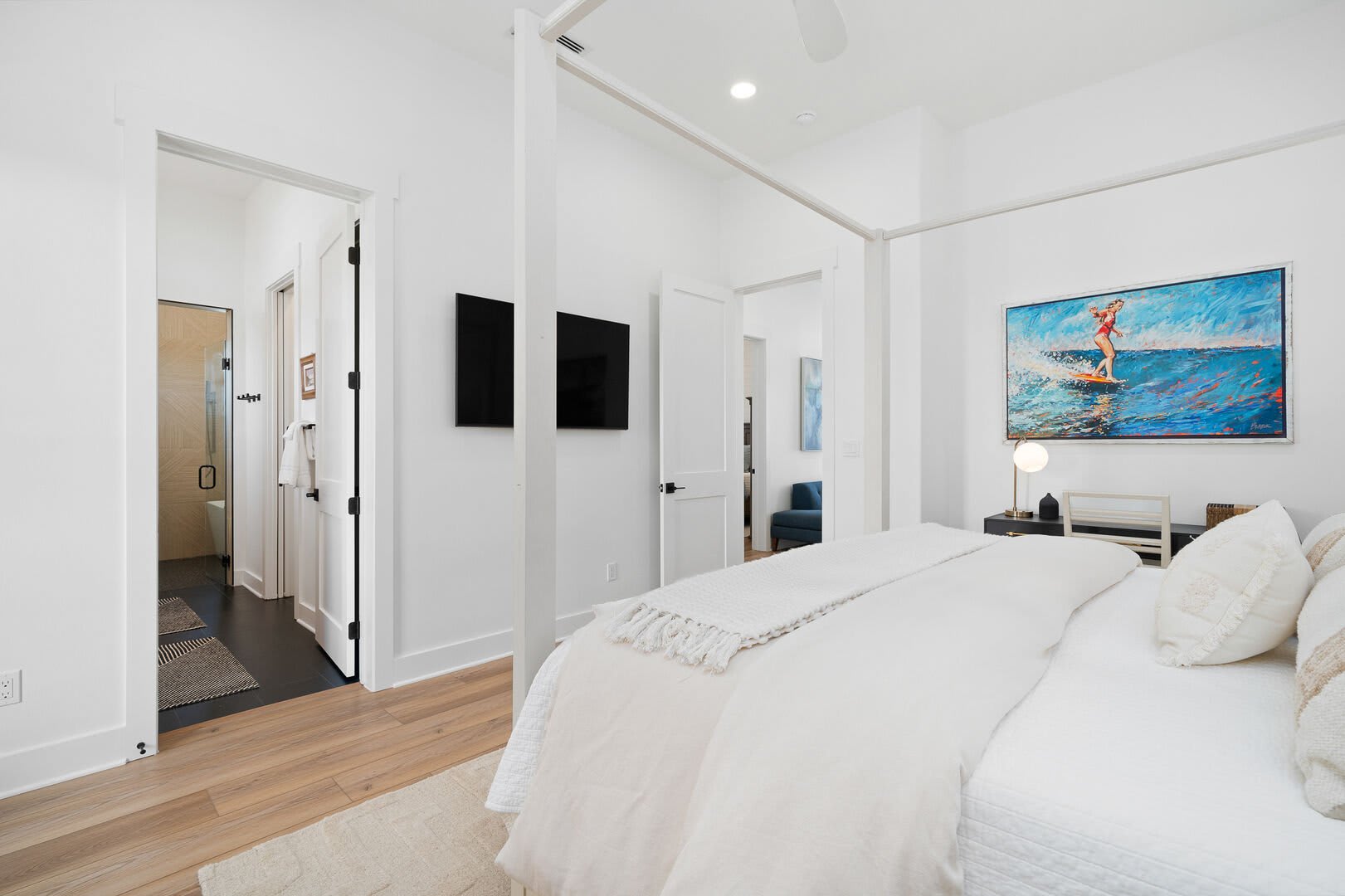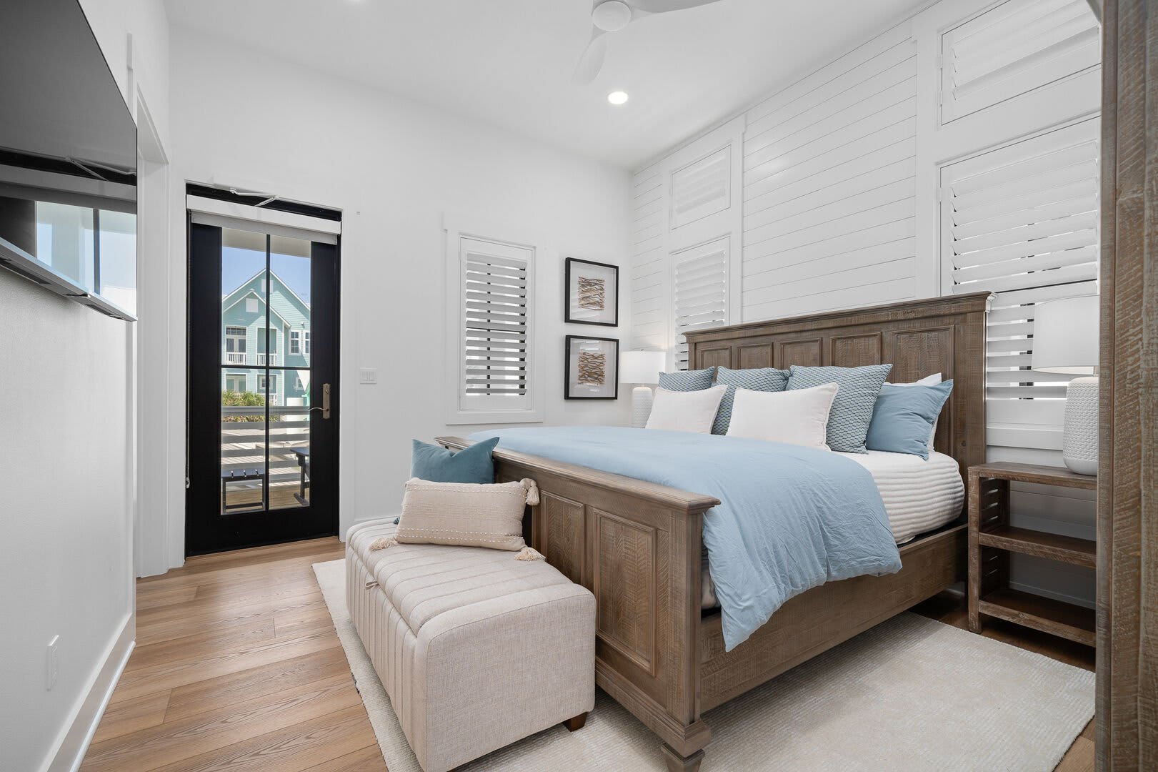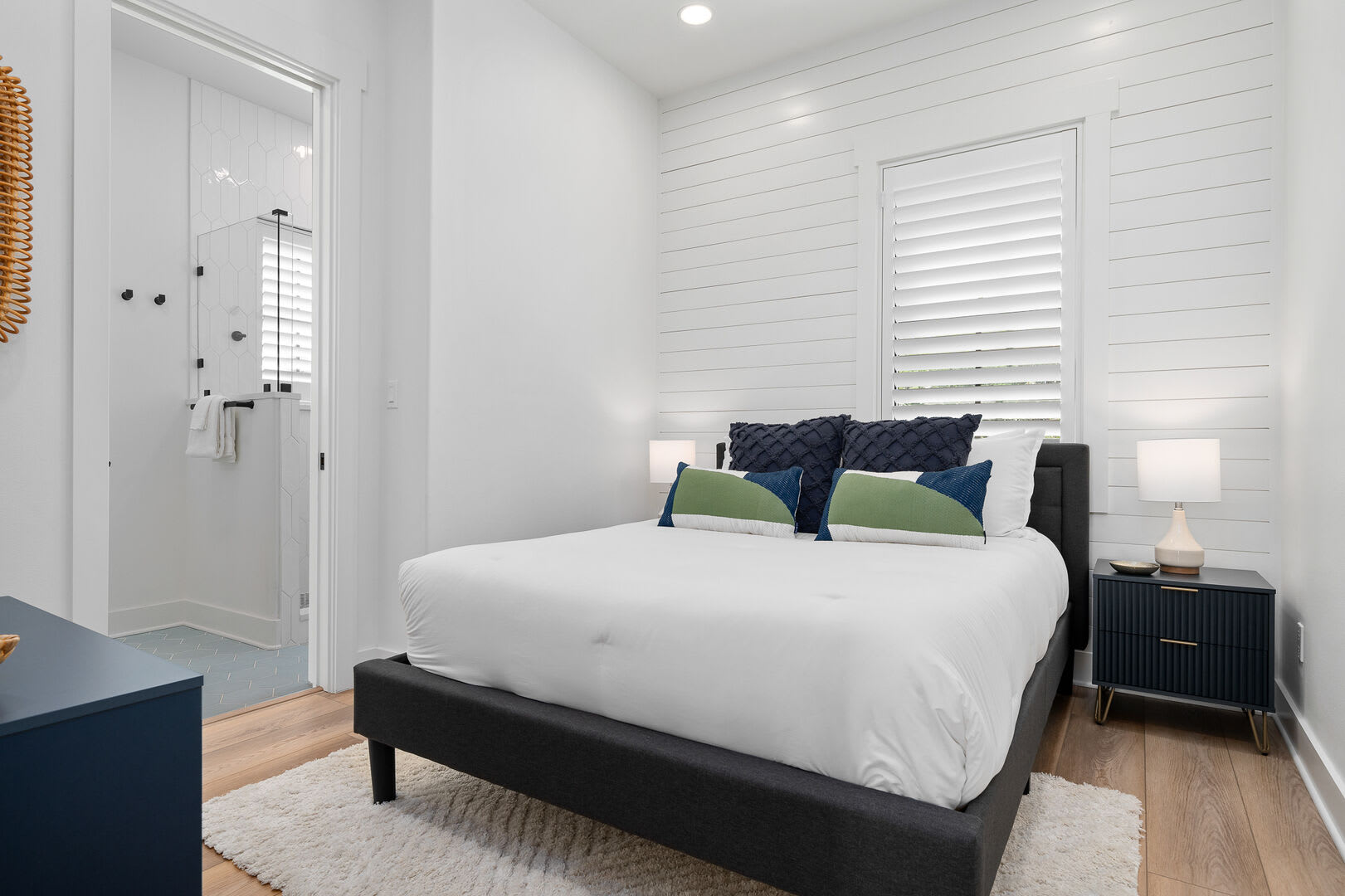Bedrooms & Bathrooms: The Poolside House offers two bedrooms and 2.5 baths. The first floor features a bunk room that comfortably sleeps four and has a large ensuite bath. The second floor includes a primary suite with a king-sized bed and a luxurious walk-in rain shower.