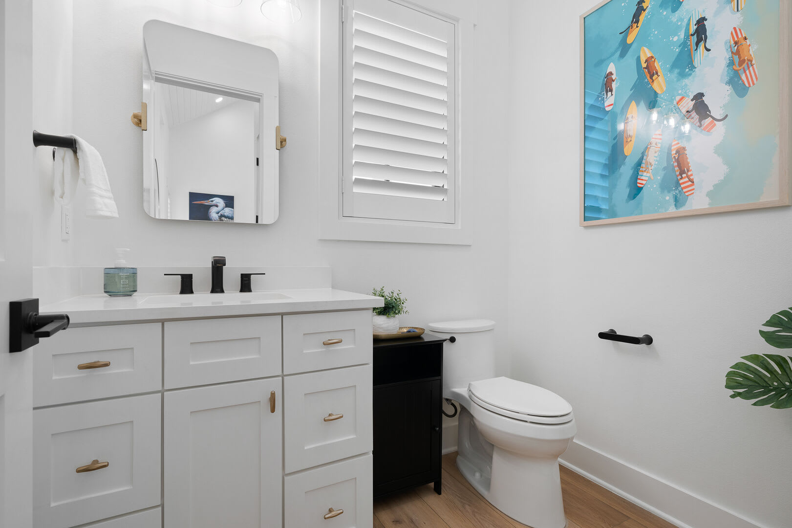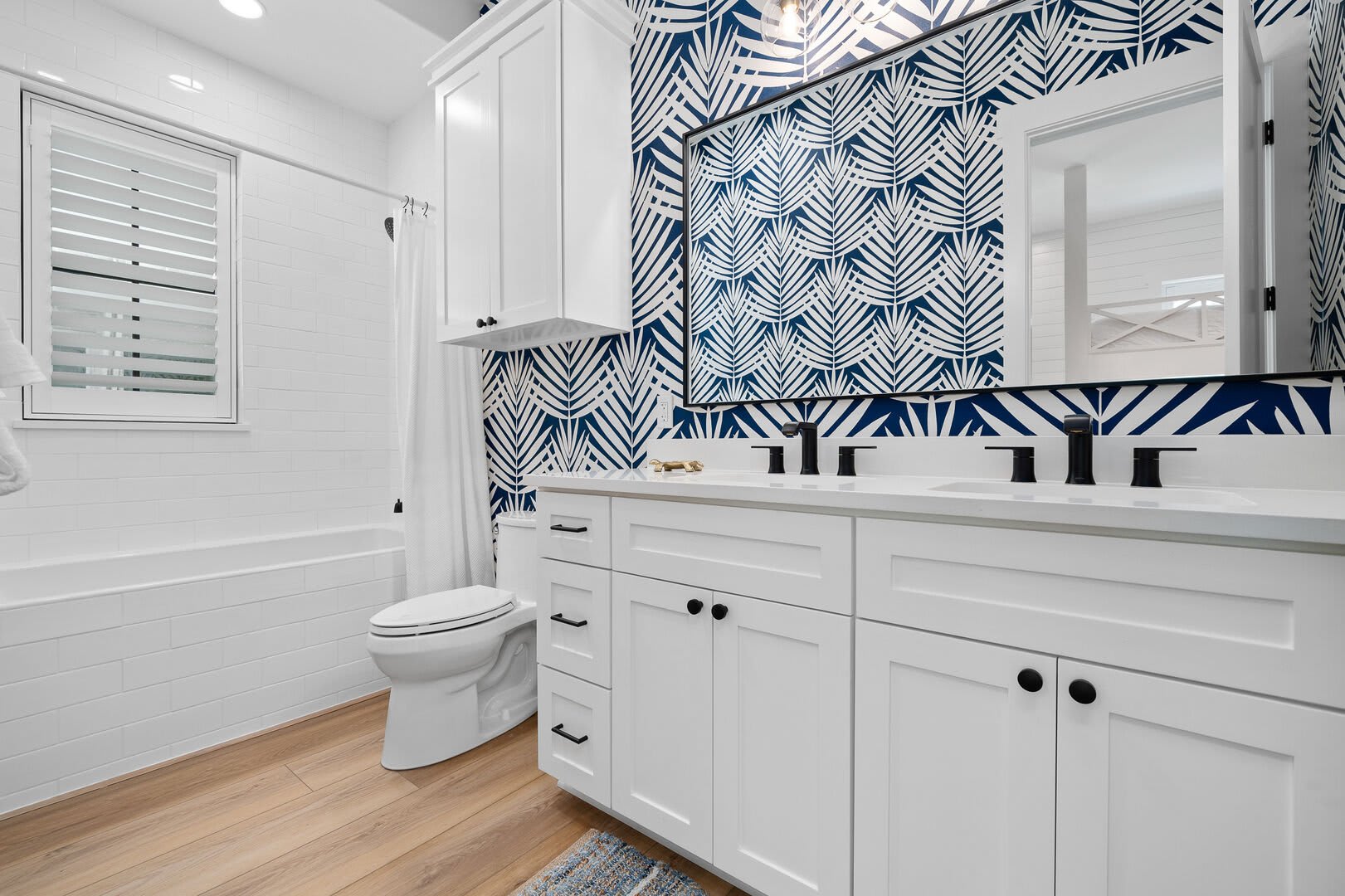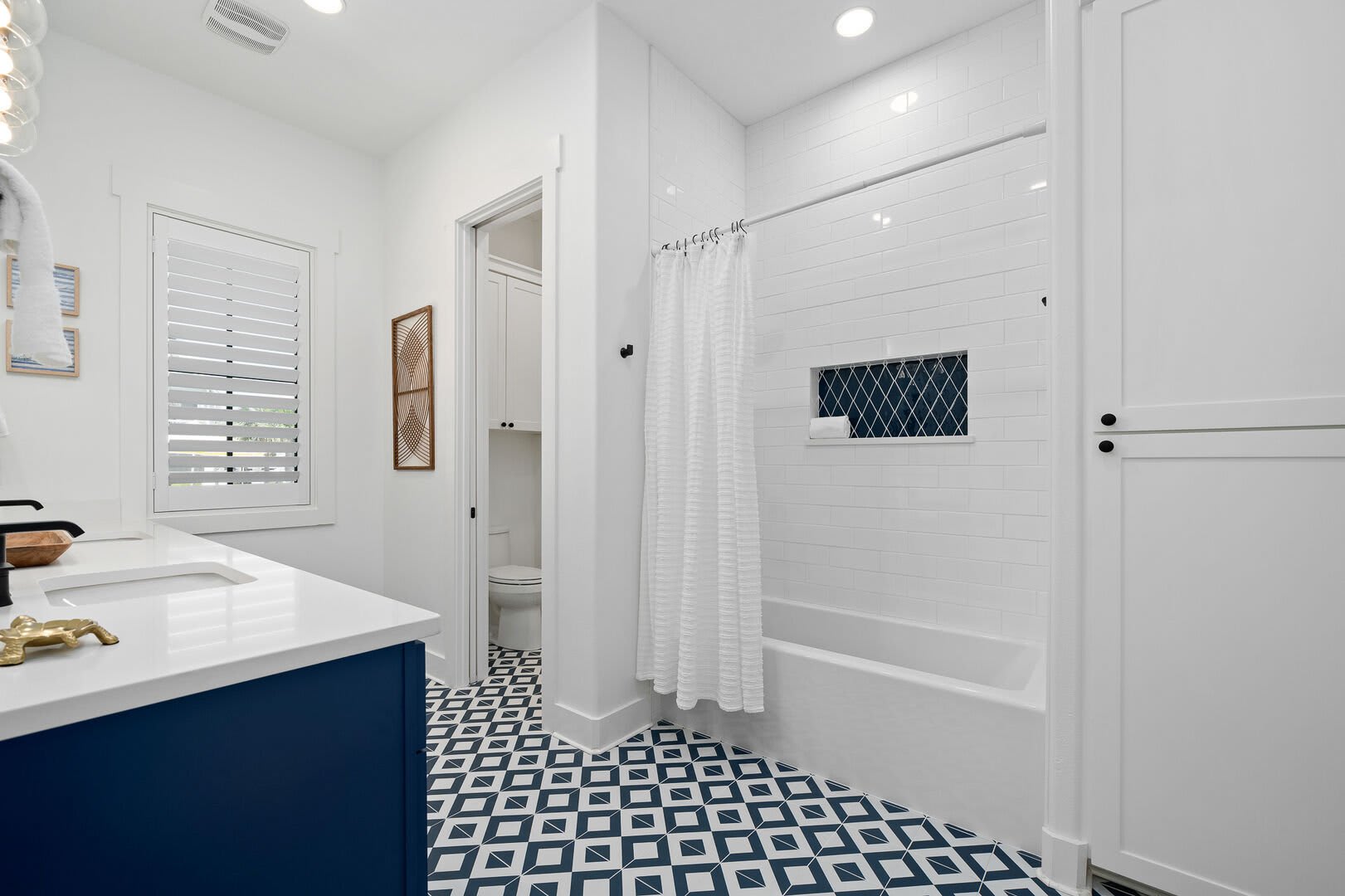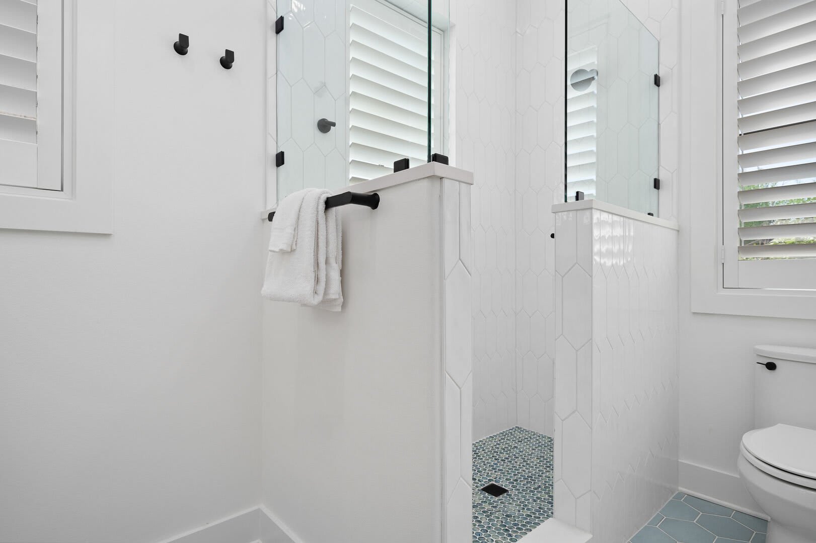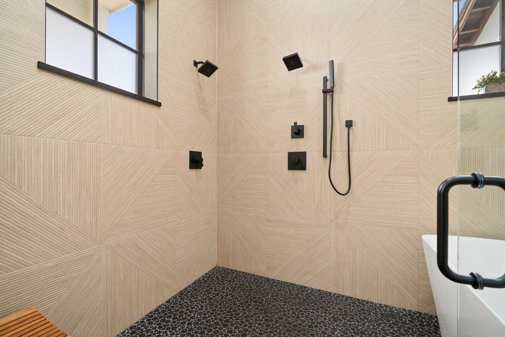 Bedrooms & Bathrooms: The Poolside House offers two bedrooms and 2.5 baths. The first floor features a bunk room that comfortably sleeps four and has a large ensuite bath. The second floor includes a primary suite with a king-sized bed and a luxurious walk-in rain shower.