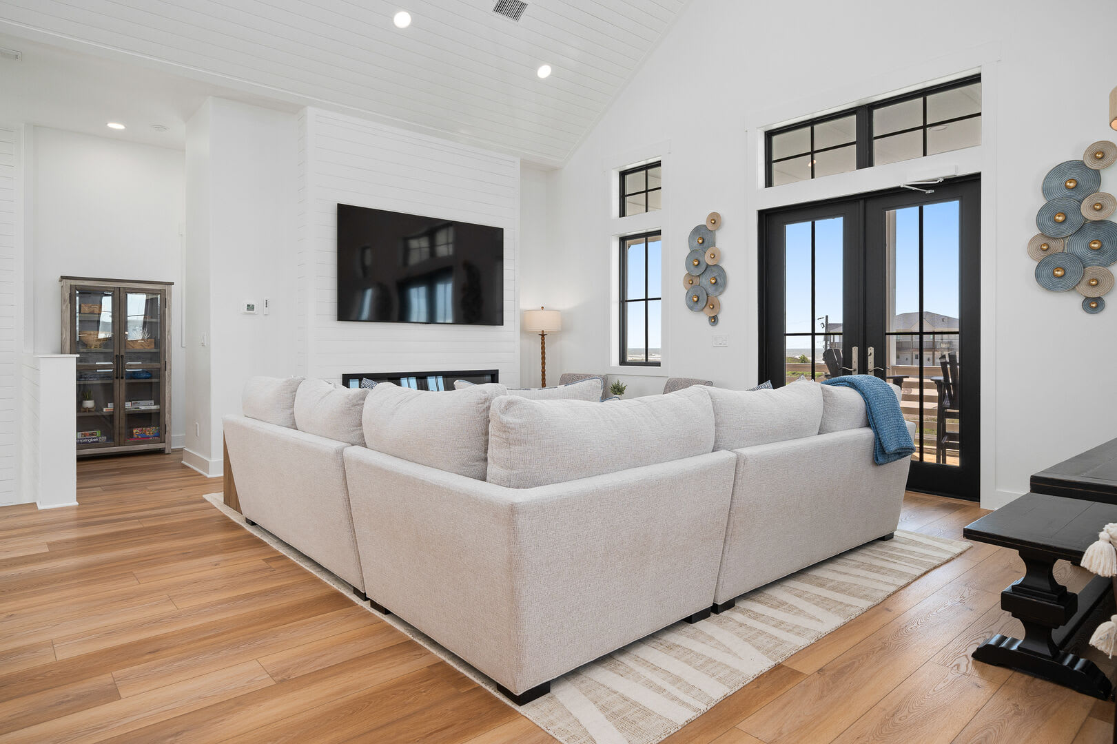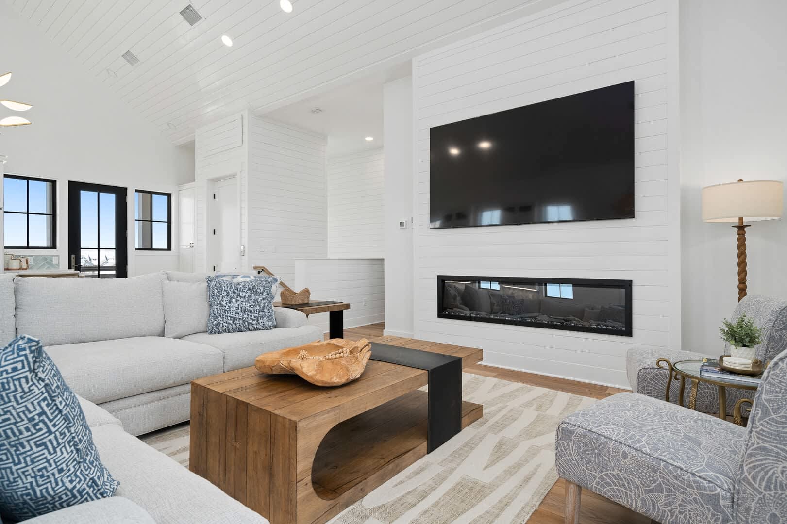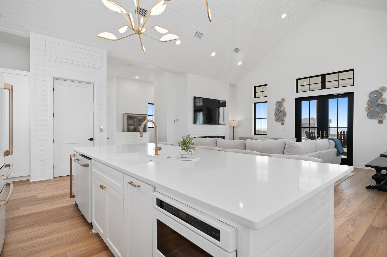 Living & Dining: The top floor houses a gourmet kitchen with high-end appliances, a massive island, and an 85” TV above a 72” fireplace. Enjoy sunrises and ocean views from the back balcony and sunsets from the courtyard balcony. An elevator will help move your groceries and guests to the 3rd floor.