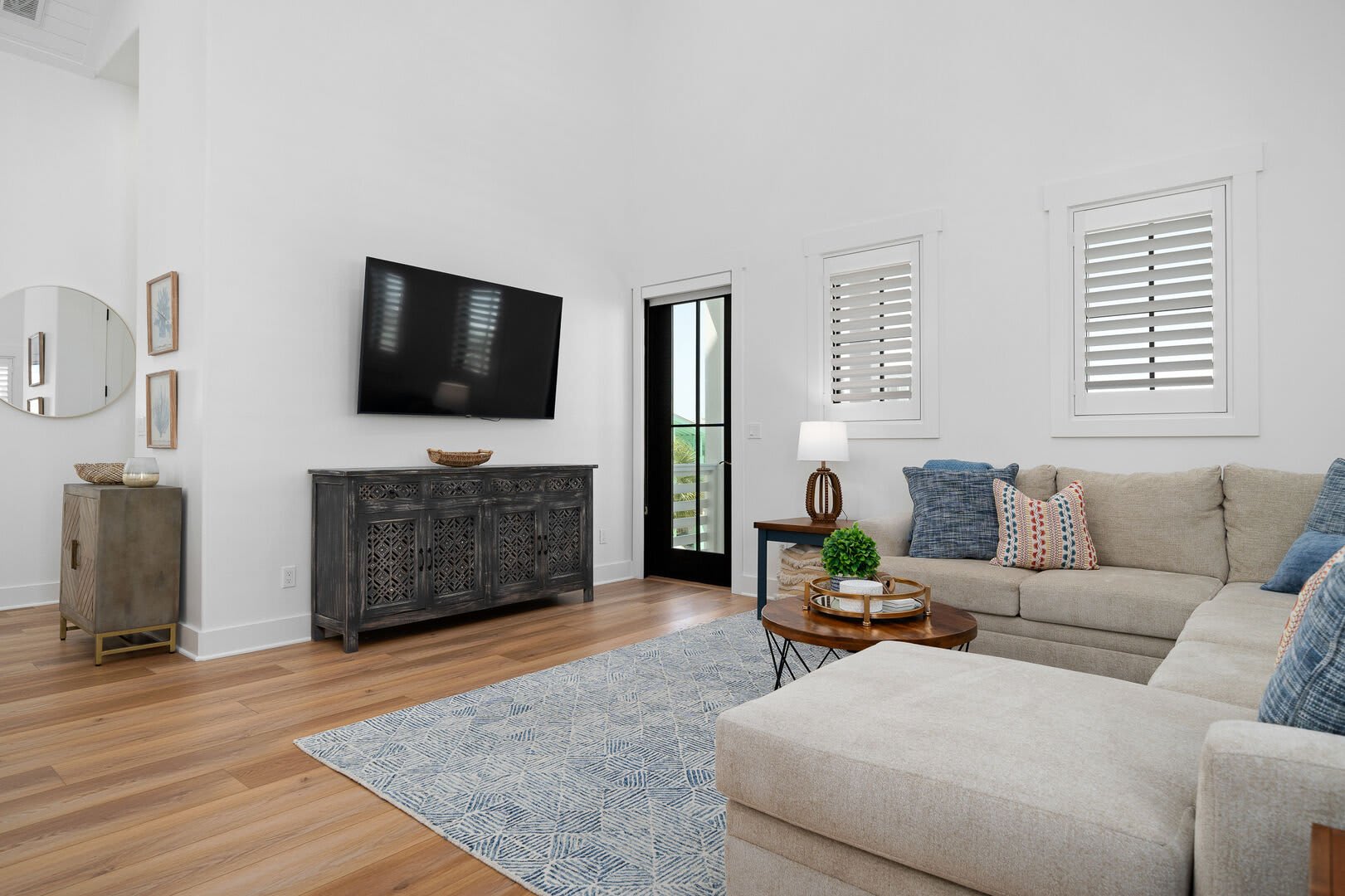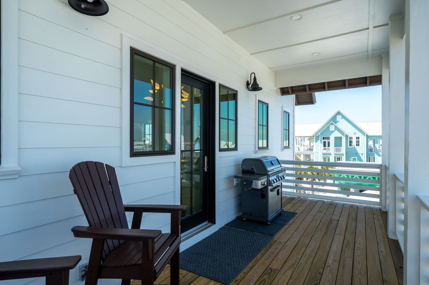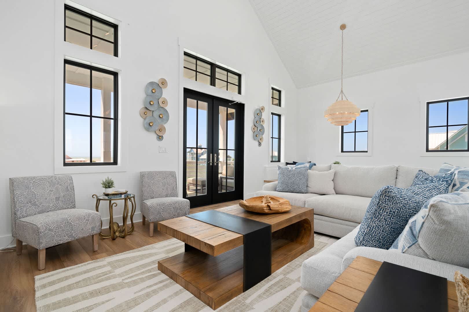 Living & Dining: The top floor houses a gourmet kitchen with high-end appliances, a massive island, and an 85” TV above a 72” fireplace. Enjoy sunrises and ocean views from the back balcony and sunsets from the courtyard balcony. An elevator will help move your groceries and guests to the 3rd floor.