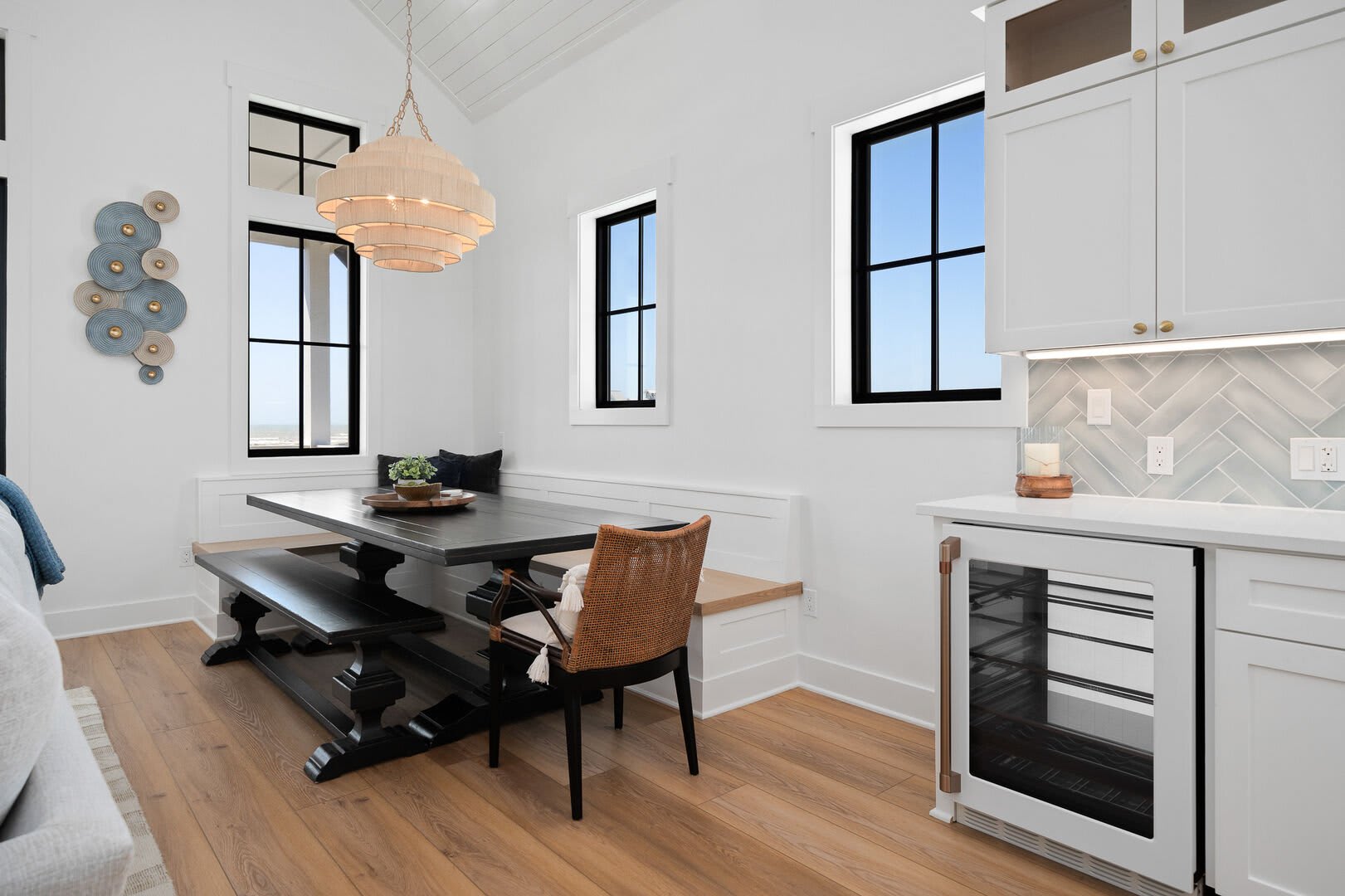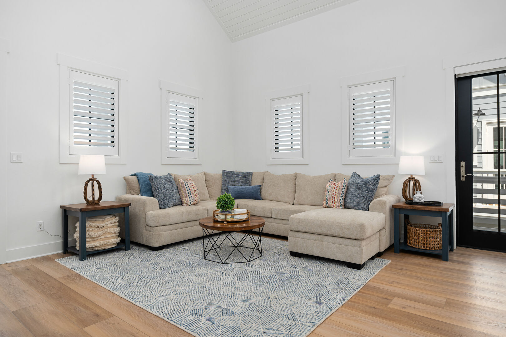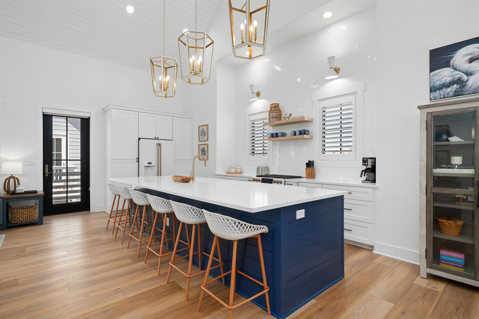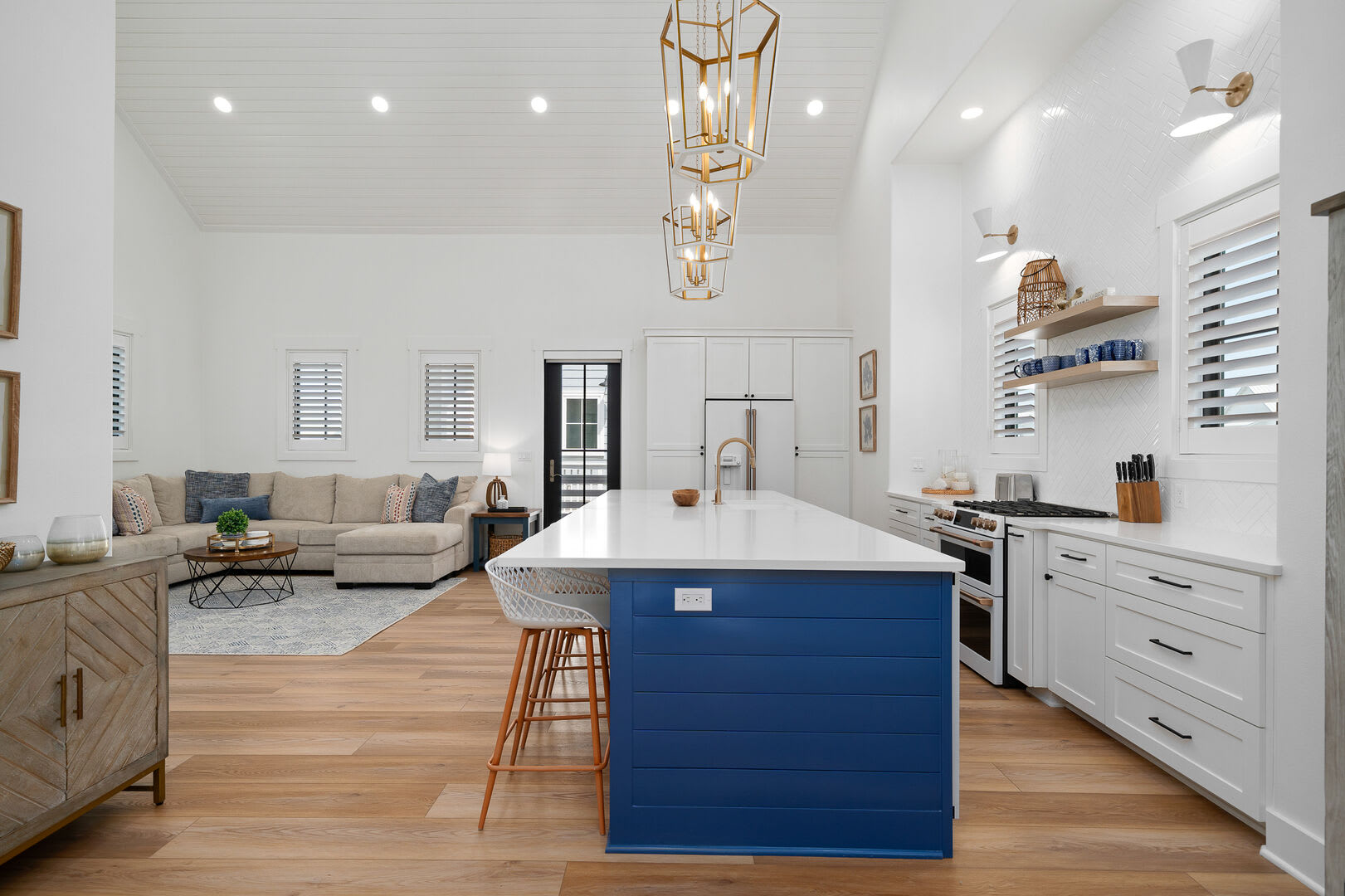 Living & Dining: The second floor also houses a beautiful living and kitchen area with a vaulted ceiling, a large island, and luxury appliances. A sleeper sofa in the living area can accommodate two additional guests.