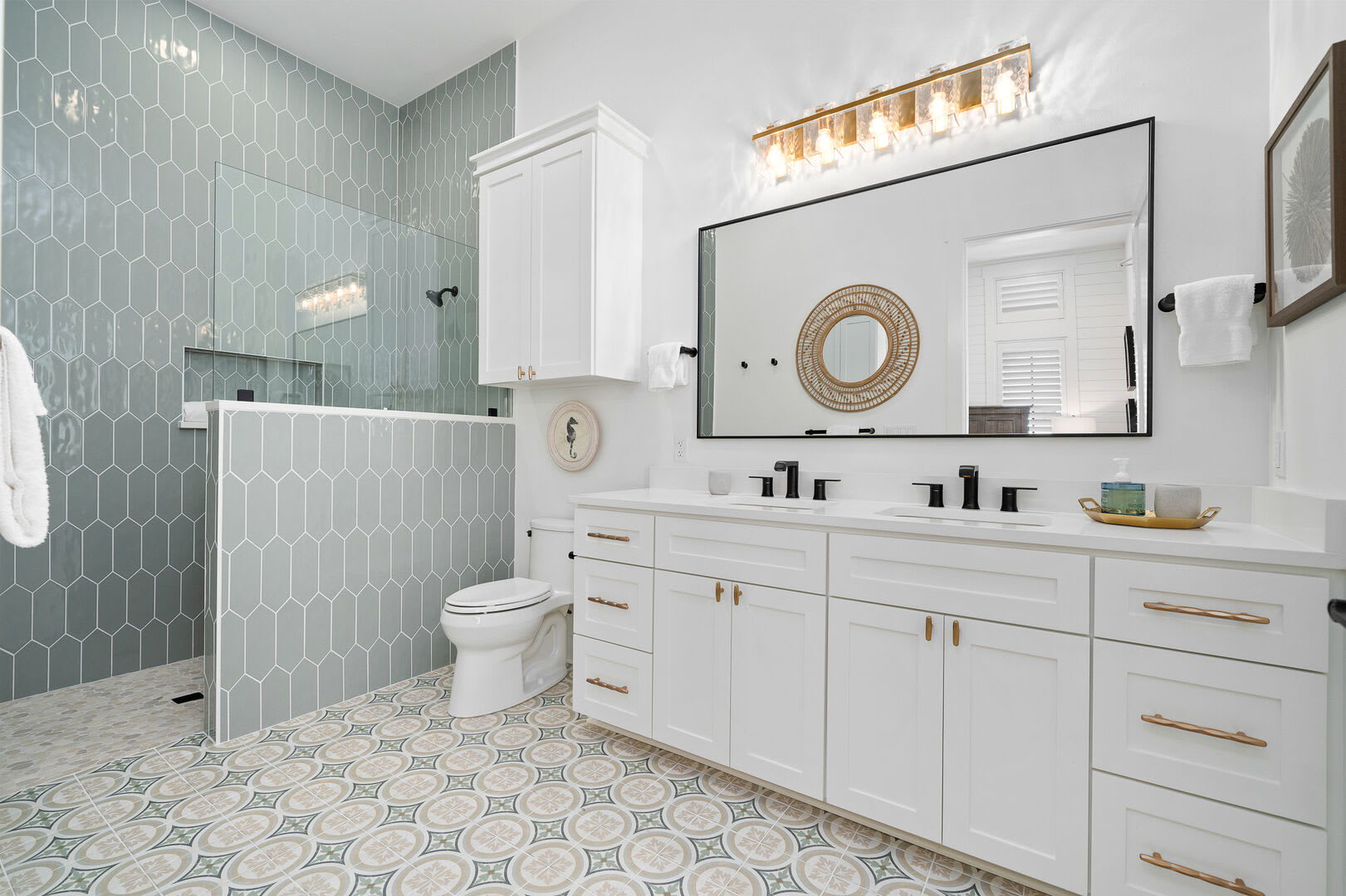 Bedrooms & Bathrooms: The main 3-story house features 5 bedrooms and 5.5 baths, including two primary suites with king-size beds and private balconies offering breathtaking ocean and dune views. The oceanside suite boasts a 7’ x 8’ walk-in shower room with two shower heads and a large soaking tub, while the poolside suite includes a luxurious walk-in shower.