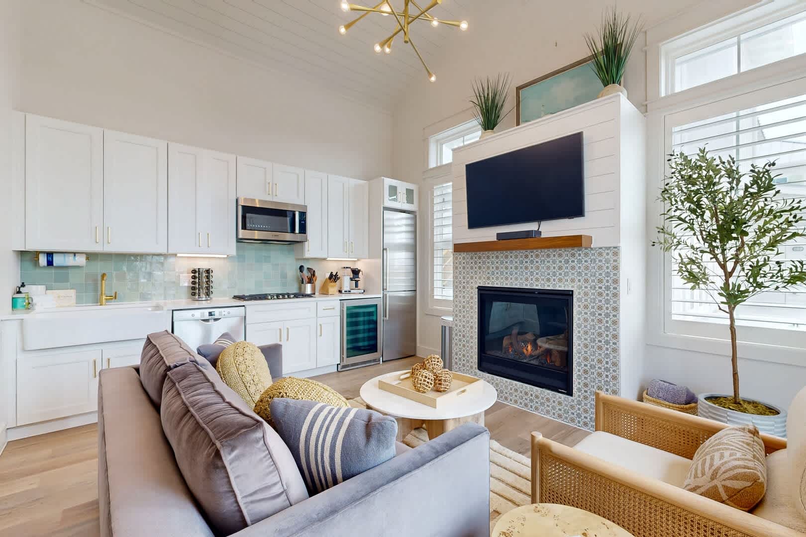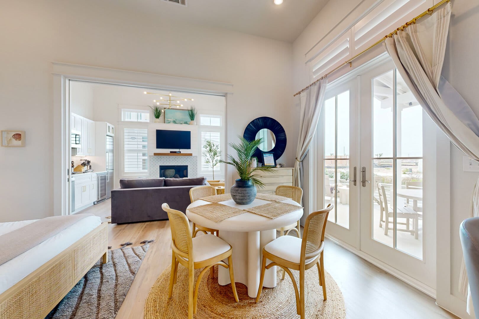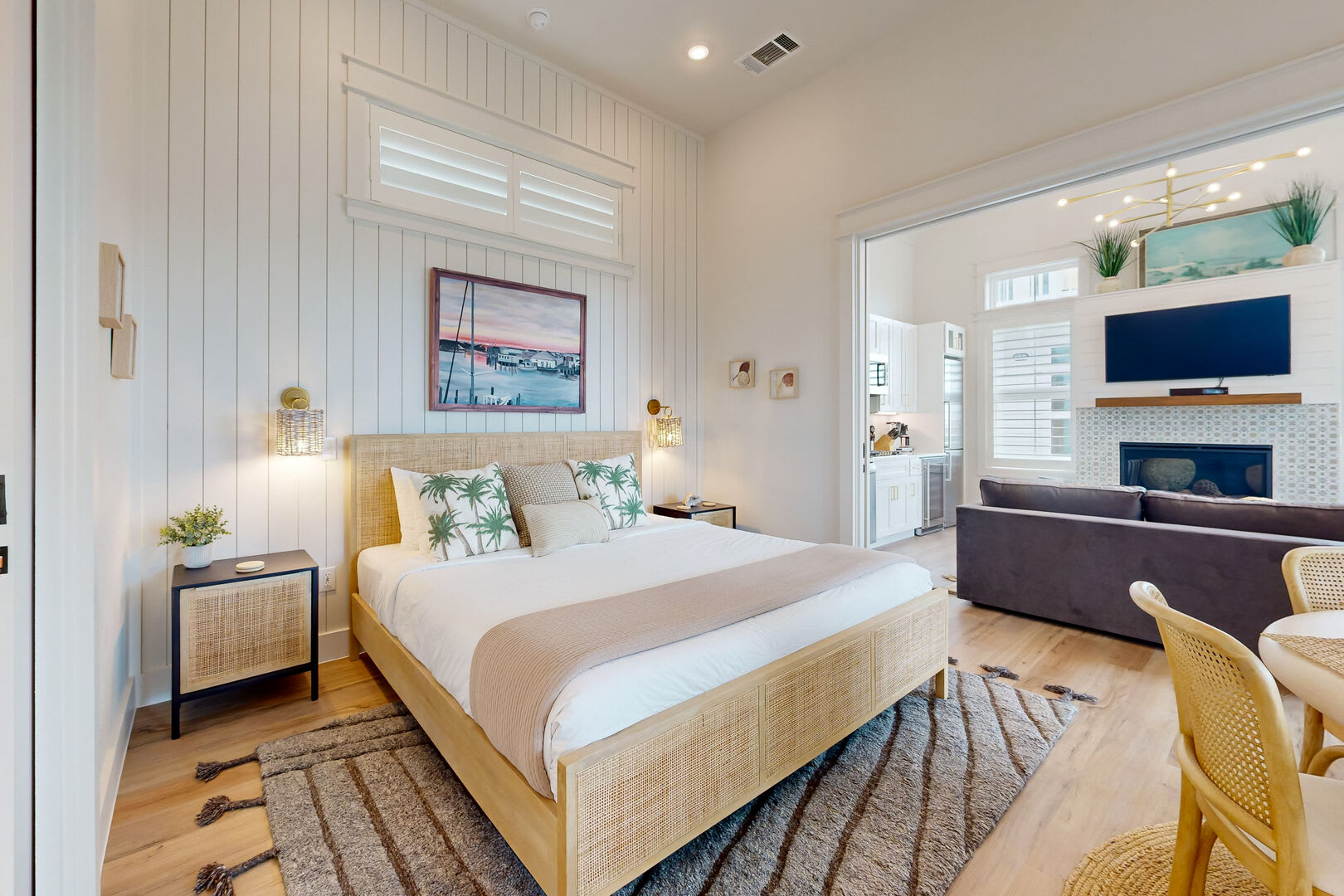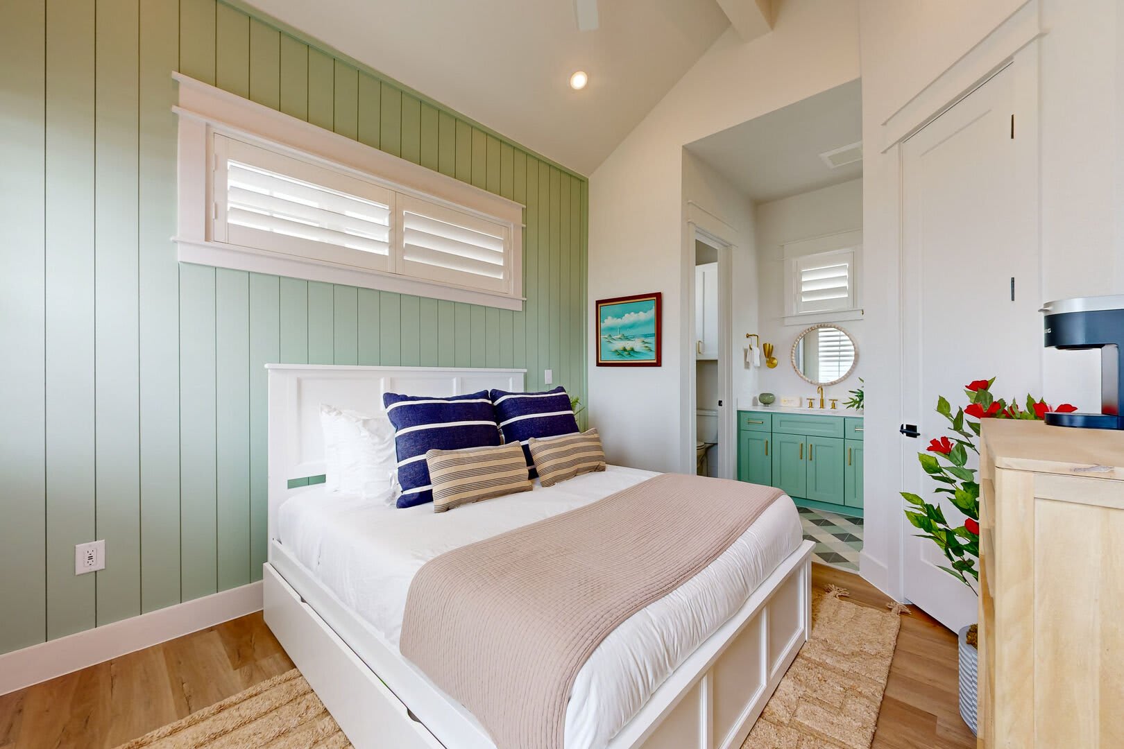 Step inside to discover a coastal oasis adorned with a soothing Seafoam finish, accented by elegant gold hardware and rattan furniture. Driftwood floors and plantation shutters exude beachside elegance, complemented by an array of eclectic coastal artwork. The bright white kitchen with quartz countertops, artisan green tile backsplash, and Bosch appliances, is fully stocked with everything you need for your stay, including a Vitamix blender and Moccasmaster coffee maker. Relax in the inviting living room with a queen-size pullout sofa, where vaulted shiplap ceilings and a cozy gas fireplace create the perfect ambiance for movie nights, enjoyed on the Frame TV. Sliding doors and blackout drapery seamlessly close off the primary suite from the living room and patio, offering privacy and tranquility when desired. Multiple dining areas provide versatility for indoor and outdoor gatherings, while the private patio and yard offer breathtaking sunset views from Adirondack chairs.