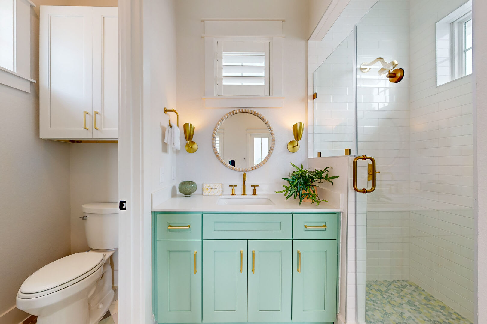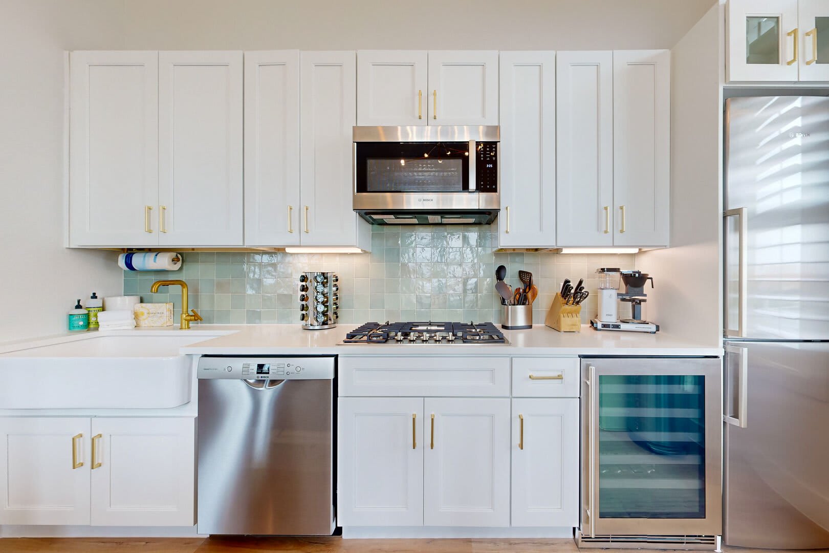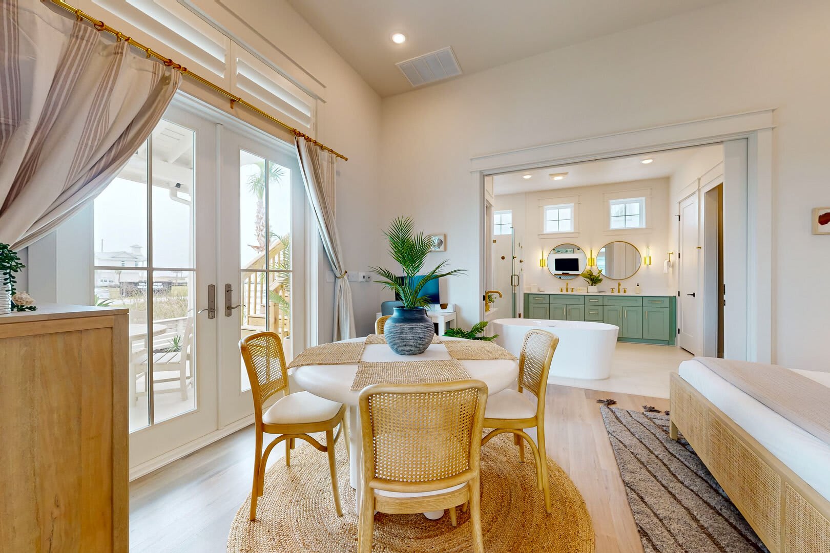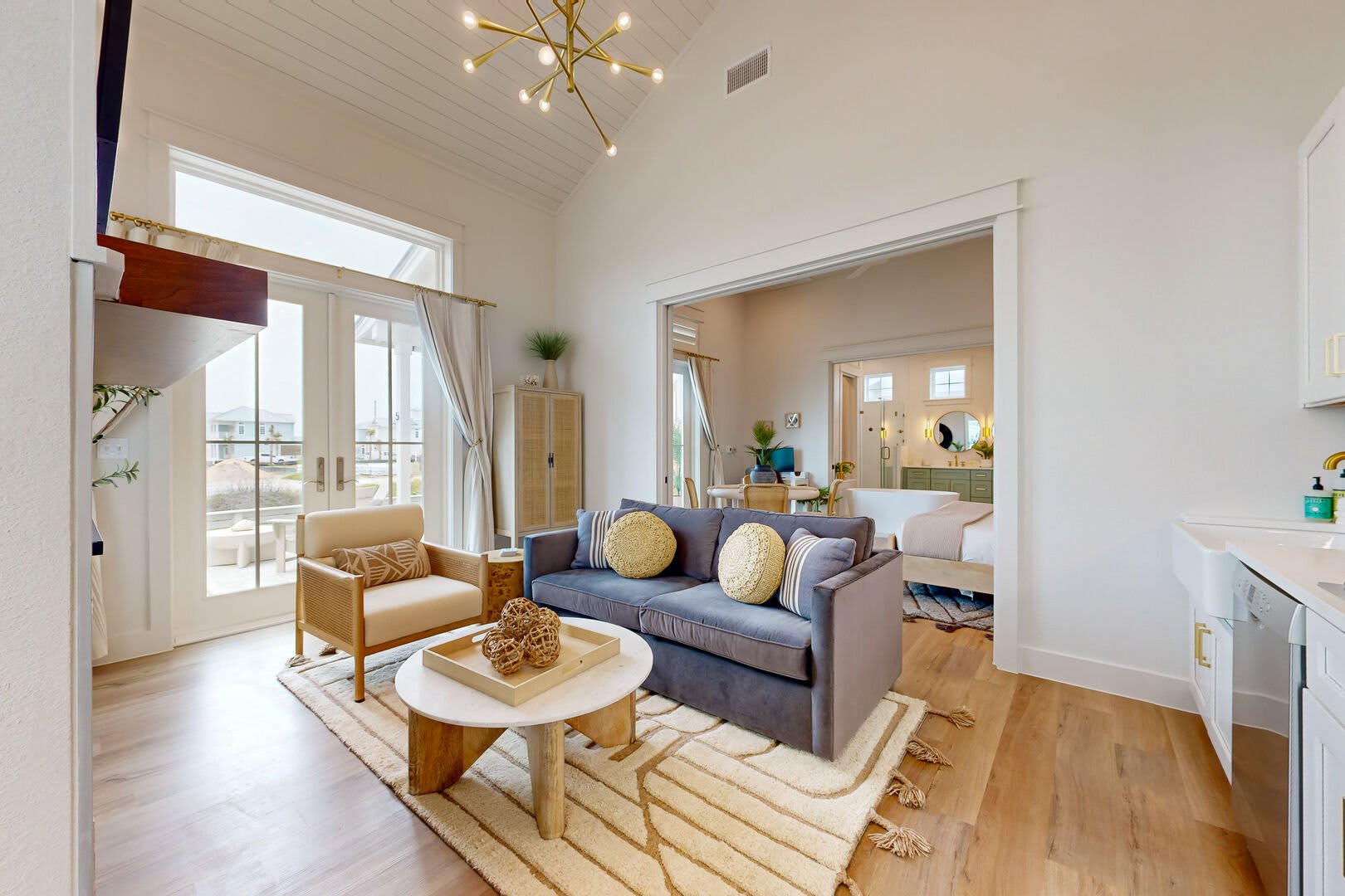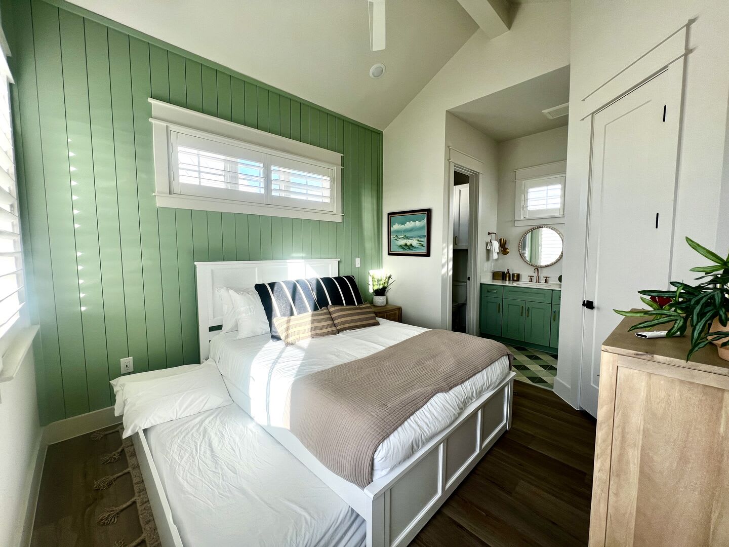 Step inside to discover a coastal oasis adorned with a soothing Seafoam finish, accented by elegant gold hardware and rattan furniture. Driftwood floors and plantation shutters exude beachside elegance, complemented by an array of eclectic coastal artwork. The bright white kitchen with quartz countertops, artisan green tile backsplash, and Bosch appliances, is fully stocked with everything you need for your stay, including a Vitamix blender and Moccasmaster coffee maker. Relax in the inviting living room with a queen-size pullout sofa, where vaulted shiplap ceilings and a cozy gas fireplace create the perfect ambiance for movie nights, enjoyed on the Frame TV. Sliding doors and blackout drapery seamlessly close off the primary suite from the living room and patio, offering privacy and tranquility when desired. Multiple dining areas provide versatility for indoor and outdoor gatherings, while the private patio and yard offer breathtaking sunset views from Adirondack chairs.